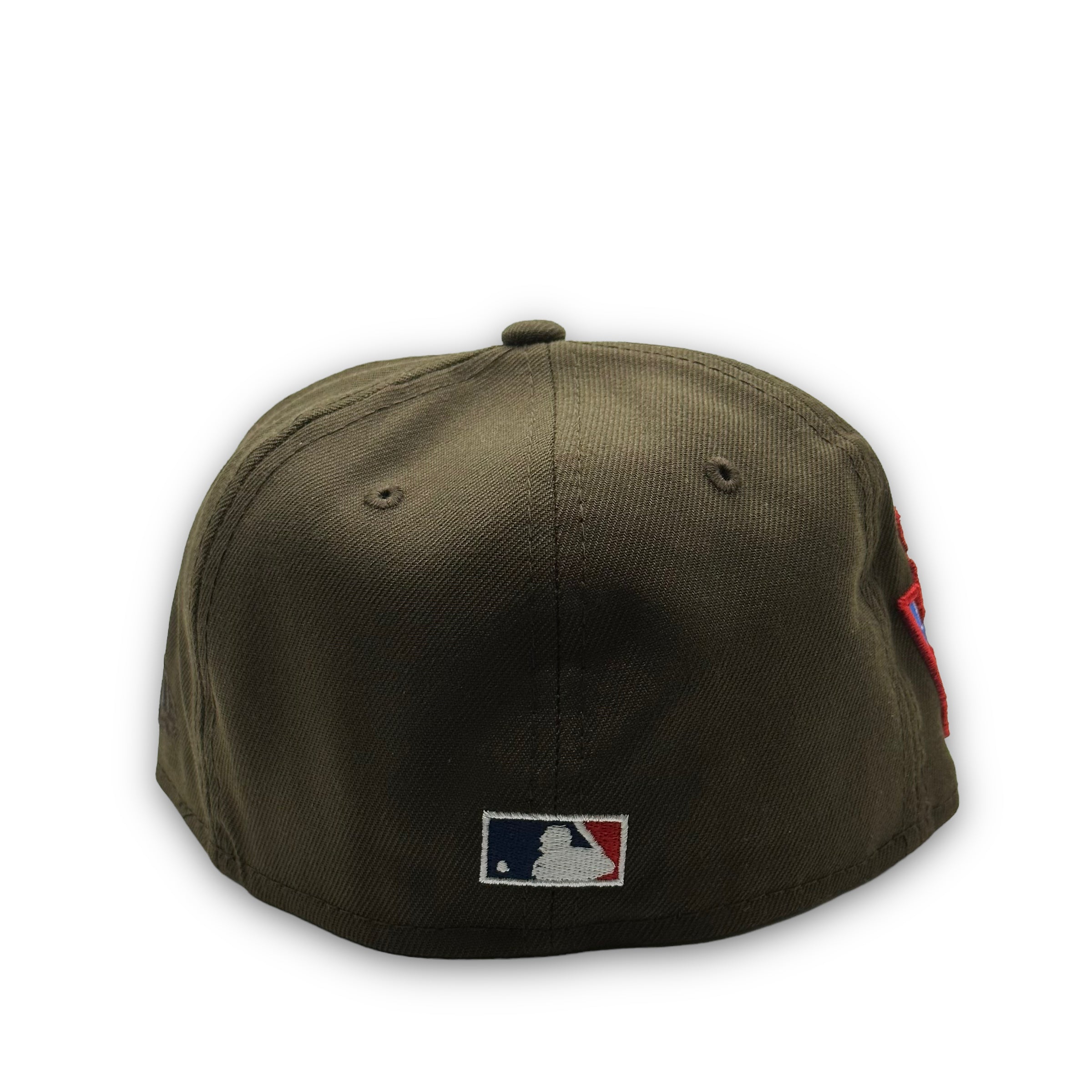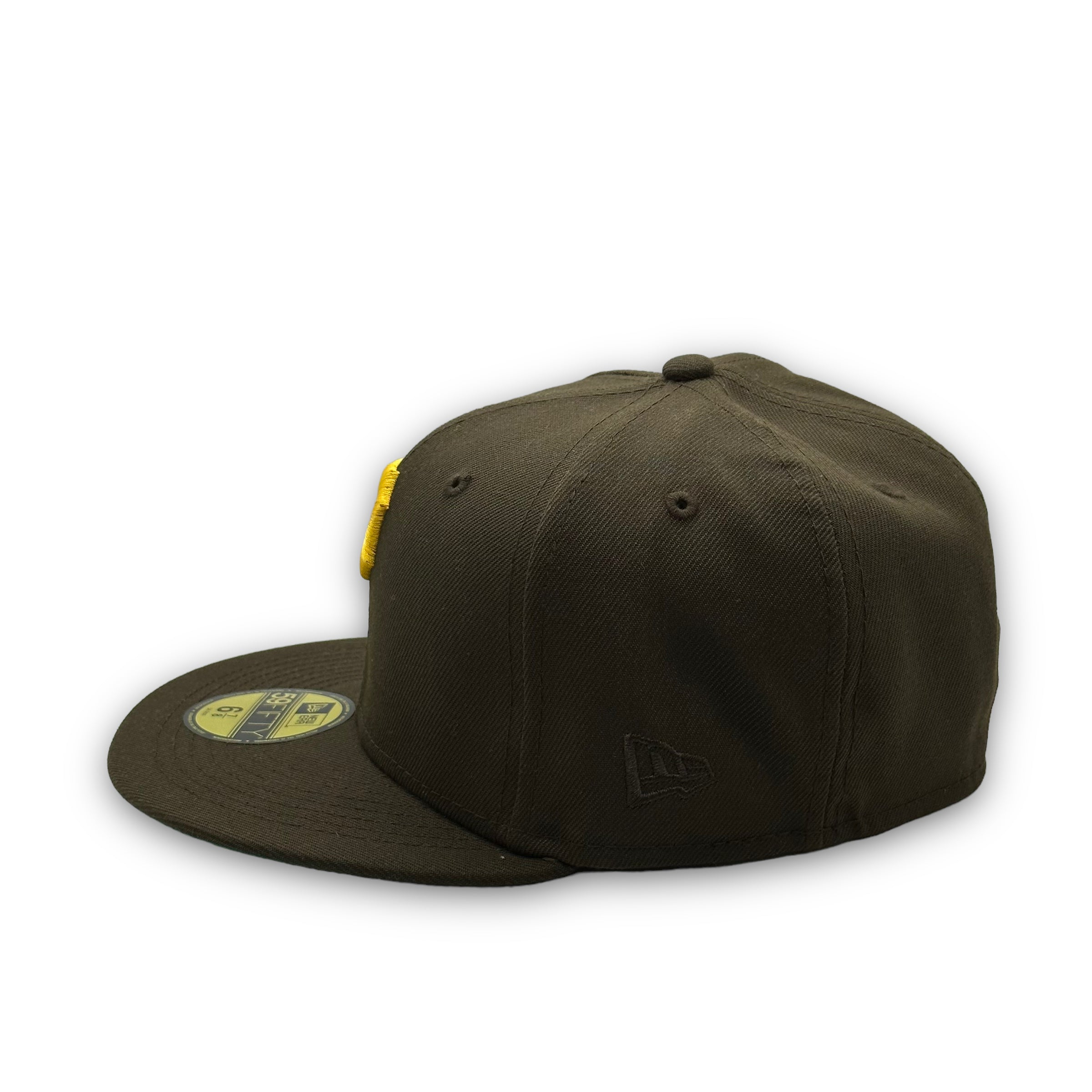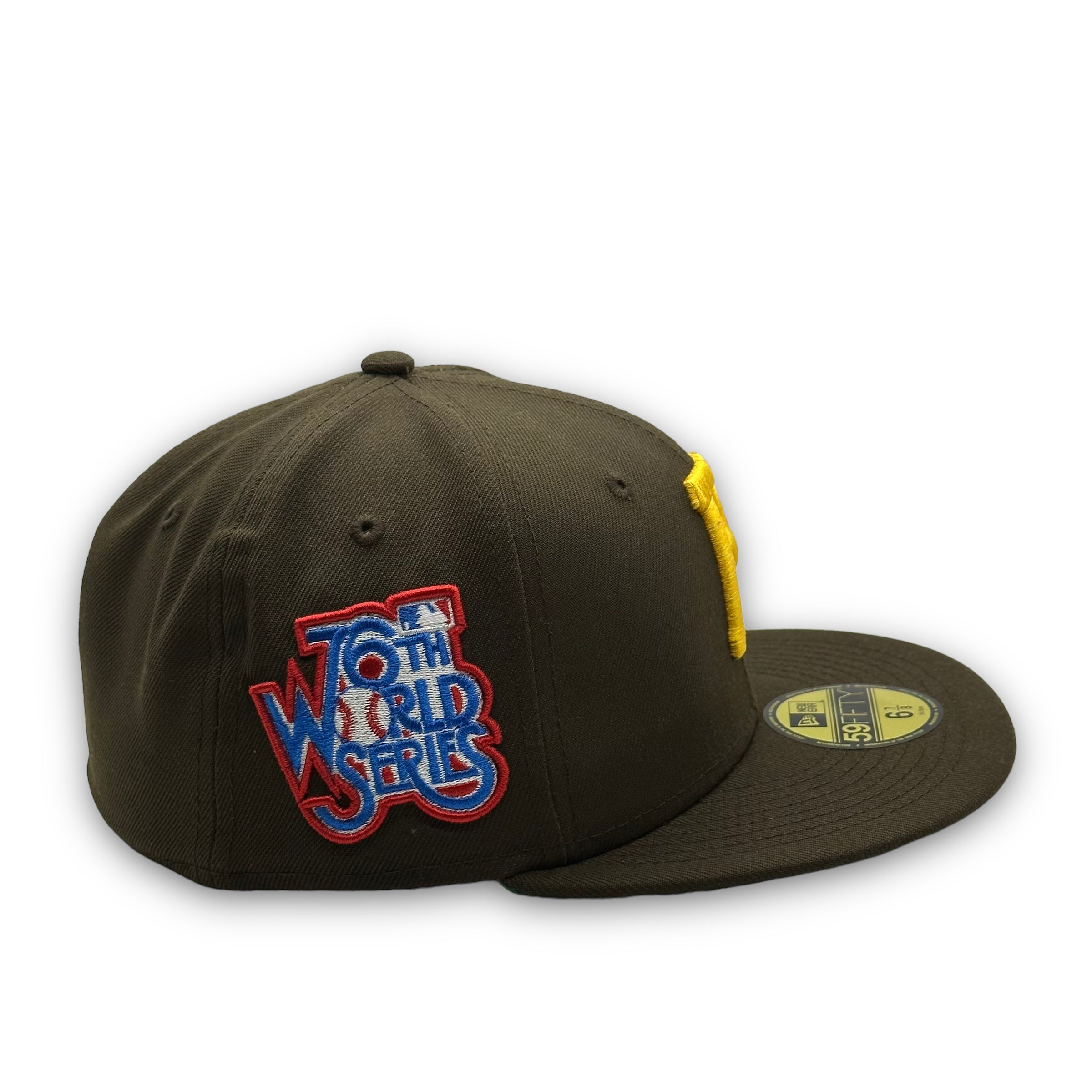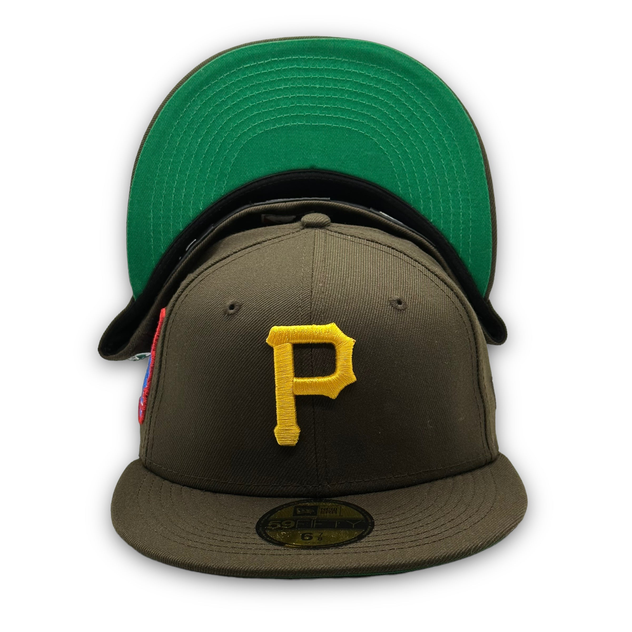This New Era Pittsburgh Pirates 76th World Series 'Kiwi Pack' 59FIFTY Fitted Hat was released by Burdeens Chicago. The fitted has a walnut brown six panel structured high crown, embroidered eyelets with and fabric squatchee button. The flat bill of the fitted cap is also walnut brown with a green bottom undervisor. The front panel features the Pittsburgh Pirates logo embroidery and a side patch embroidered on the right panel. The left panel of the fitted displays the New Era logo and the official Pittsburgh Pirates script embroidered on the rear crown.