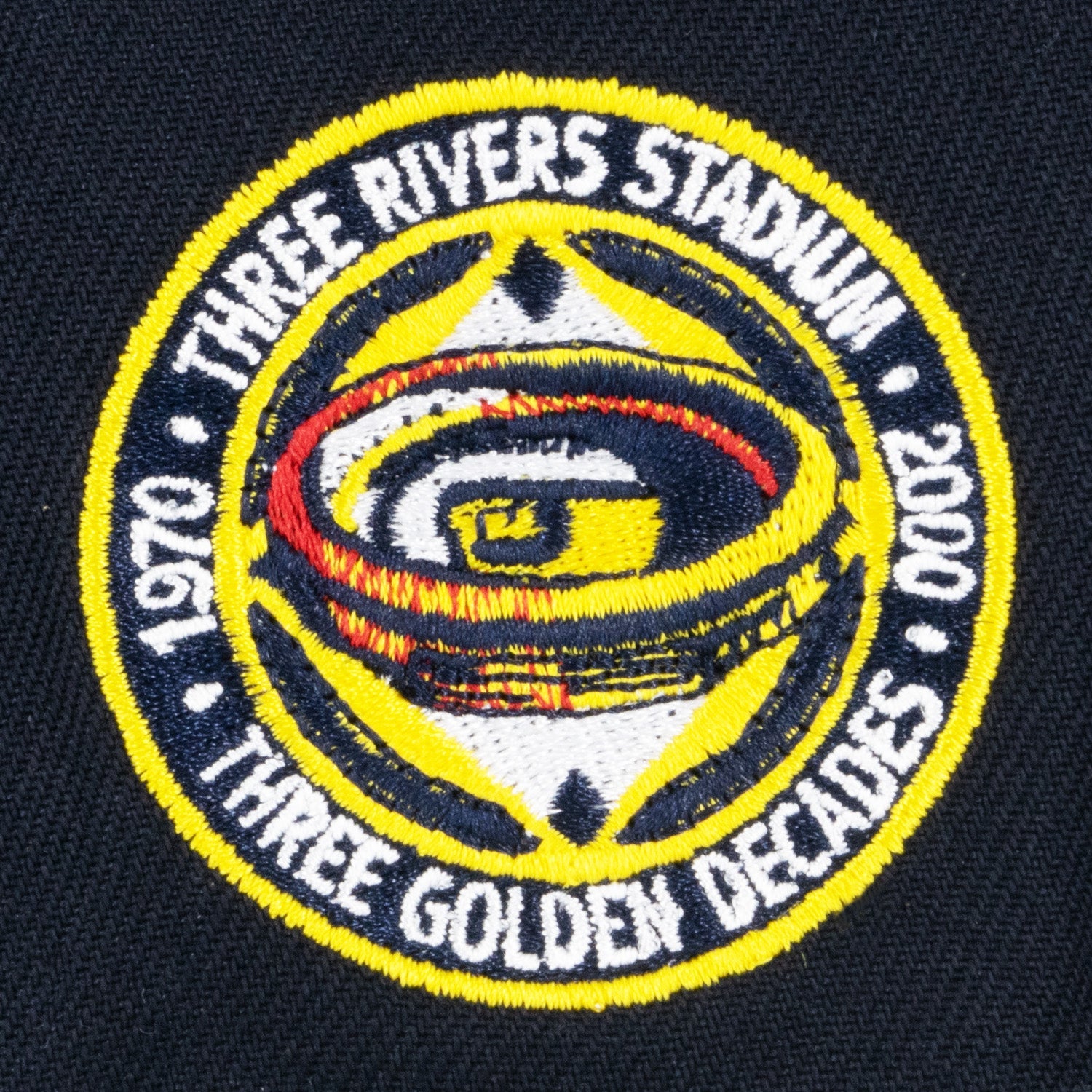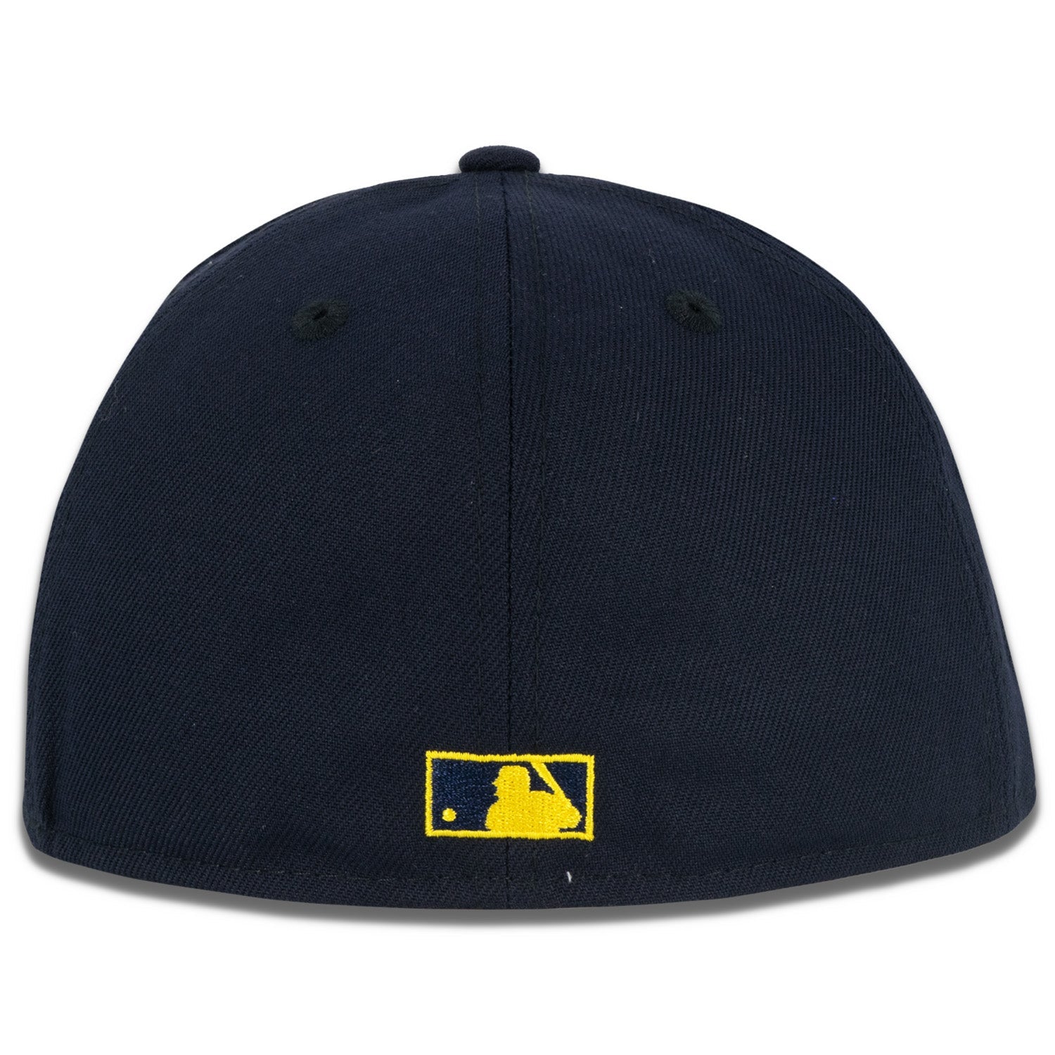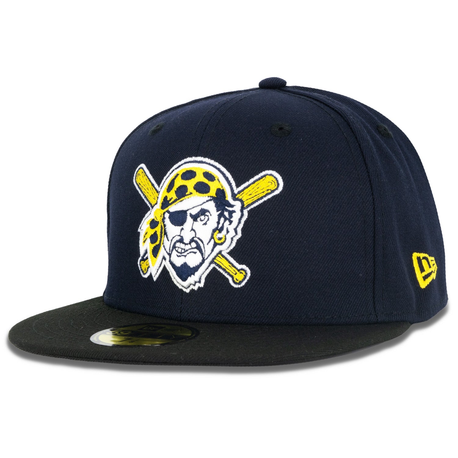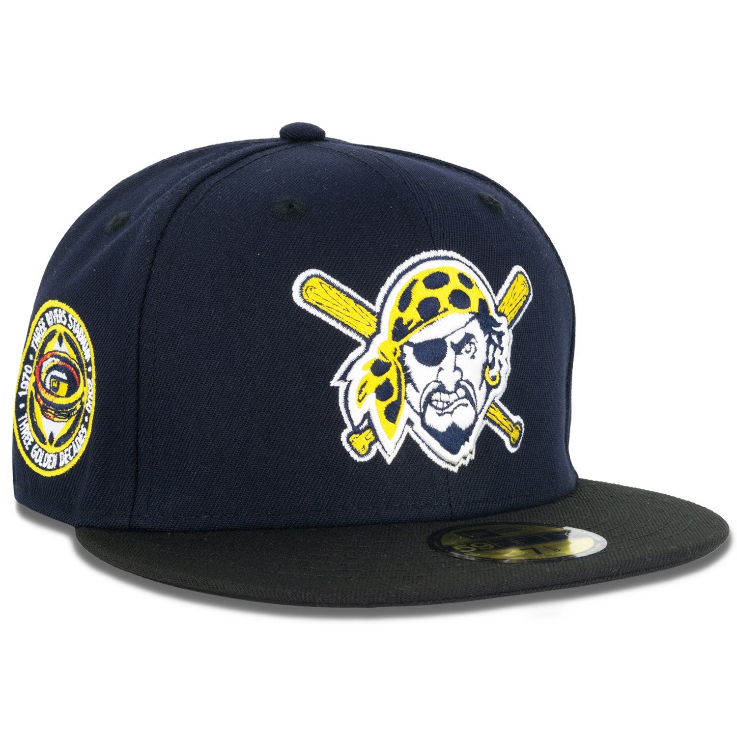 This New Era Pittsburgh Pirates Lightning 59FIFTY Fitted Hat was released by Just Sports. The fitted cap has a navy blue six panel structured high crown, embroidered eyelets and fabric squatchee button. The fitted cap also has a black flat bill. The front panel includes the Pittsburgh Pirates logo embroidered in white. yellow and navy blue stitching with a side patch on the right-wear side. The left panel of the fitted displays the New Era logo and the official NFL logo embroidery on the rear crown.