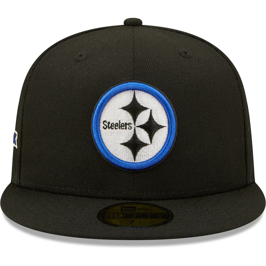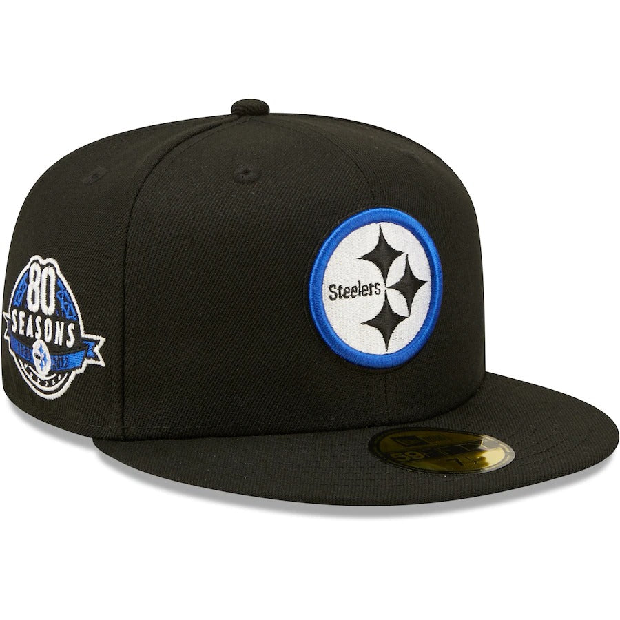 Pay a nod to your favorites by grabbing this Pittsburgh Steelers 80 Seasons 59FIFTY fitted hat. It features an eye-catching graphic on the crown that calls attention to your team's accolades and a fitted design that offers the right fit. Top any outfit off with this commemorative lid and leave no doubt about your devout Pittsburgh Steelers fandom.
