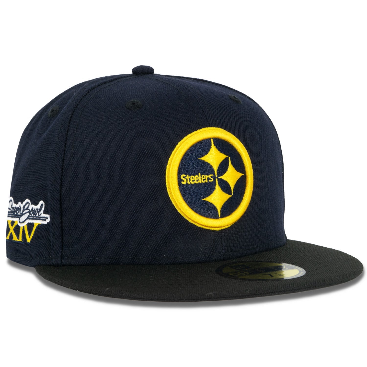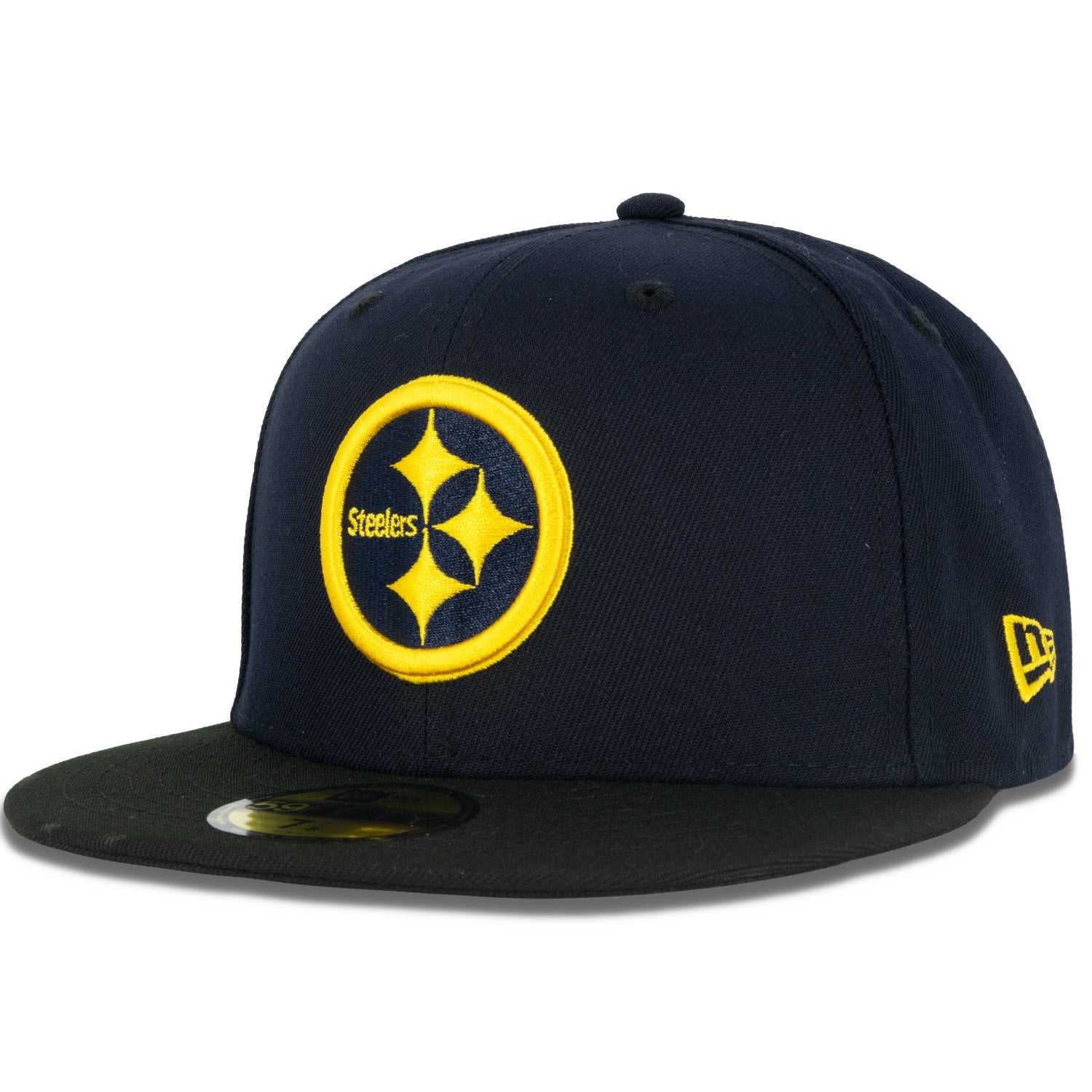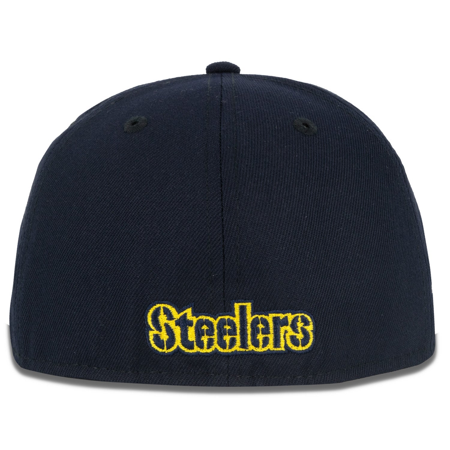 This New Era Pittsburgh Steelers Lightning 59FIFTY Fitted Hat was released by Just Sports. The fitted cap has a navy blue six panel structured high crown, embroidered eyelets and fabric squatchee button. The fitted cap also has a black flat bill. The front panel includes the Pittsburgh Steelers logo embroidered in white. yellow and navy blue stitching with a side patch on the right-wear side. The left panel of the fitted displays the New Era logo and the official NFL logo embroidery on the rear crown.