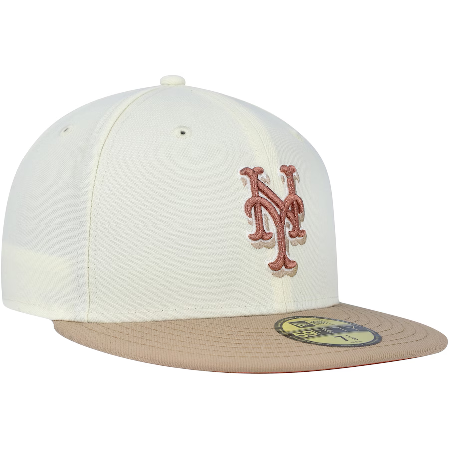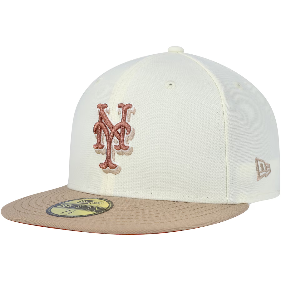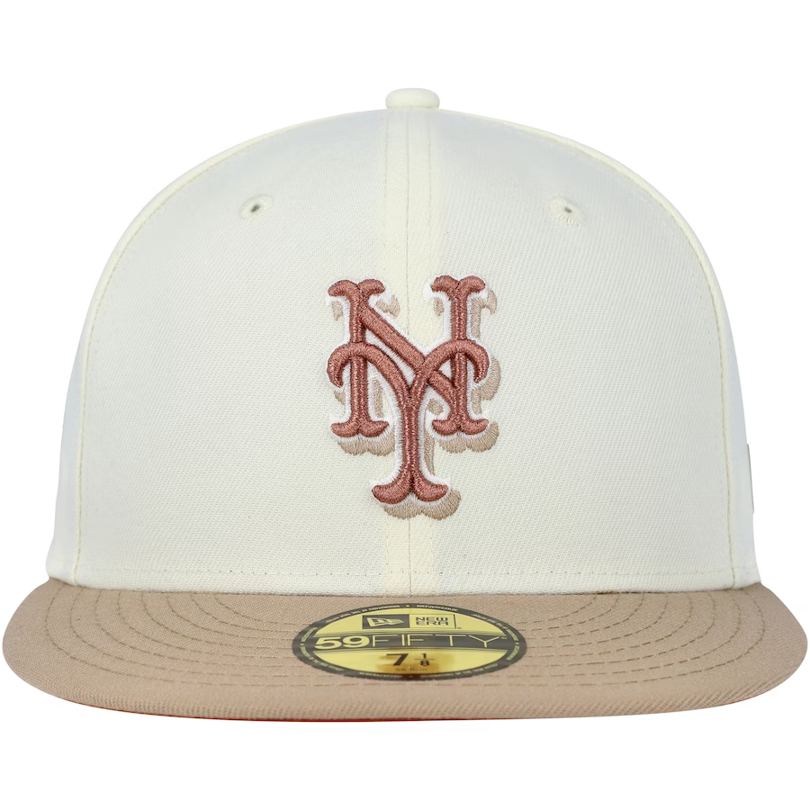 Complete your New York Mets ensemble with this sleek Chrome Camel 59FIFTY hat by New Era. Showcasing striking team graphics and a contrasting rust orange undervisor, this hat offers an extra touch of style. With its fitted design, it's the ideal accessory to complement any outfit.