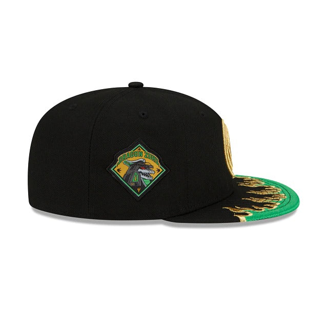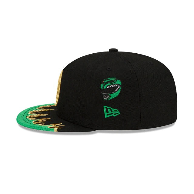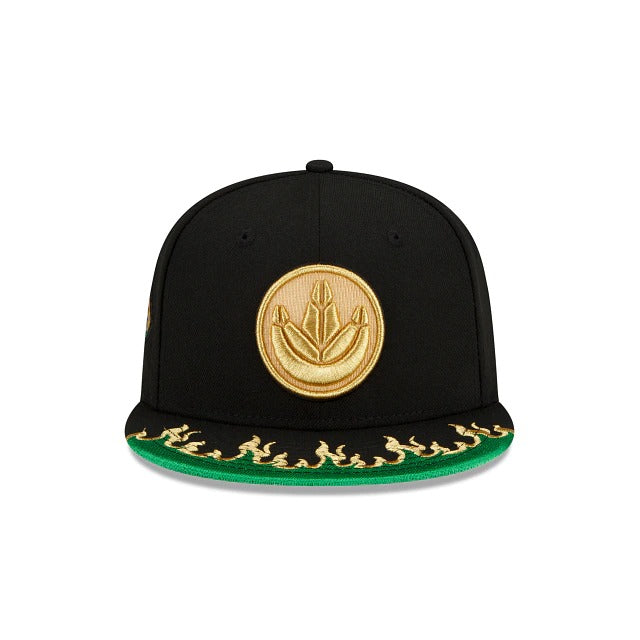 It's Morphin' Time! The Drangonzord Power Rangers 59FIFTY Fitted Cap features the Dragonzord emblem at the front panels with a Dragonzord patch at the right-wear side and a green flame detailing on the front of the brim. Additional details include the Green Power Ranger at the left-wear side.