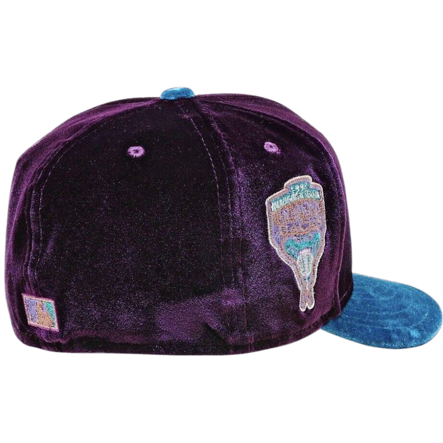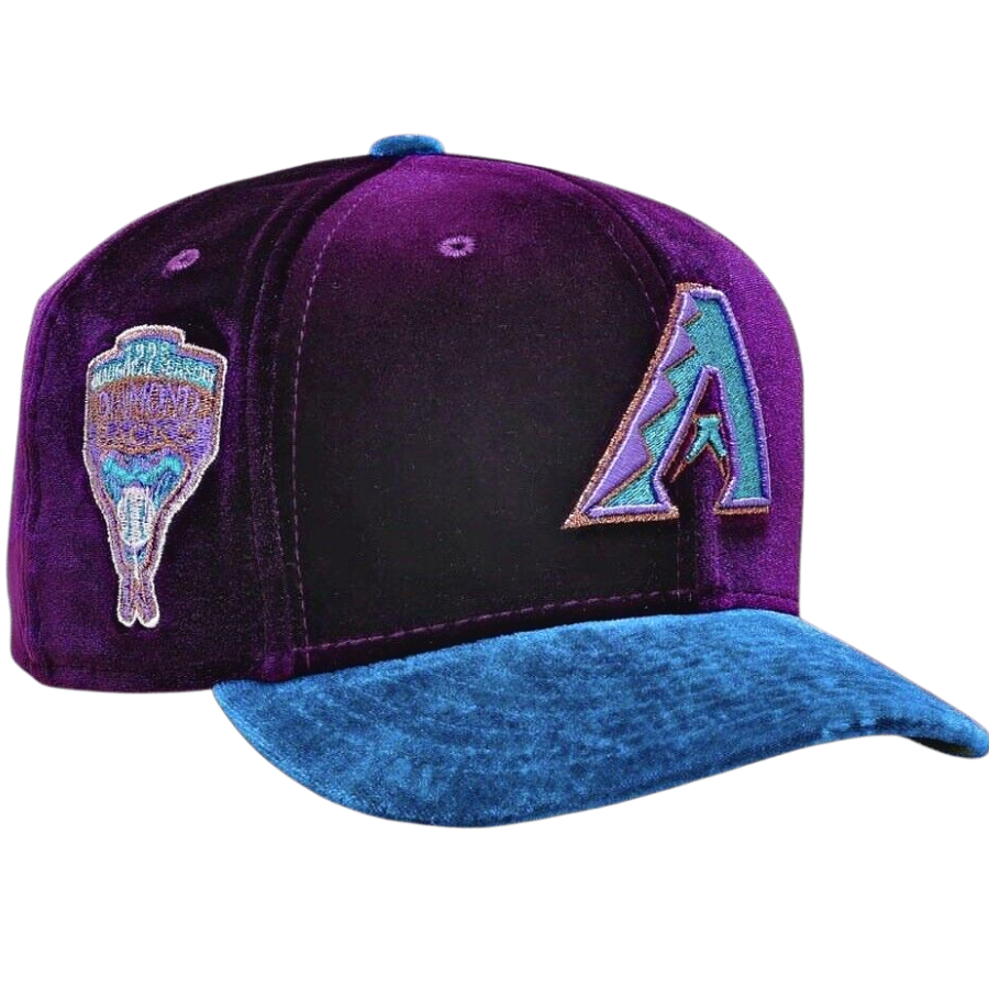 This New Era Arizona Diamondbacks Royal Velvet Purple 59FIFTY Fitted Hat was released by My Fitteds. The fitted has a purple velvet six panel structured high crown and eyelets with a royal blue squatchee button. The fitted cap also has a royal blue flat bill. The front panel includes the Arizona Diamondbacks logo embroidery with a side patch on the right-wear side.
