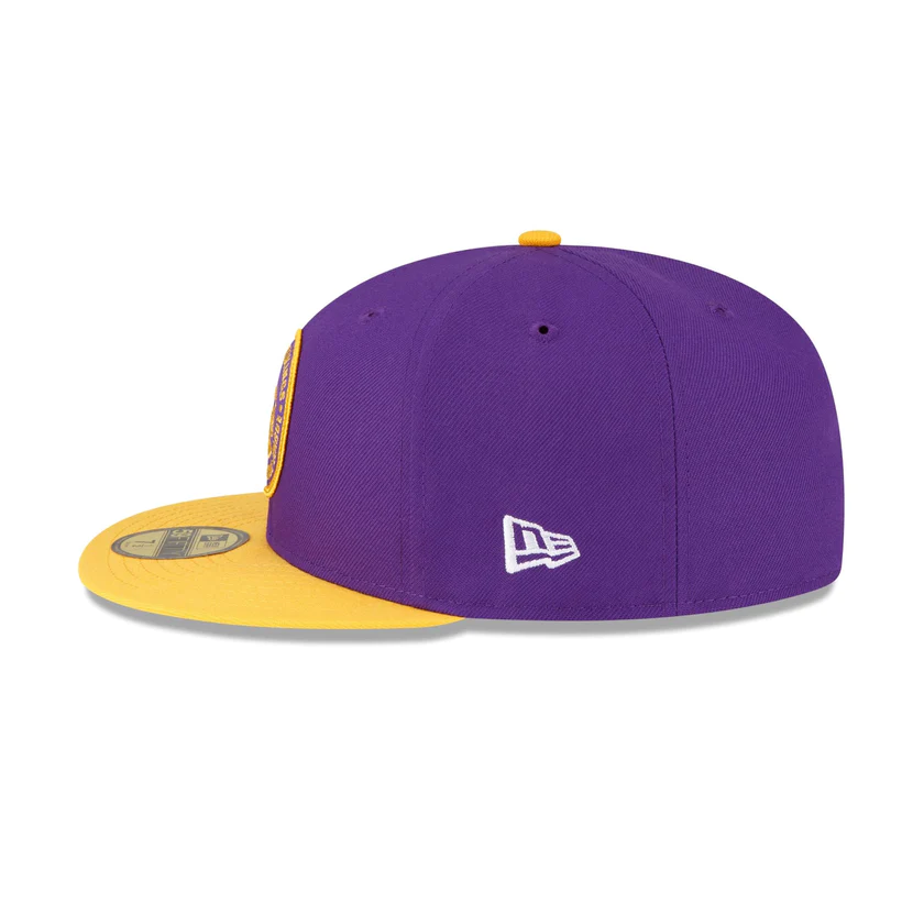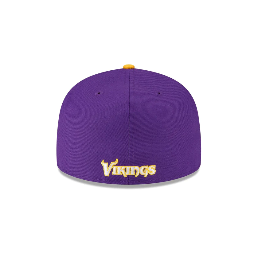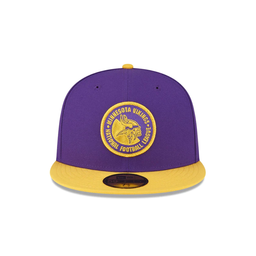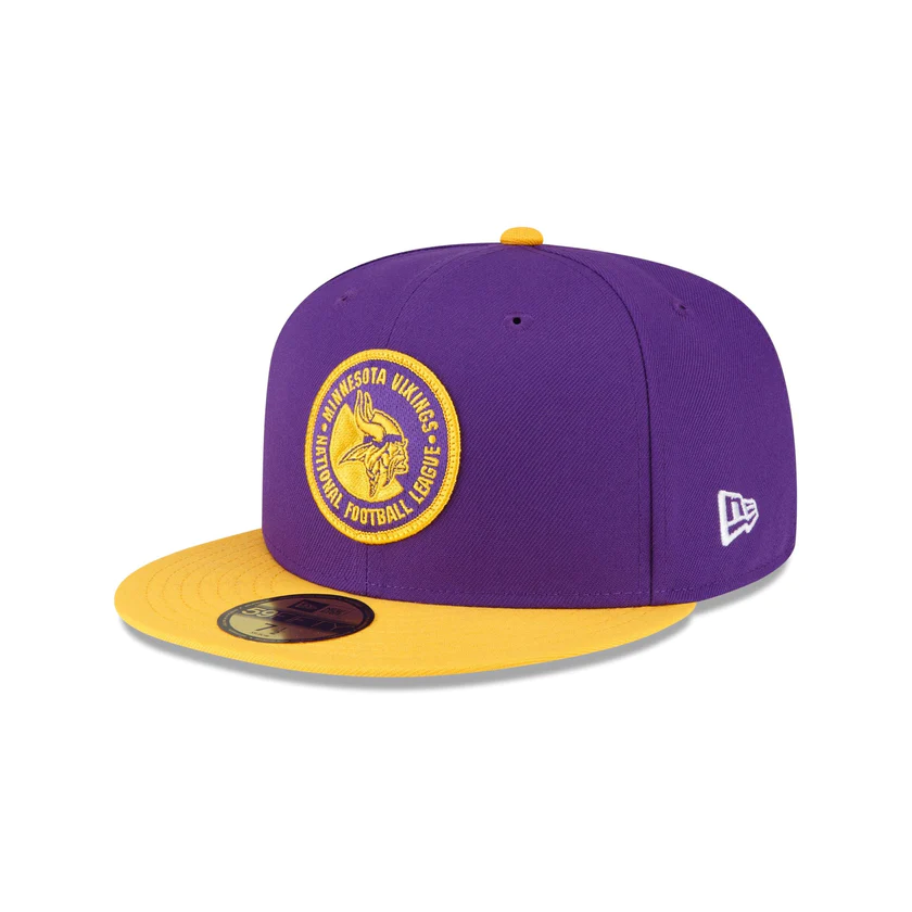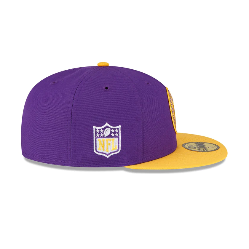 The Minnesota Vikings 2023 Sideline Team Patch 59FIFTY Fitted Cap features an embroidered Minnesota Vikings patch at the front panels with a matching NFL Shield at the right-wear side. Additional details include a team wordmark at the rear and a gray undervisor.