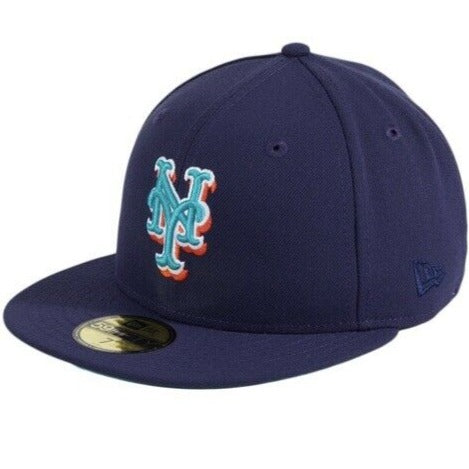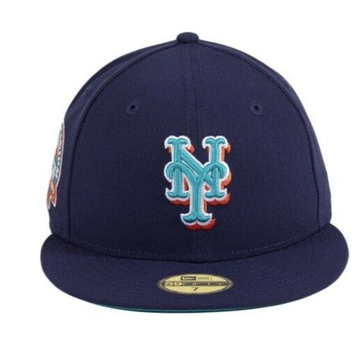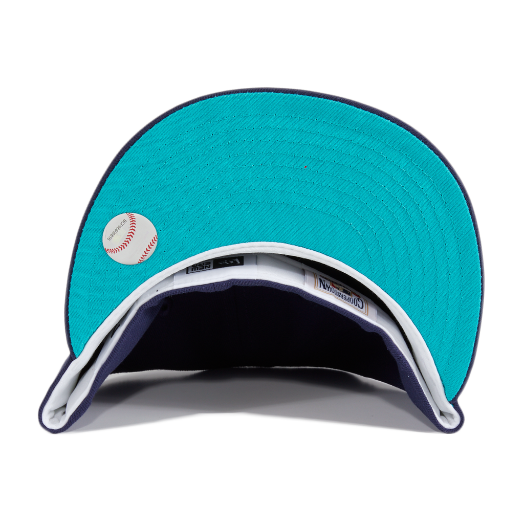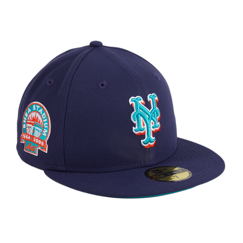 The New Era New York Mets Shea Stadium 59FIFTY fitted hat is a Hat Club exclusive from their Ice Cold Fashion collection. The fitted features a purple high crown, embroidered eyelets and flat bill with a teal undervisor. The right panel features a Shea Stadium side patch.