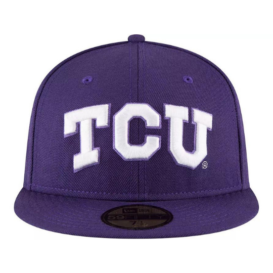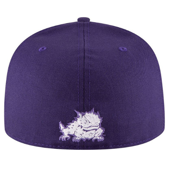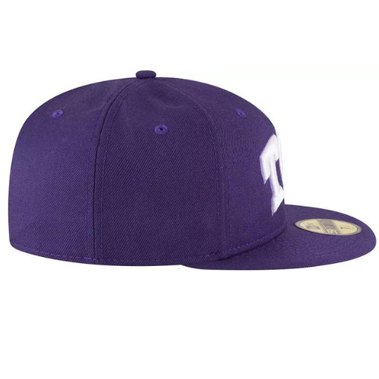 This New Era TCU Horned Frogs fitted hat has a purple and white colorway. The high crown, embroidered eyelets, fabric squatchee button and flat bill are purple in color. The front panel features Texas Christian University "TCU" logo embroidered in white thread. The back of the high crown features TCU Horned Frogs logomark embroidered in white thread. Great fitted hat for supporters of the TCU Horned Frogs team and/or students of Texas Christian University who also like the color purple.