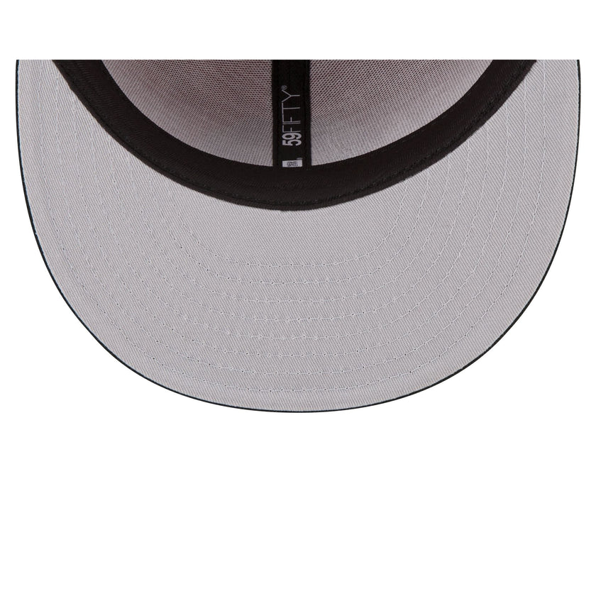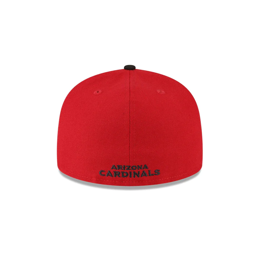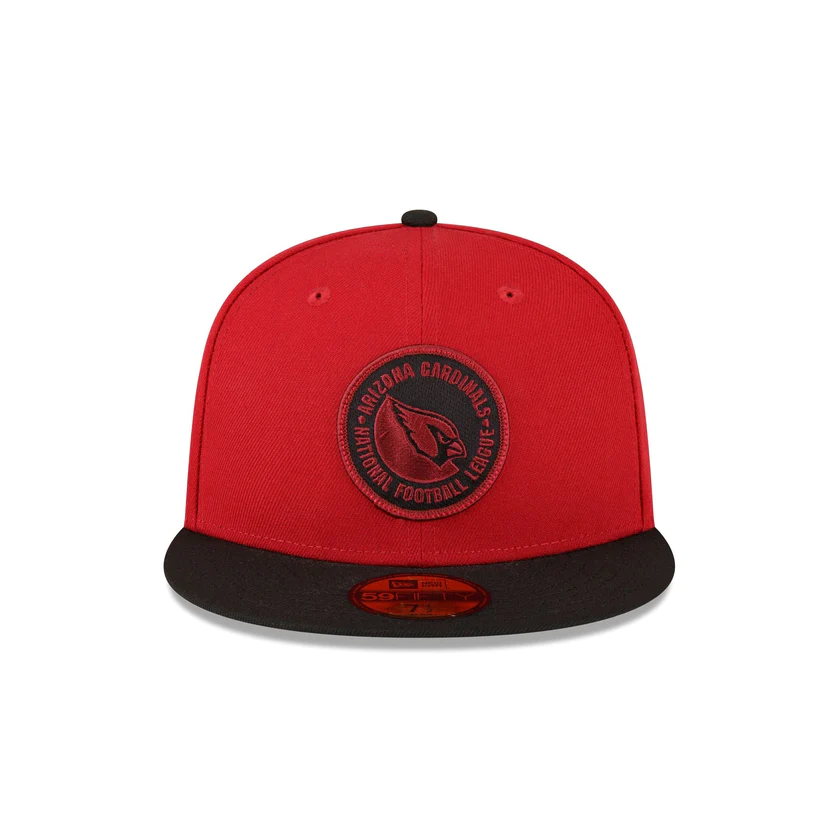 The Arizona Cardinals 2023 Sideline Team Patch 59FIFTY Fitted Cap features an embroidered Cardinals patch at the front panels with a matching NFL Shield at the right-wear side. Additional details include a team wordmark at the rear and a gray undervisor.