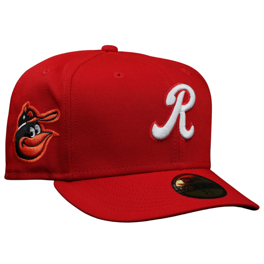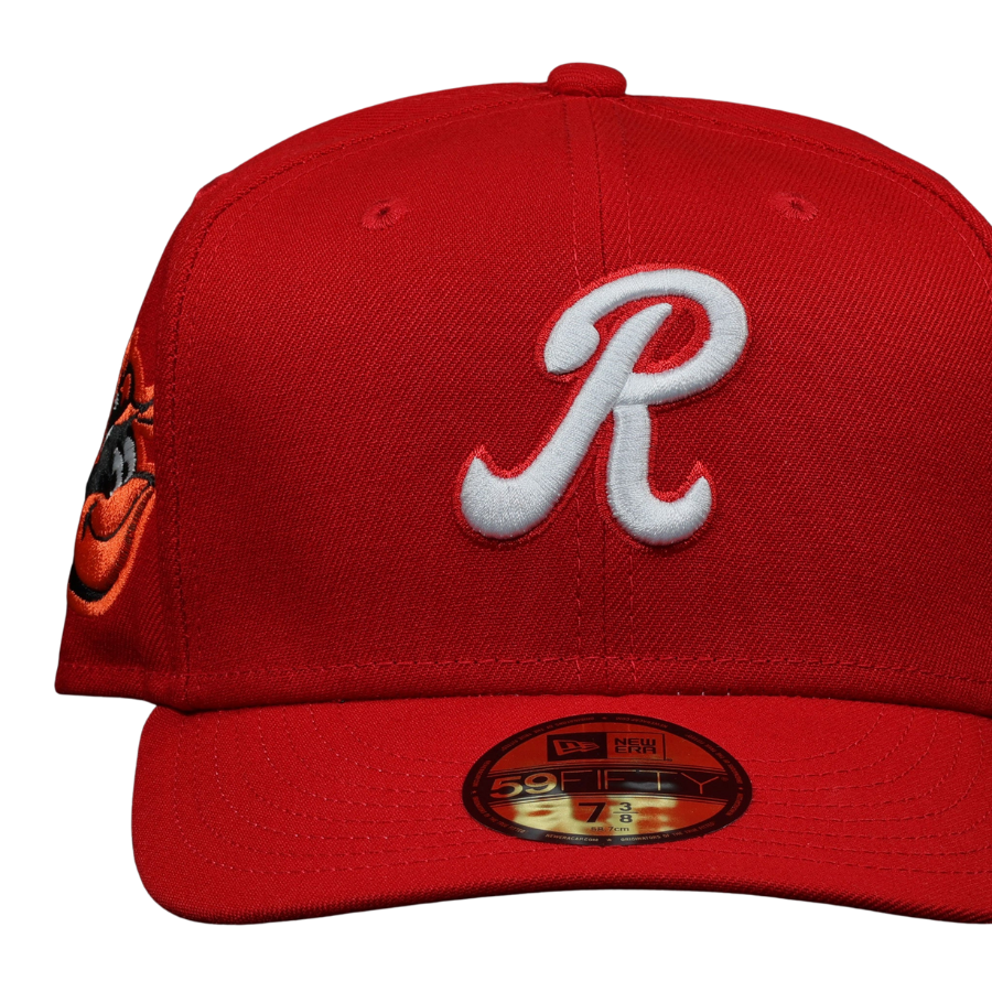 This Cal Ripken Jr. inspired 59FIFTY fitted hat was released by My Fitteds. The fitted has a red six panel structured high crown, embroidered eyelets, flat brim and fabric squatchee button. The fitted also has an green undervisor. The front panel features the Rochester Red Wings logo embroidery with a Baltimore Orioles logo side patch on the right panel. The left panel of the fitted displays the New Era logo and the official MiLB Batterman embroidery on the rear crown.