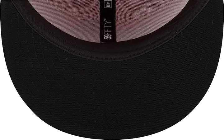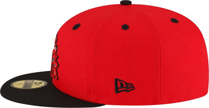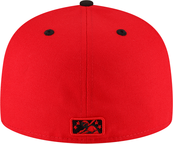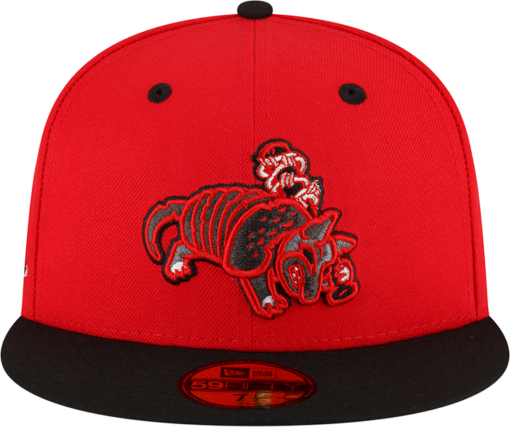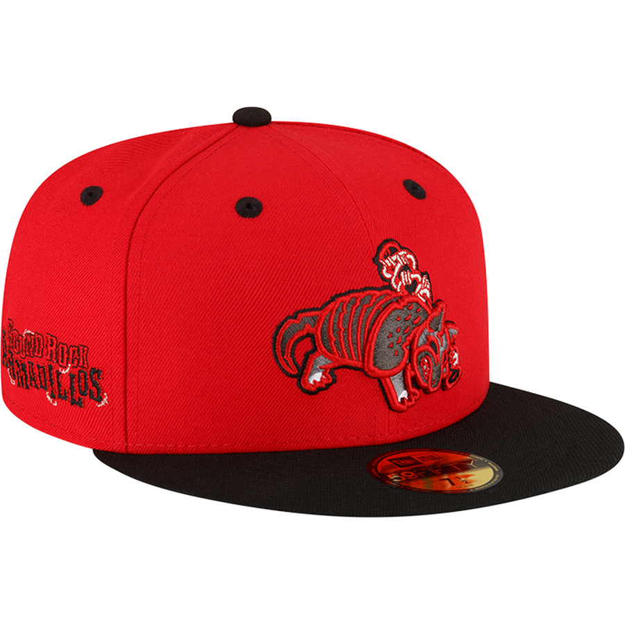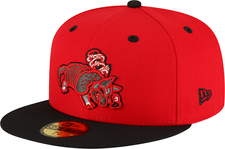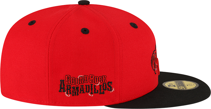 This Round Rock Express Red Armadillo has a red six panel structured high crown, black embroidered eyelets with a black fabric squatchee button. The fitted cap also has a black flat bill and undervisor. The front panel features the Round Rock Express Red Armadillo logo embroidery. The left panel of the fitted displays the New Era logo and the official MiLB Batterman logo embroidery on the rear crown.