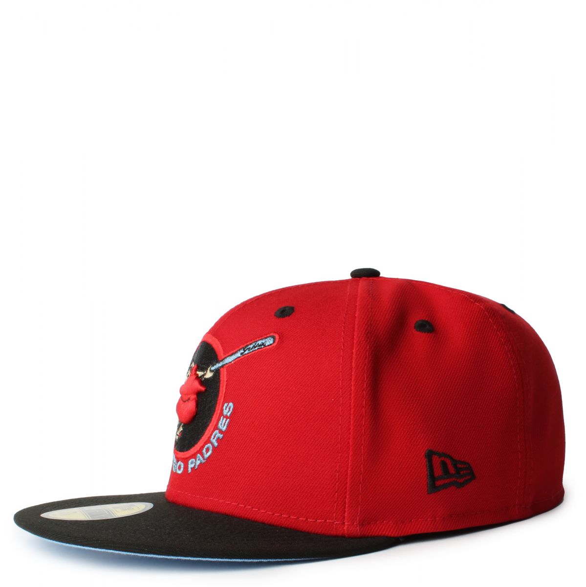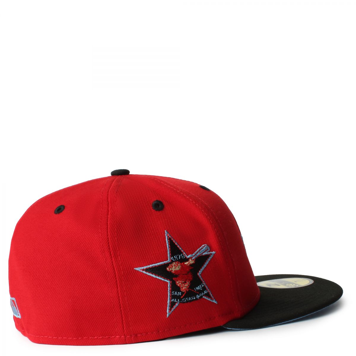 This San Diego Padres fitted hat was released by Karma Loop. The fitted has a red six panel structured high crown with black embroidered eyelets and fabric squatchee button. The fitted cap also has a black flat bill with a light blue undervisor and black sweatband. The front panel features the San Diego Padres Swinging Friar logo embroidery and a ASG side patch embroidery on the right panel. The left panel of the fitted displays the New Era logo and the official MLB batterman logo embroidery on the rear crown.