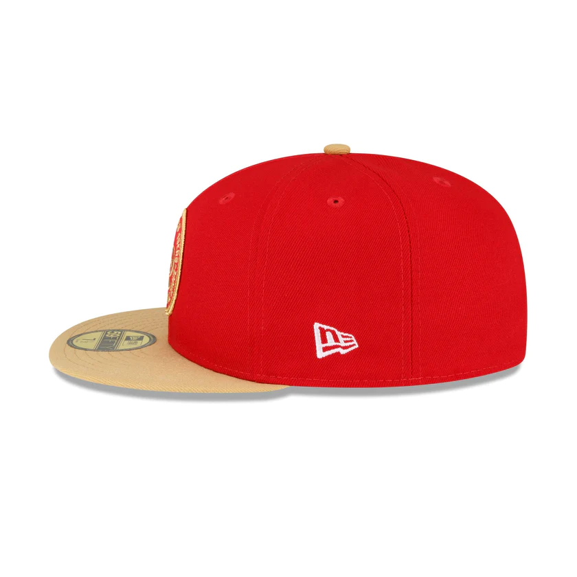 The San Francisco 49ers 2023 Sideline Team Patch 59FIFTY Fitted Cap features an embroidered San Francisco 49ers patch at the front panels with a matching NFL Shield at the right-wear side. Additional details include a team wordmark at the rear and a gray undervisor.
