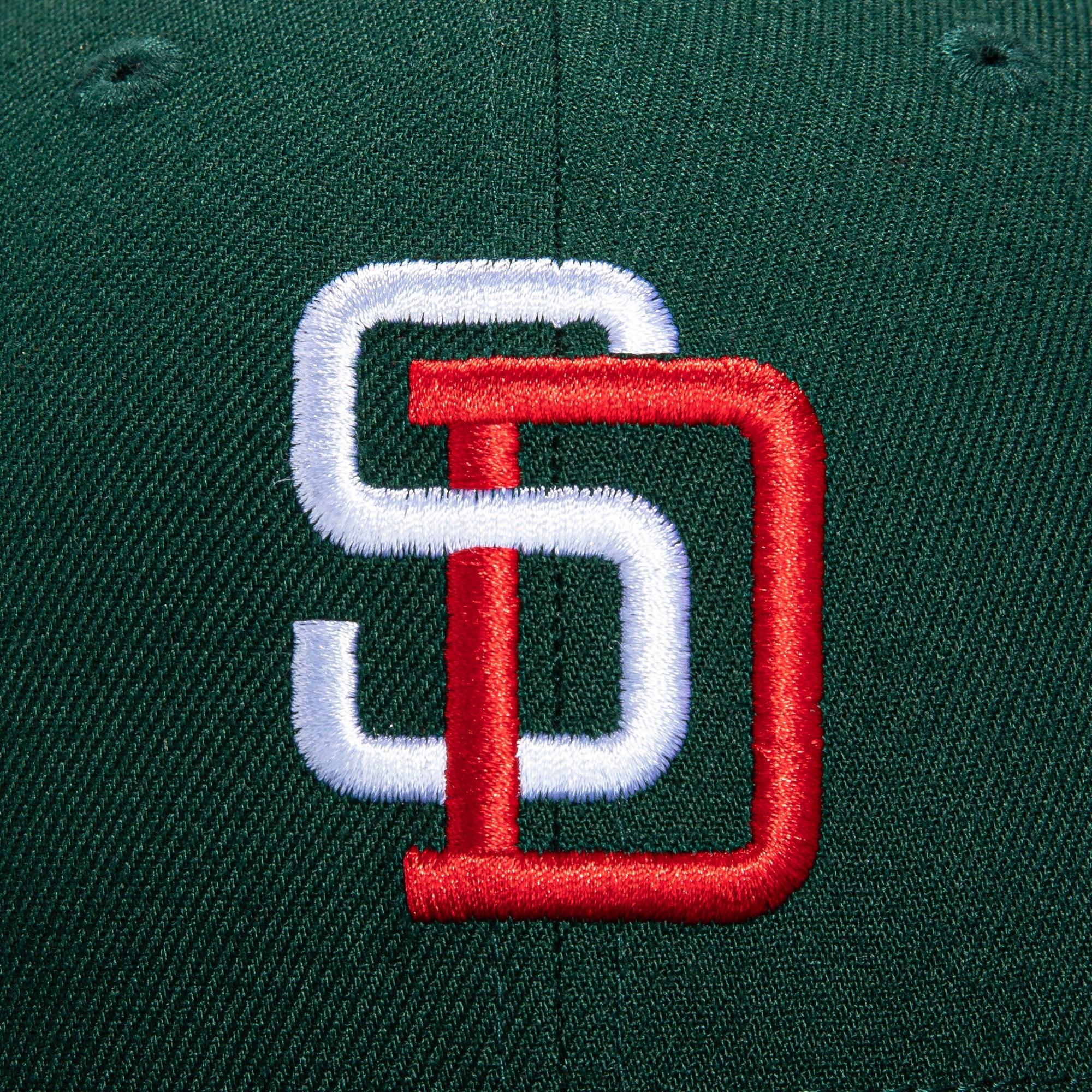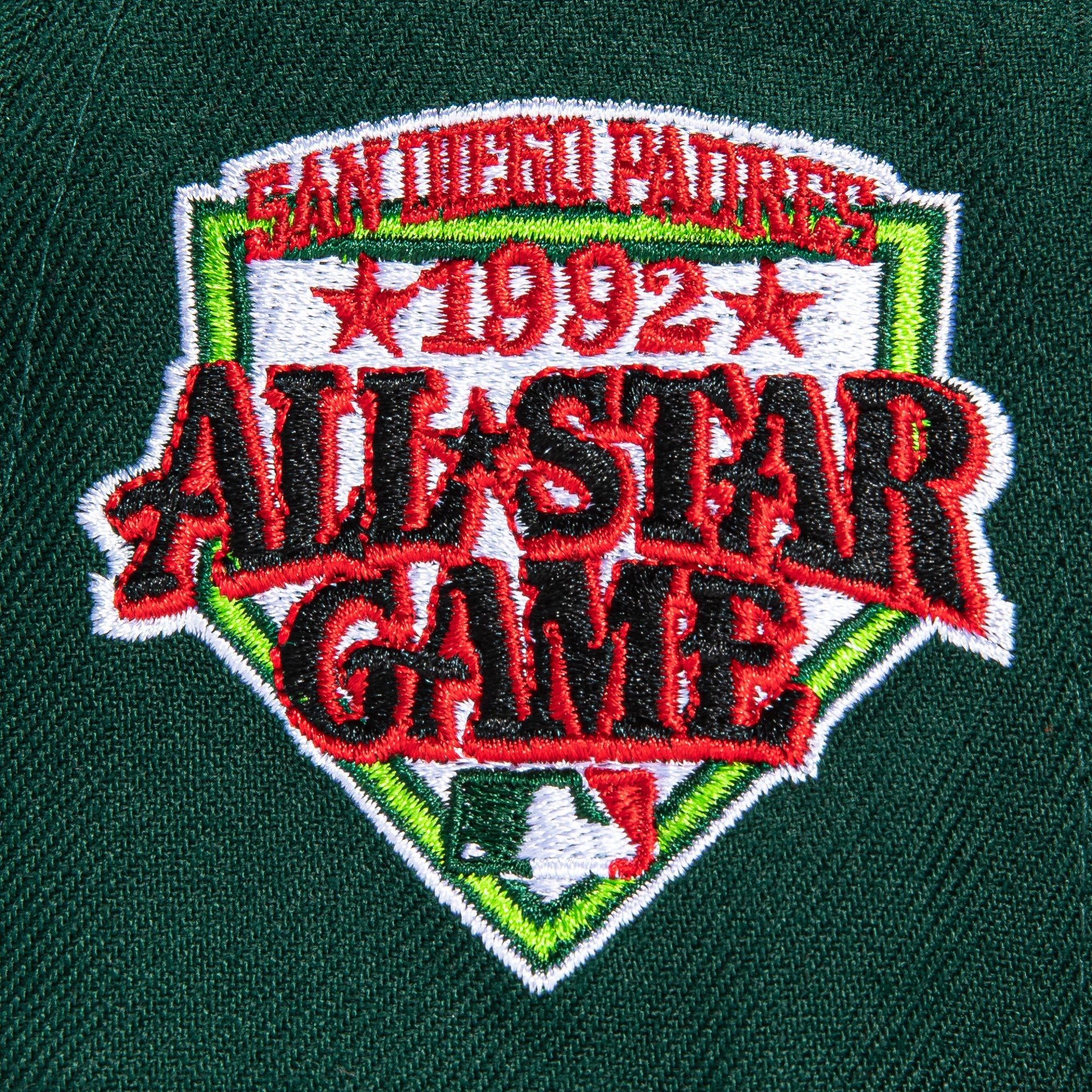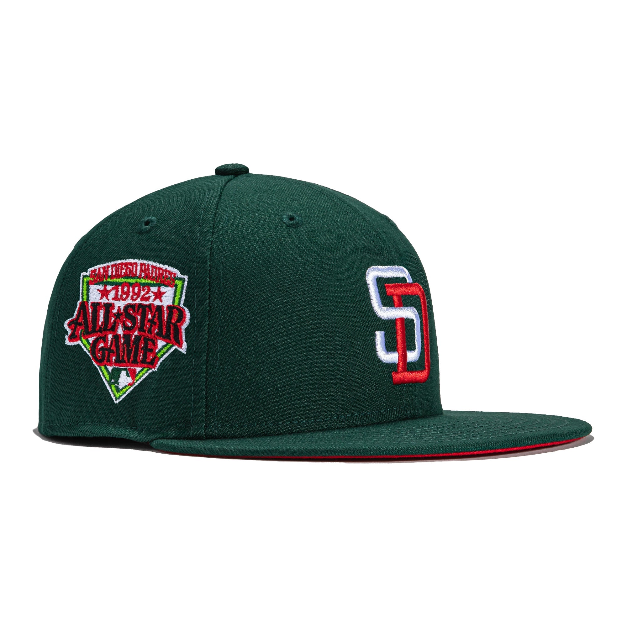 This New Era San Diego Padres 2016 All-Star Game 'Watermelon' 59FIFTY Fitted Hat was originally released by Hat Club. The fitted has a dark green six panel structured high crown, embroidered eyelets and fabric squatchee button. The flat bill of the fitted cap is also dark green with a red bottom undervisor. The front panel features the San Diego Padres logo embroidery and a side patch embroidered on the right panel. The left panel of the fitted displays the New Era logo and the official MLB insignia embroidered on the rear crown. The fitted hat colorway is inspired by the colors of a watermelon.