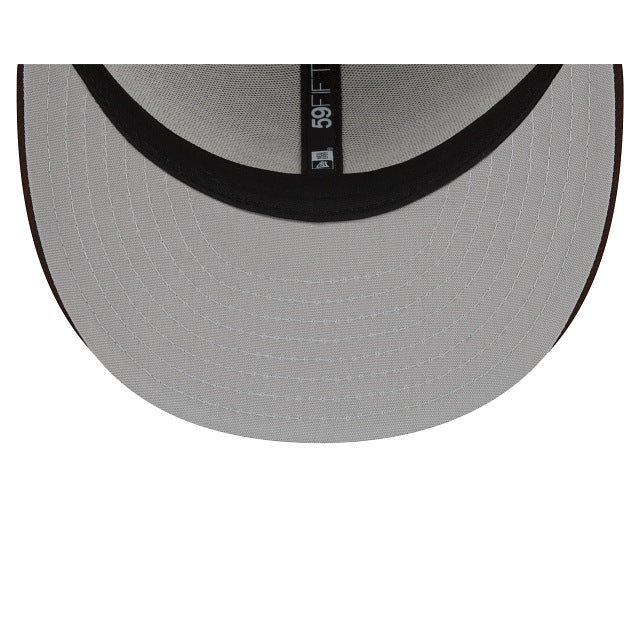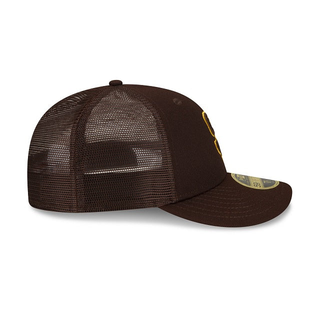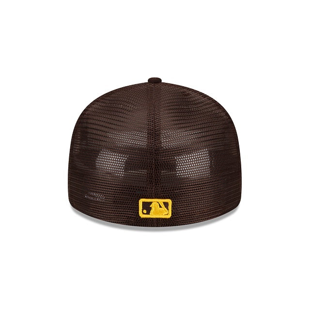 The San Diego Padres 2023 Batting Practice Low Profile 59FIFTY Fitted Cap features an embroidered Padres logo at the front panels with a matching MLB Batterman logo at the rear and a gray undervisor.