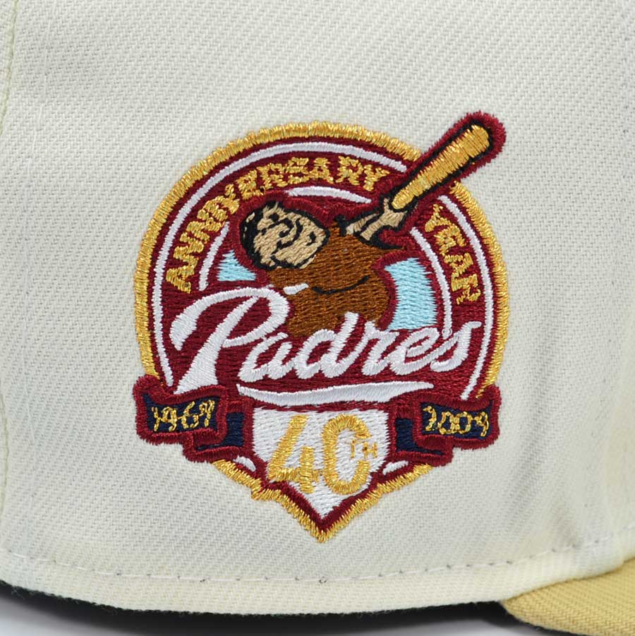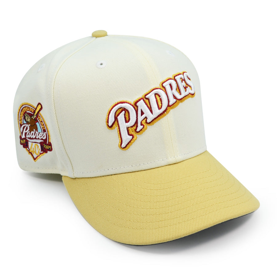 This San Diego Padres fitted hat was released by Hat Dreams. The fitted has a white six panel structured high crown and embroidered eyelets with a vegas gold fabric squatchee button. The flat bill of the cap is vegas gold with a grey undervisor and white sweatband. The front panel features the San Diego Padres logo embroidery and a 40th Anniversary side patch embroidery on the right panel. The left panel of the fitted displays the New Era logo and the official MLB Batterman logo embroidery on the rear crown.