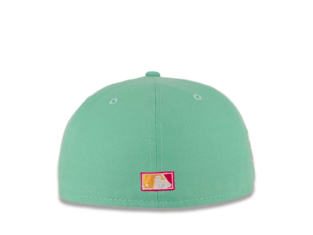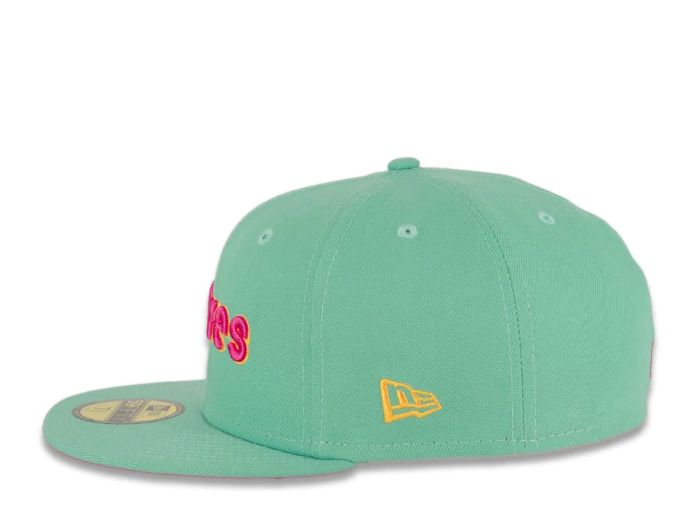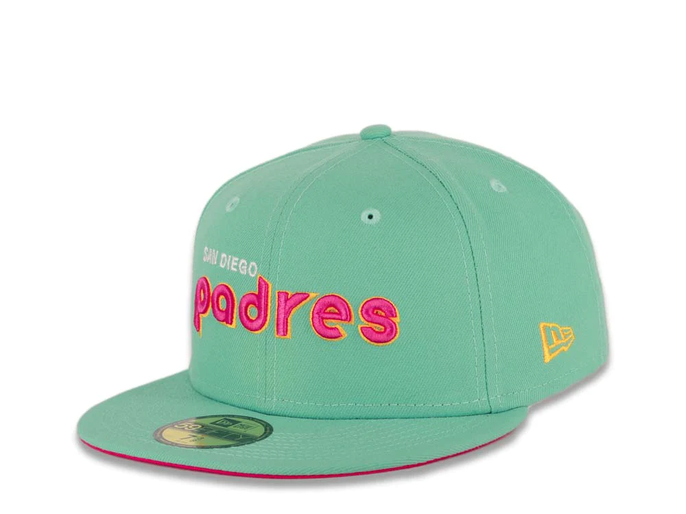 This New Era San Diego Padres 59FIFTY fitted hat was released by Capland. The fitted has a mint six panel structured high crown, embroidered eyelets, fabric squatchee button and flat bill. The fitted has a hot pink undervisor, with a hot pink & white San Diego Padres script on the front panel and stadium logo on the right-wear side.