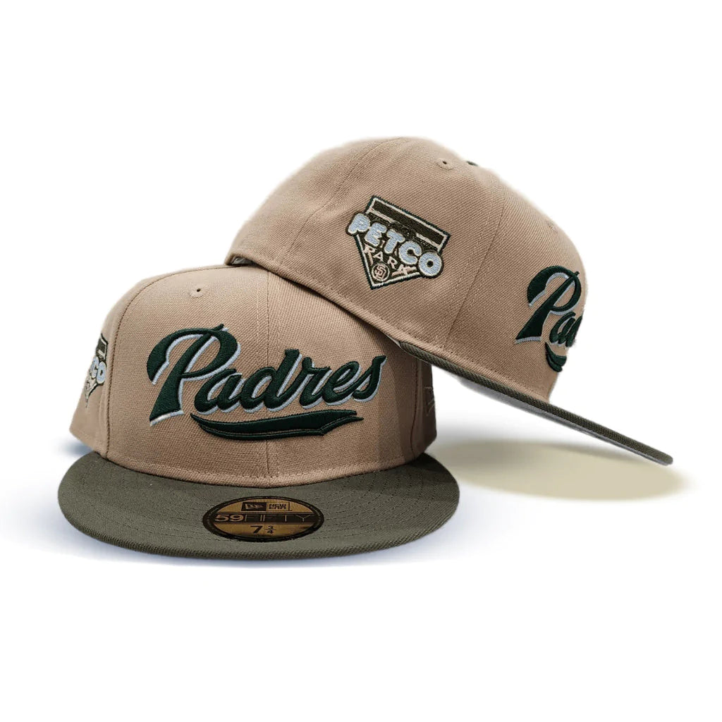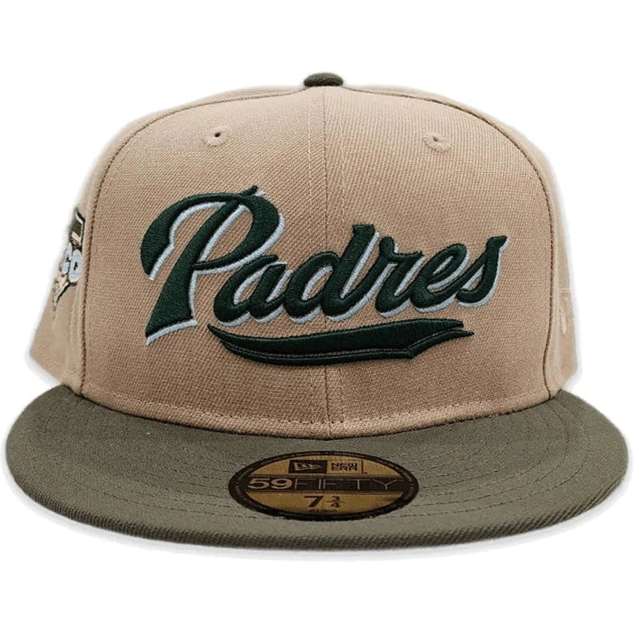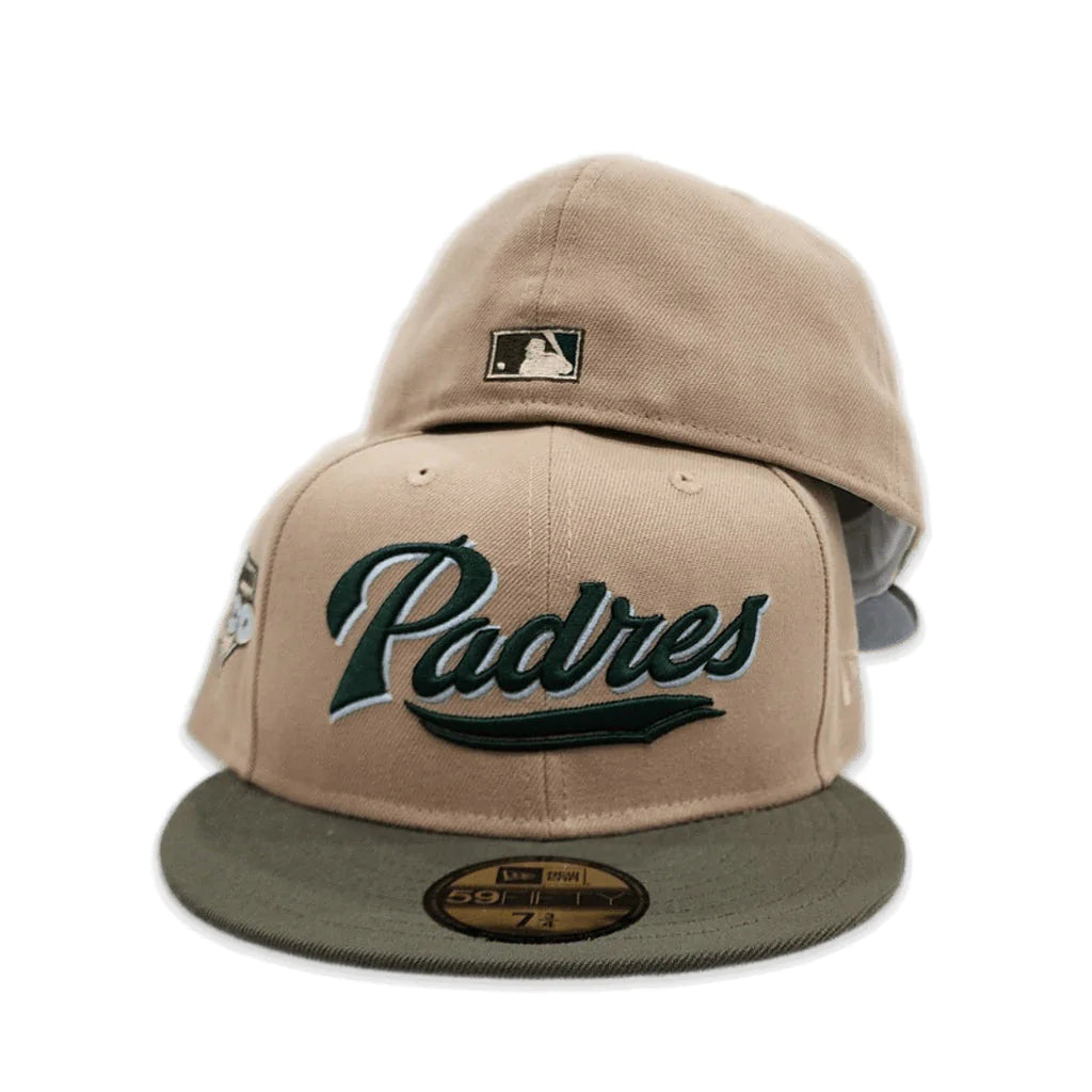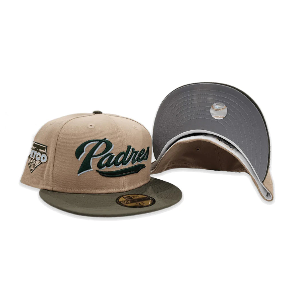 This New Era San Diego Padres Script Camel/Olive Green 59FIFTY Fitted Hat was released by Exclusive Fitted. The fitted has a camel six panel structured high crown and embroidered eyelets with an olive green fabric squatchee button and flat bill. The fitted cap has a gray bottom undervisor with a white sweatband . The front panel features the San Diego Padres logo embroidery and a side patch embroidered on the right panel. The left panel of the fitted displays the New Era logo and the official MLB logo embroidery on the rear crown.