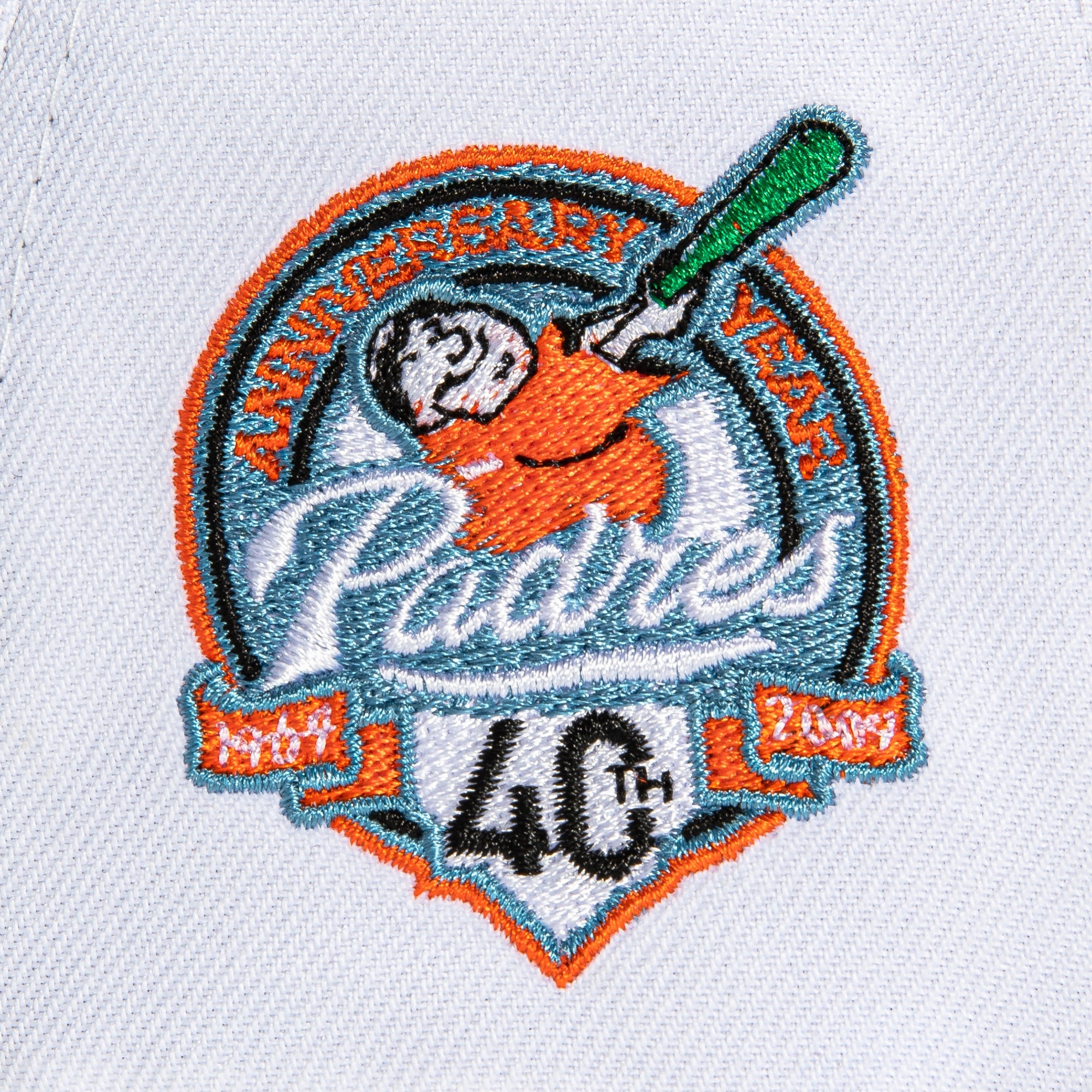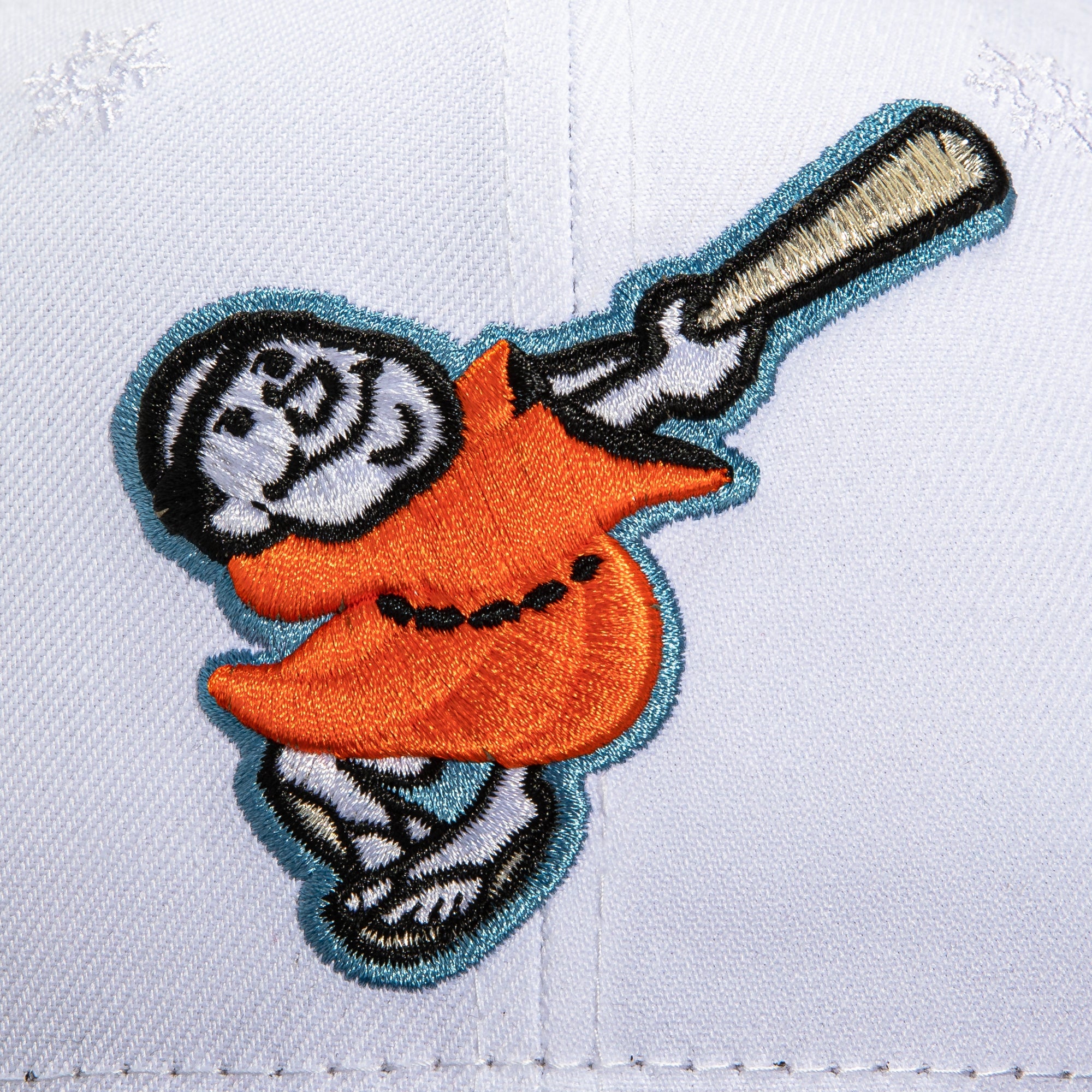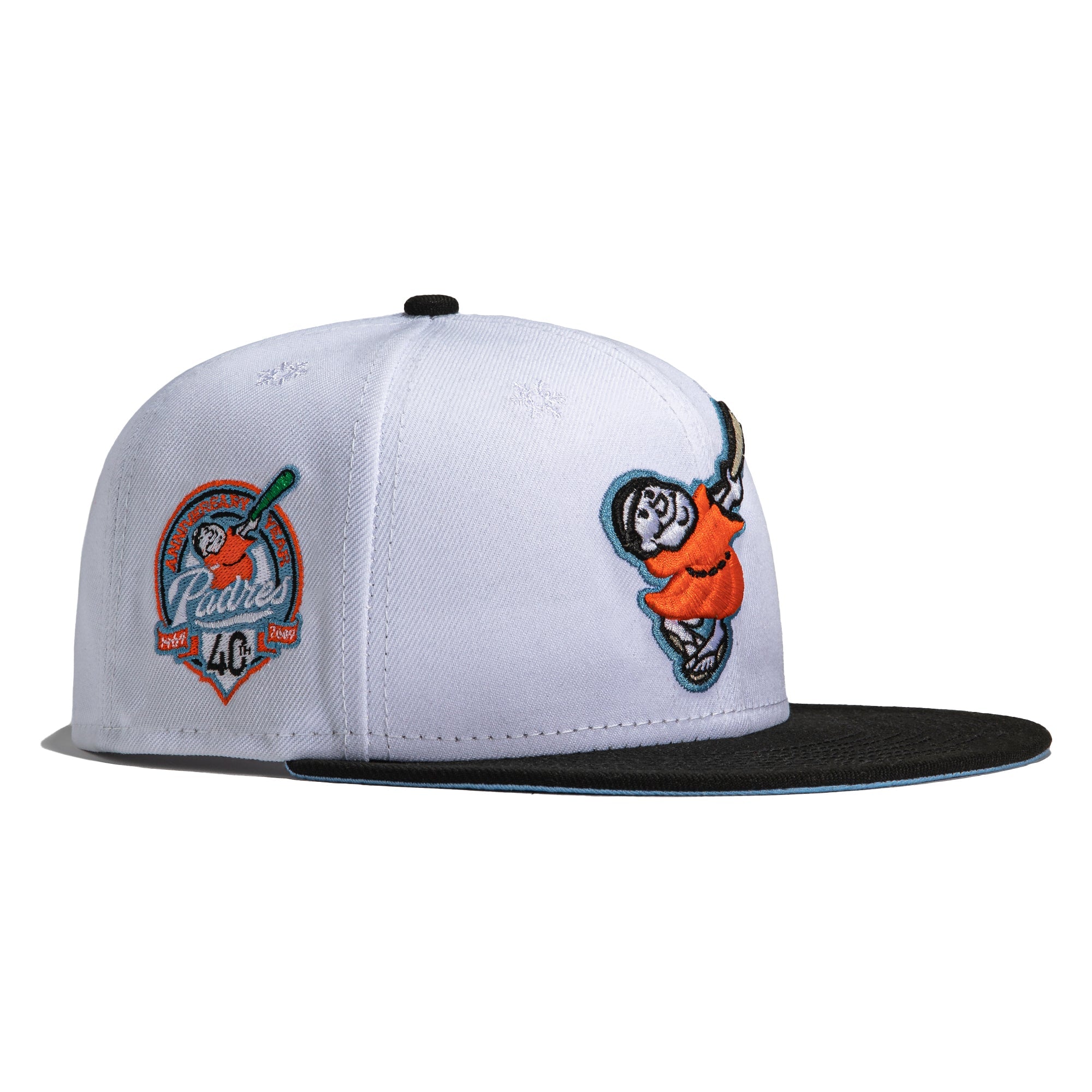This New Era San Diego Padres 'Snowman' 40th Anniversary 2022 59FIFTY Fitted Hat was released by Hat Club. The fitted has a white six panel structured high crown and snowflake embroidered eyelets with a black fabric squatchee button. The flat bill of the fitted cap is also black with a light blue undervisor. The front panel features the San Diego Padres logo embroidery and a side patch embroidered on the right panel. The left panel of the fitted displays the New Era logo and the official MLB Batterman insignia embroidered on the rear crown. The fitted hat colorway is inspired by the colors of a snowman.