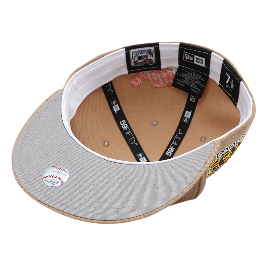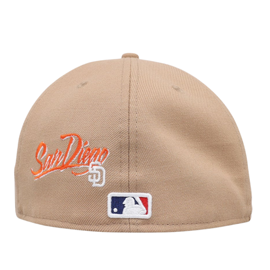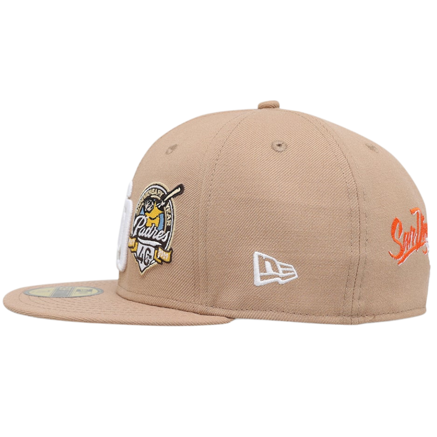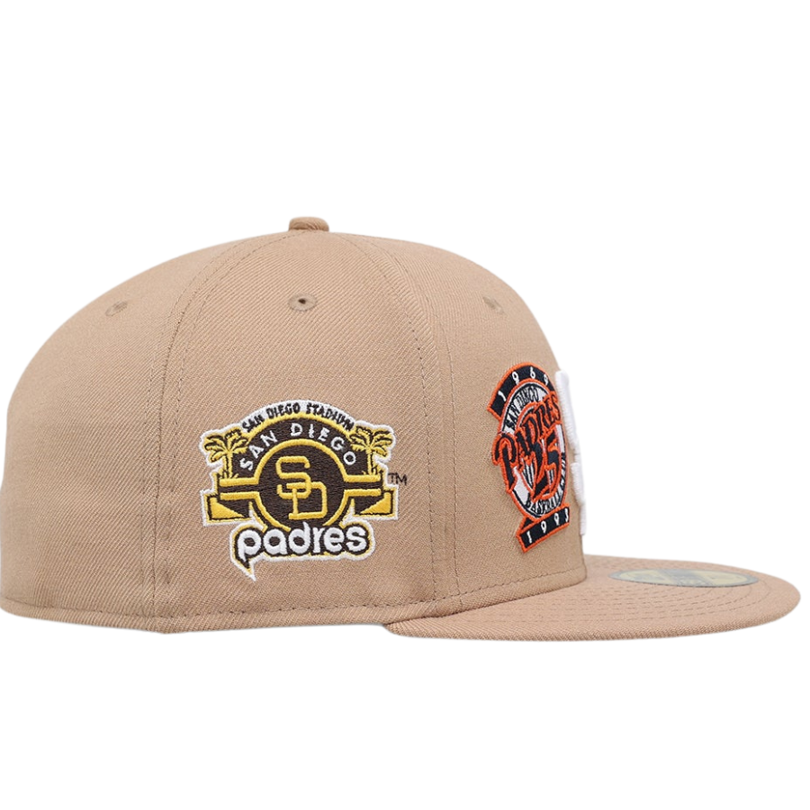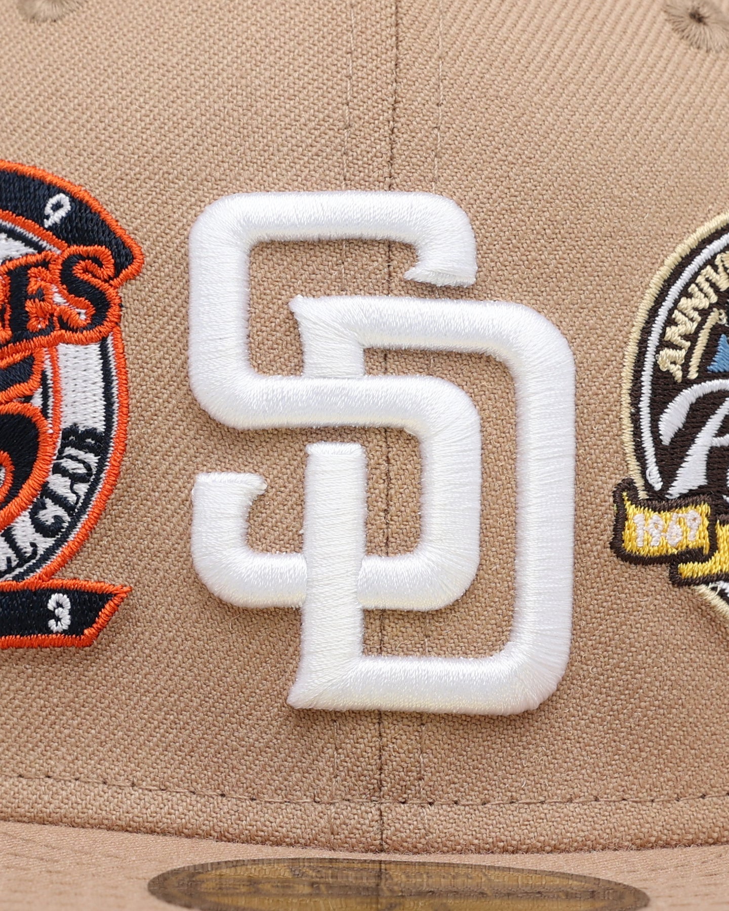 This New Era San Diego Padres 'World Series Multi Logo' Tumbleweed 2023 59FIFTY Fitted Hat was released by Culture Kings. The fitted has a tan six panel structured high crown and embroidered eyelets with a tan fabric squatchee button. The flat bill of the fitted cap is also tan with a gray undervisor and black sweatband. The front panel features the San Diego Padres logo embroidery and the New Era "Fly Your Own Flag" logo on the left panel. The rear crown has the official MLB logo on display.