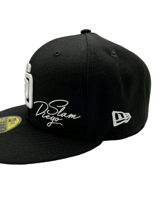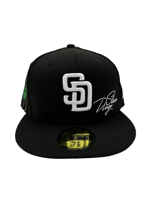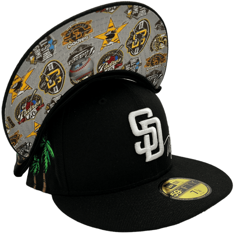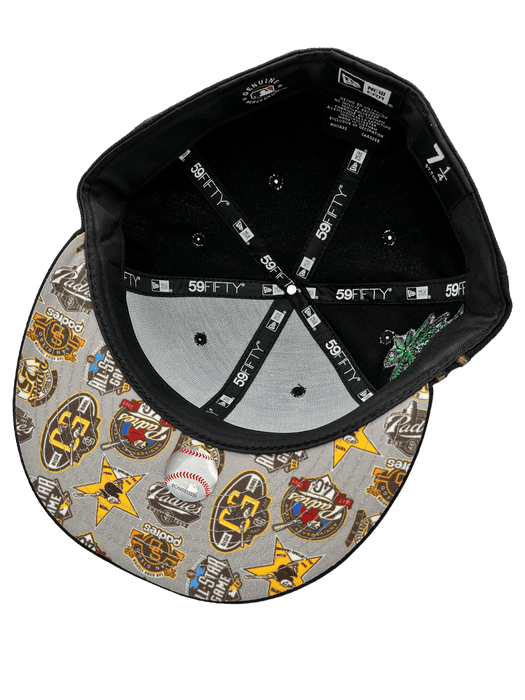 This New Era x Pro Image Sports San Diego Padres Logo UV 2023 59FIFTY Fitted Hat has a black six panel structured high crown and embroidered eyelets with a black fabric squatchee button. The fitted cap also has a black flat bill with an all over celebratory graphic undervisor. The front panel features the San Diego Padres logo embroidery and a graphic side patch embroidery on the right panel. The left panel of the fitted displays the New Era logo and the official MLB logo embroidery on the rear crown.