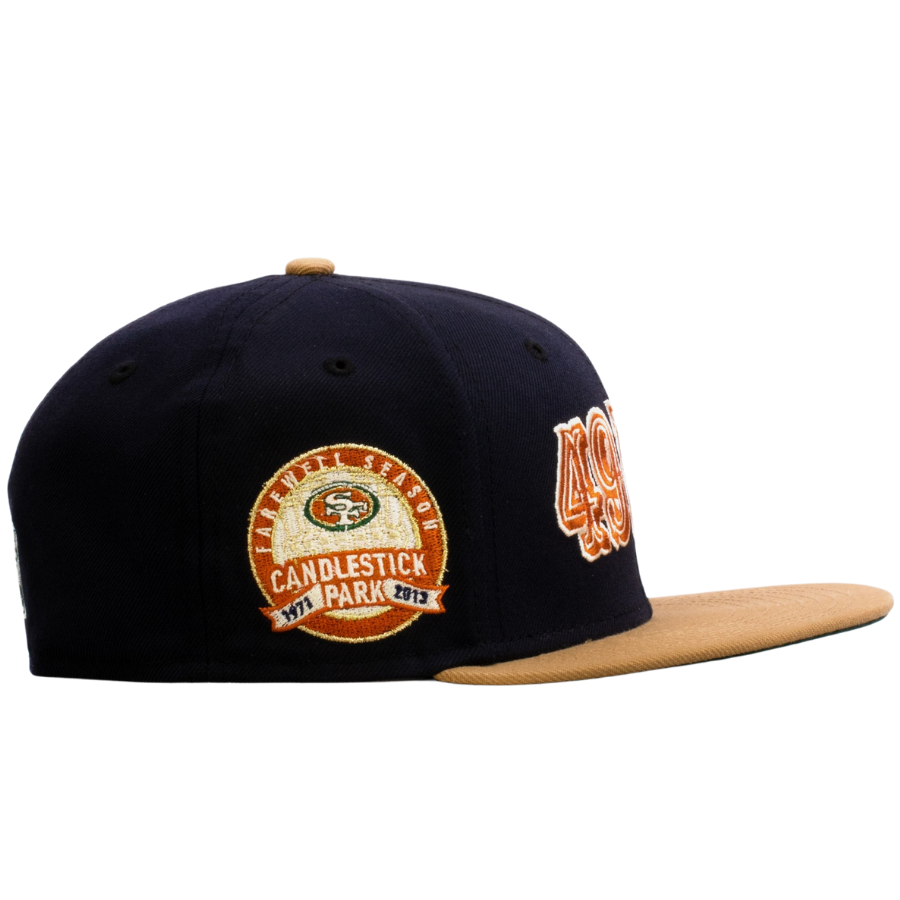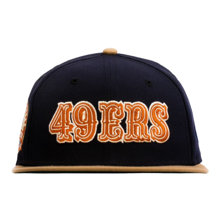 This New Era San Francisco 49ers 'Varsity Blues' 2023 59FIFTY Fitted Hat was released by Shoe Palace. The fitted has a navy blue six panel structured high crown and embroidered eyelets with a khaki fabric squatchee button. The flat bill of the fitted cap is also khaki with a pine green undervisor and black sweatband. The front panel features the San Francisco 49ers logo embroidery and a side patch on the right panel. The left panel of the fitted displays the New Era logo and the NFL insignia embroidered on the rear crown.