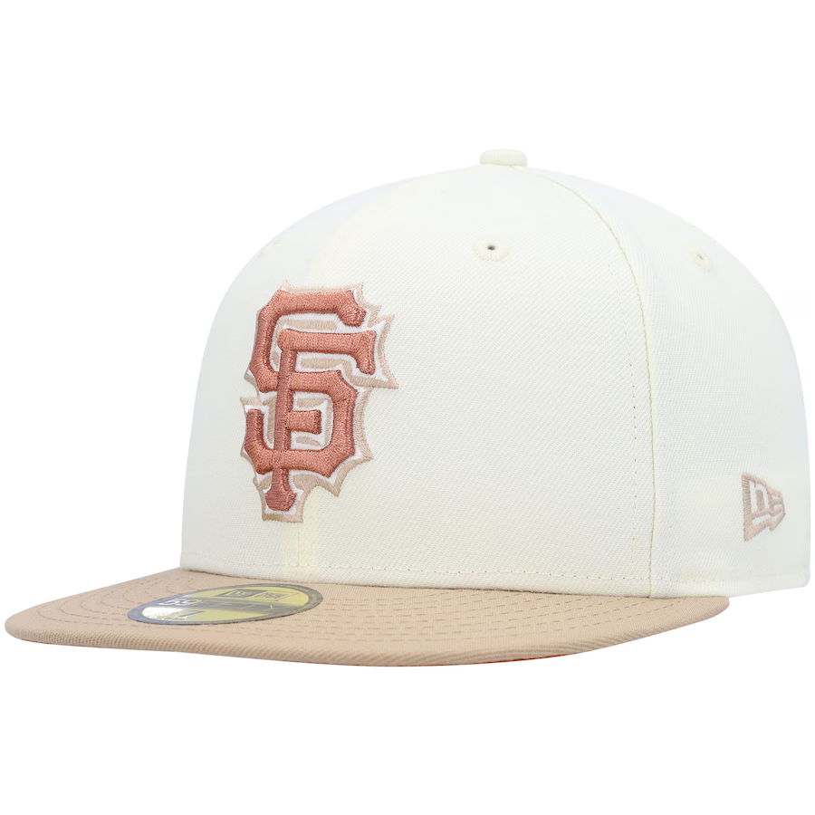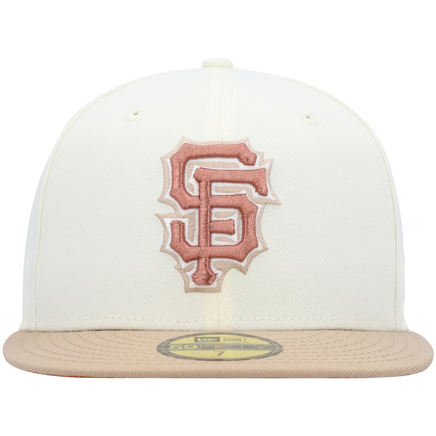 Complete your San Francisco Giants ensemble with this sleek Chrome Camel 59FIFTY hat by New Era. Showcasing striking team graphics and a contrasting rust orange undervisor, this hat offers an extra touch of style. With its fitted design, it's the ideal accessory to complement any outfit.