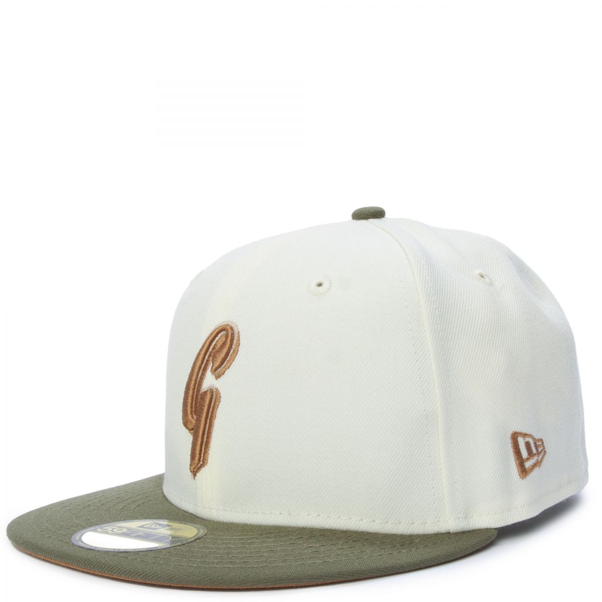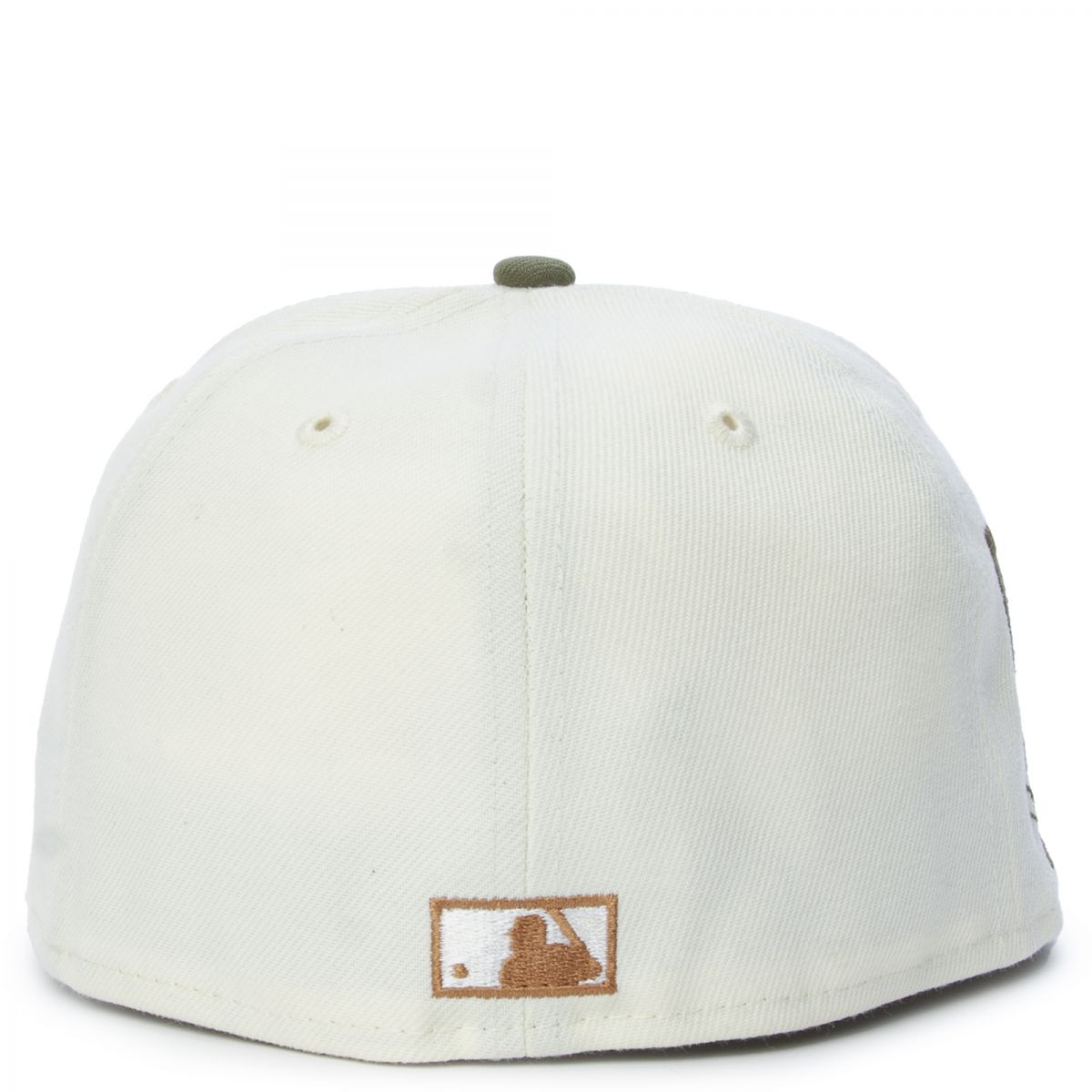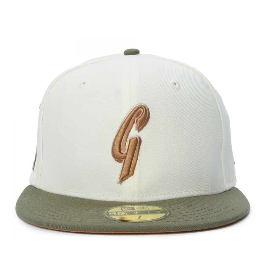 This New Era San Francisco Giants 2007 All-Star Game 59FIFTY fitted hat has a chrome six panel structured high crown and embroidered eyelets with an olive green fabric squatchee button and flat bill. The undervisor of the fitted is peanut brown with a black sweatband. The front panel includes a throwback SF Giants logo embroidery and a 2007 ASG side patch on the right-wear side.