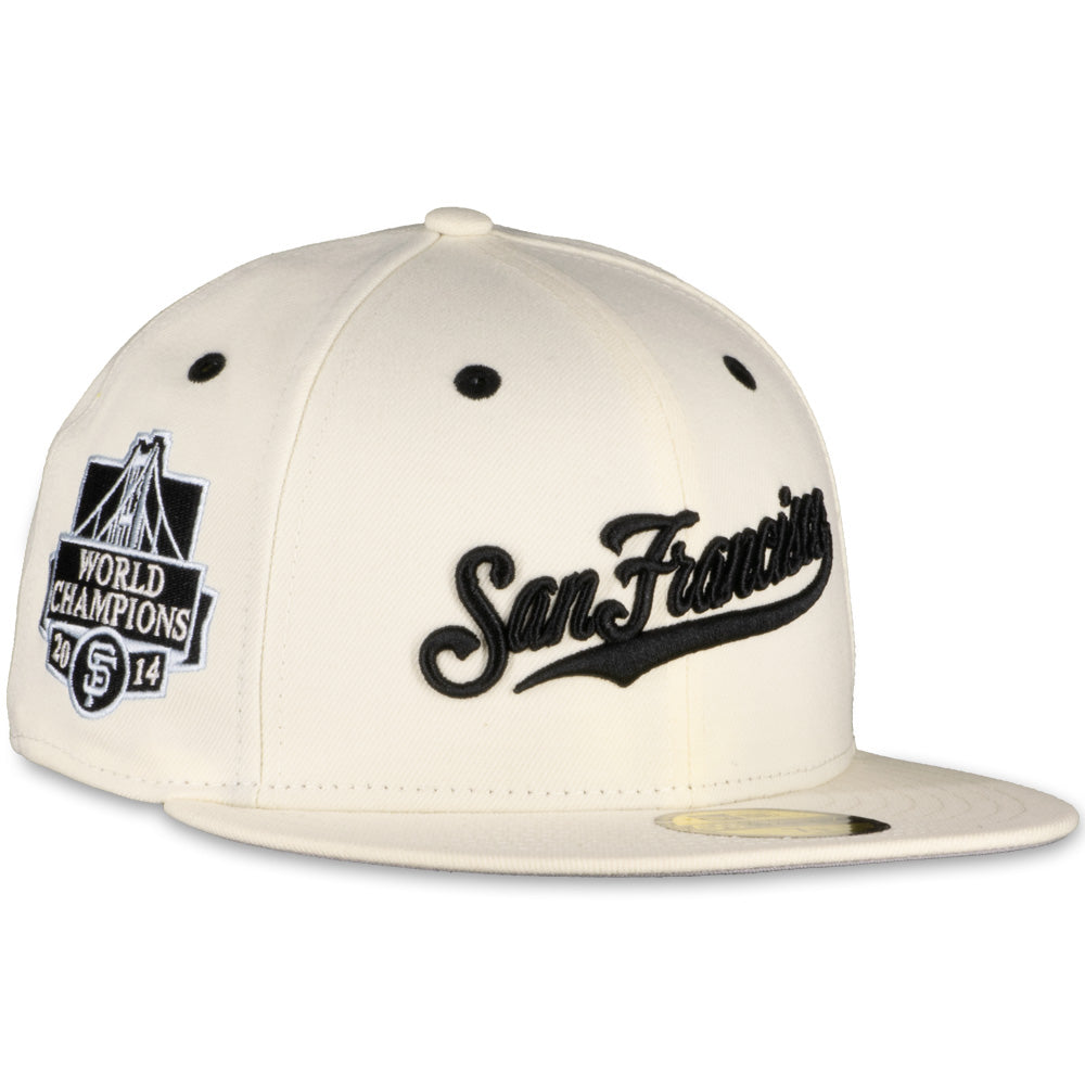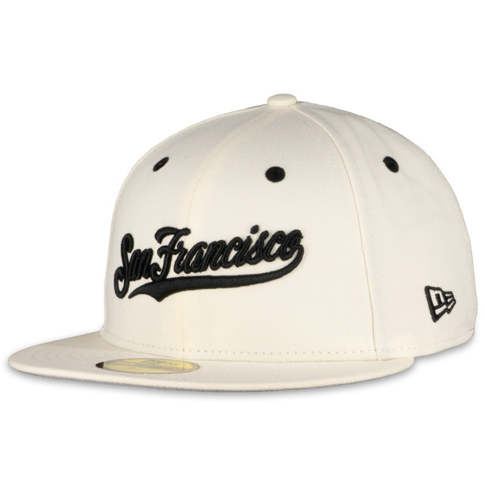 This San Francisco Giants fitted hat was released by Just Sports. The fitted has a ivory six panel structured high crown and embroidered eyelets with an ivory fabric squatchee button. The flat bill of the cap is also ivory with an undervisor and sweatband. The front panel features the San Francisco Giants logo embroidery and a side patch embroidery on the right panel. The left panel of the fitted displays the New Era logo and the official MLB logo embroidery on the rear crown.