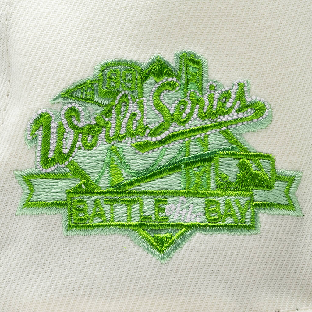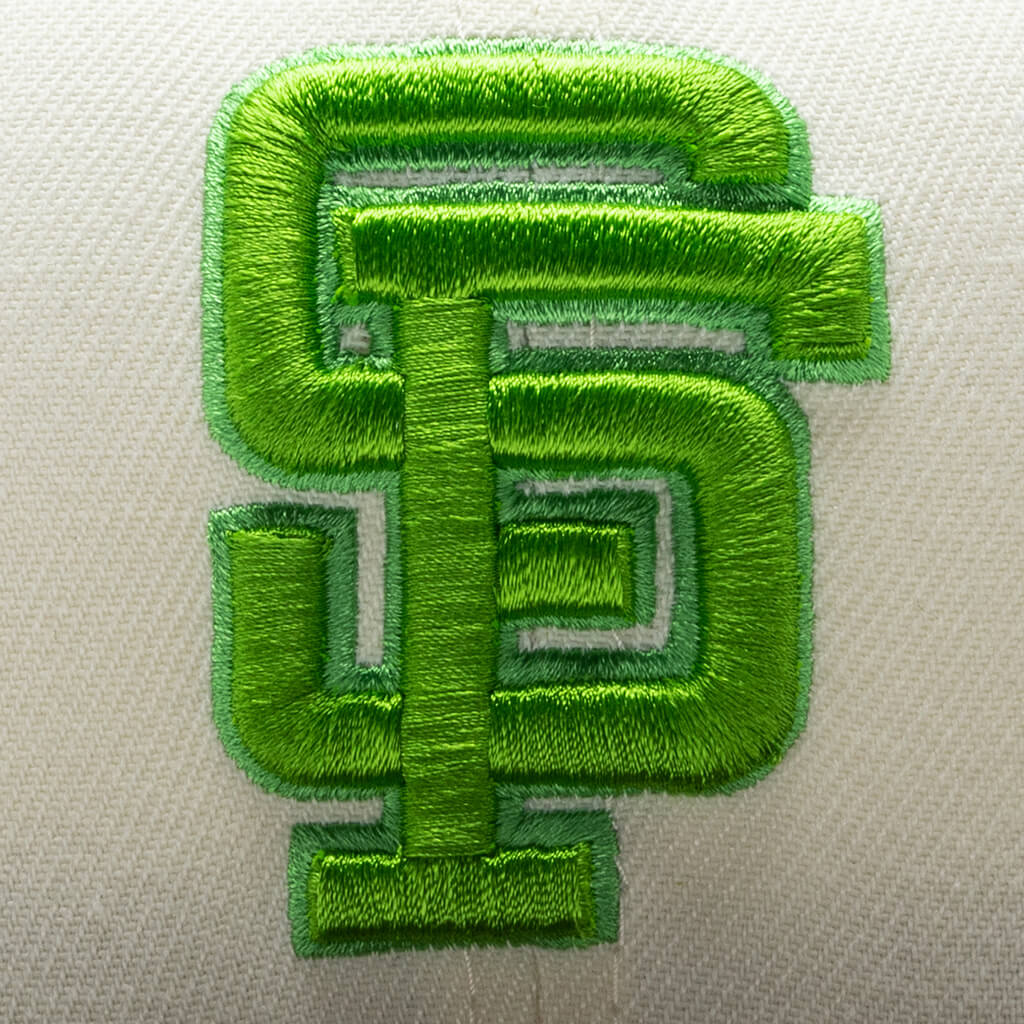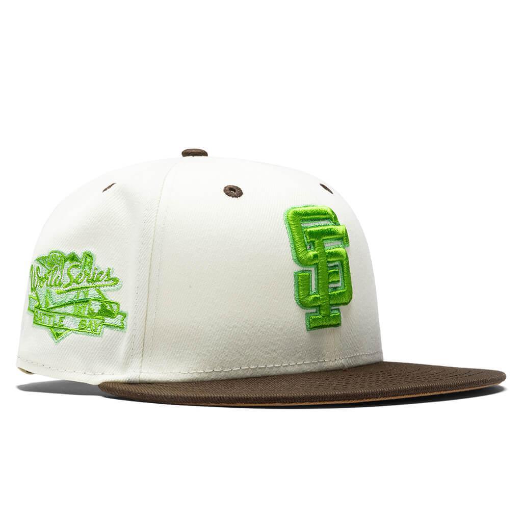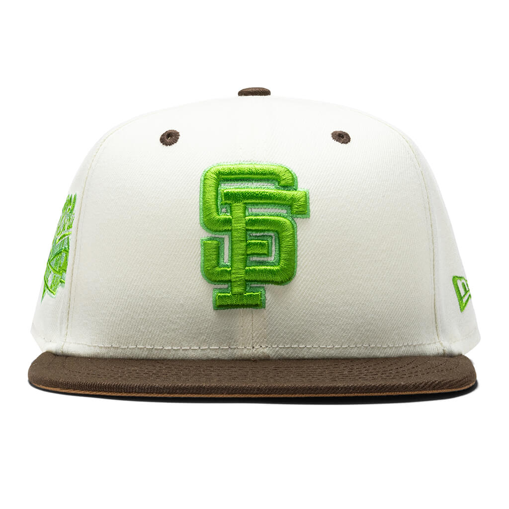 This New Era x Feature San Francisco Giants Bamboo 2023 59FIFTY Fitted Hat was released by Feature. The fitted has a chrome/white six panel structured high crown, dark brown embroidered eyelets & fabric squatchee button. The flat bill of the fitted cap is also dark brown with a lime green bottom undervisor with a white sweatband. The front panel features the San Francisco Giants logo embroidered in lime stitching with a side patch on the right panel in the same lime colorway. The left panel of the fitted displays the New Era logo and the official MLB Batterman on the rear-crown .