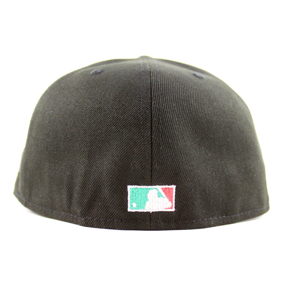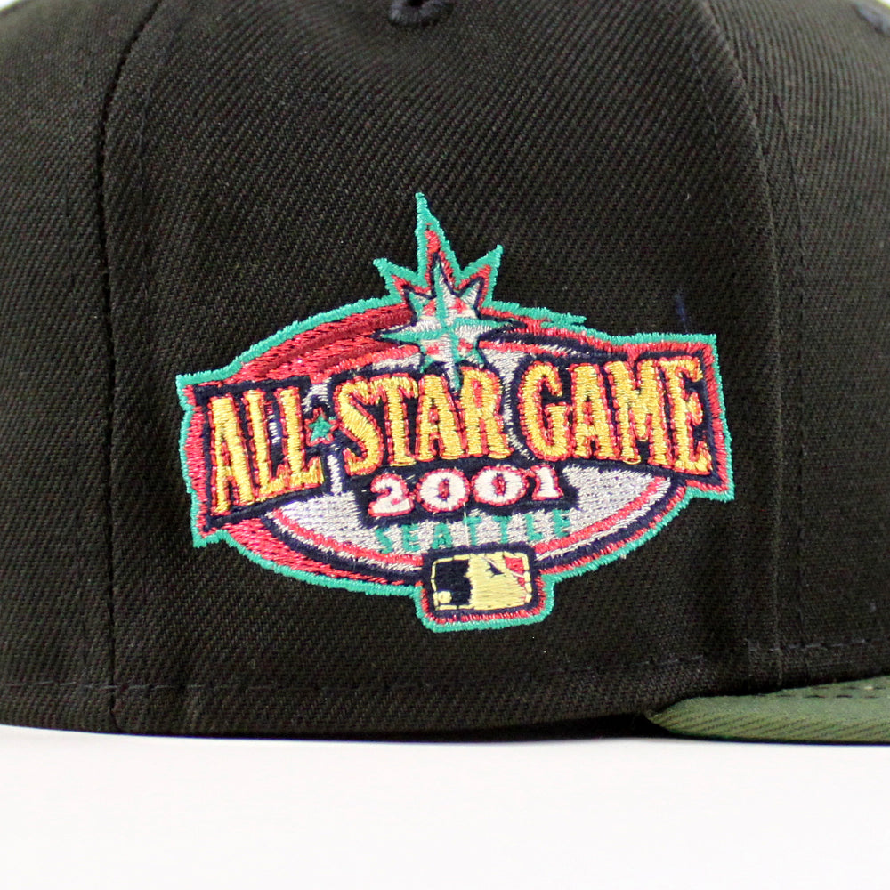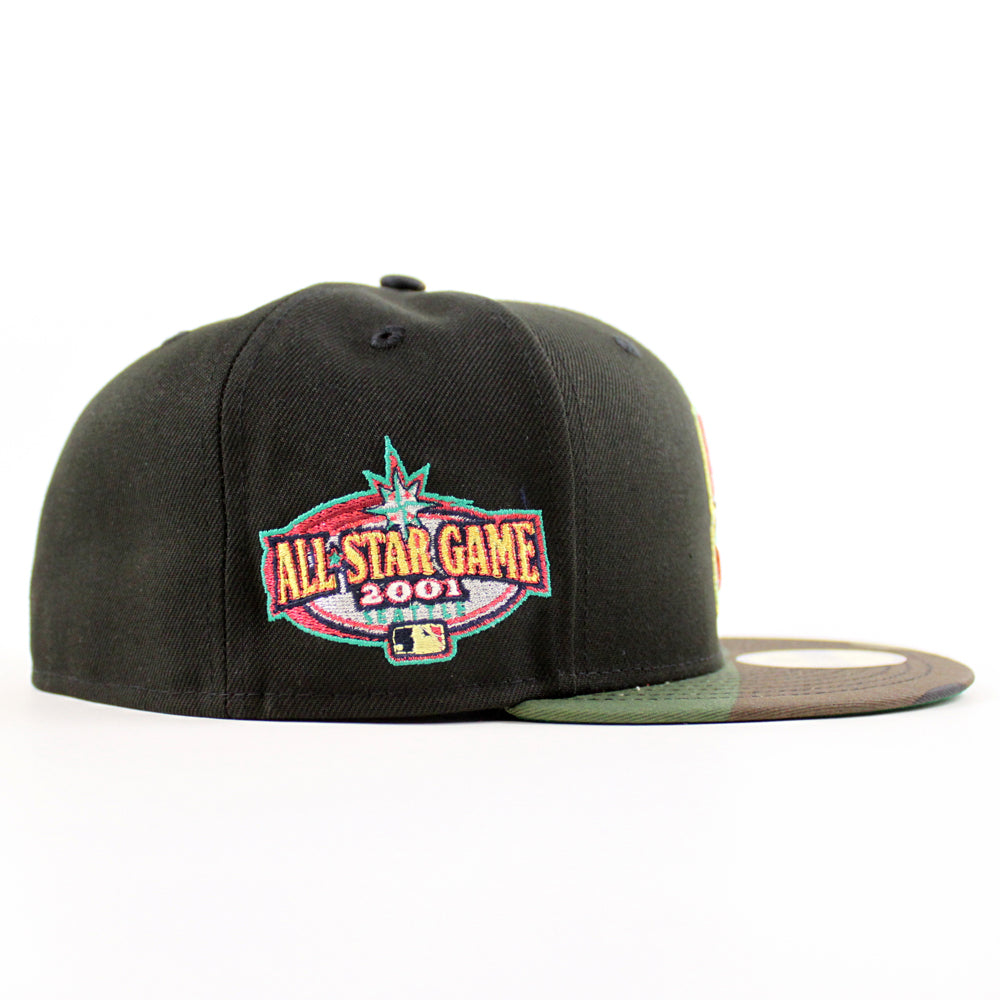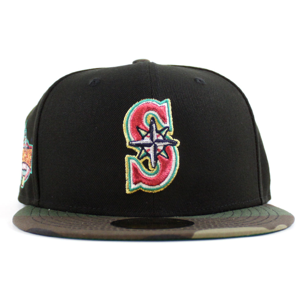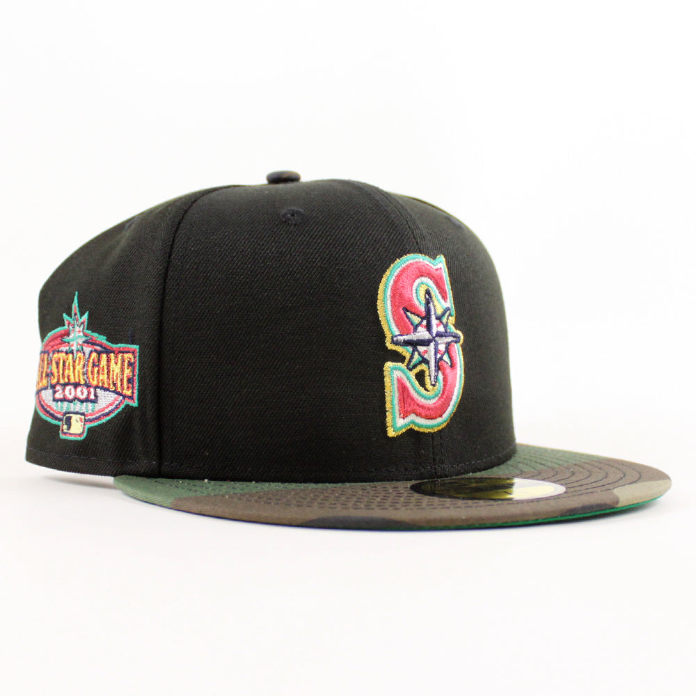 This Seattle Mariners fitted hat was released by Ecapcity. The fitted has a black six panel structured high crown and embroidered eyelets with a woodland fabric squatchee button. The flat bill of the cap is woodland with a green undervisor. The front panel features the Seattle Mariners logo embroidery and a 2001 All-Star Game side patch embroidery on the right panel. The left panel of the fitted displays the New Era logo and the official MLB Batterman logo embroidery on the rear crown.