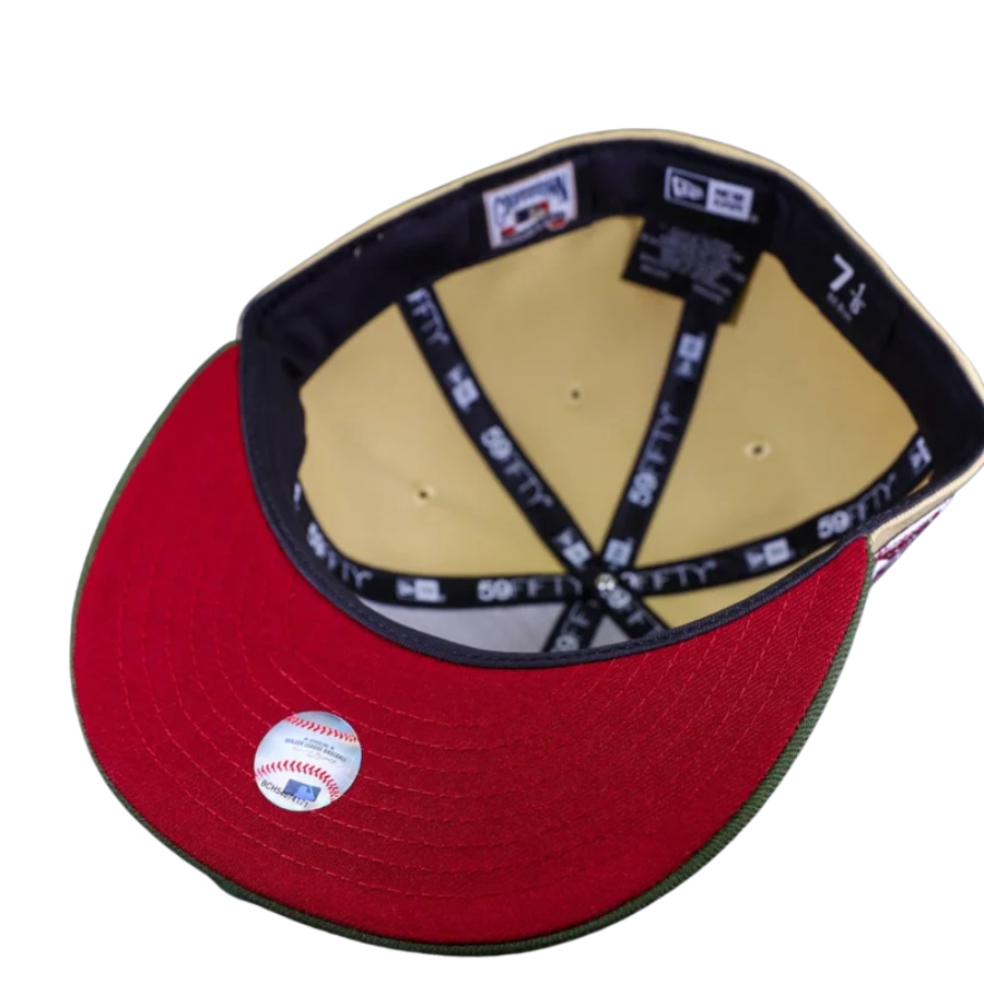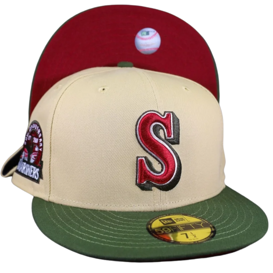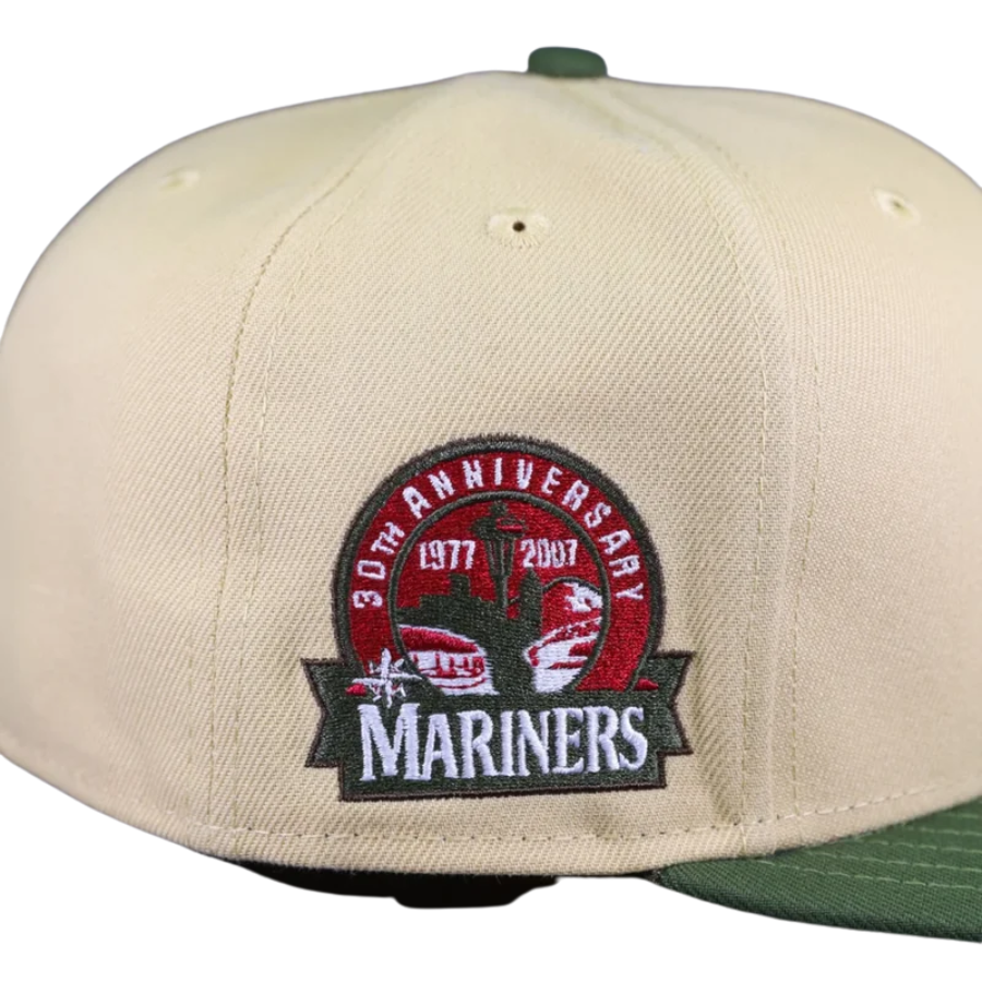 This Seattle Mariners fitted hat was released by Hat Stop. The fitted has a vegas gold six panel structured high crown and embroidered eyelets with a rifle green fabric squatchee button. The fitted cap also has a rifle green flat bill with a red undervisor and black sweatband. The front panel features the Seattle Mariners script logo embroidery and a 30th Anniversary side patch embroidery on the right panel. The left panel of the fitted displays the New Era logo and the official MLB Batterman embroidery on the rear crown.
