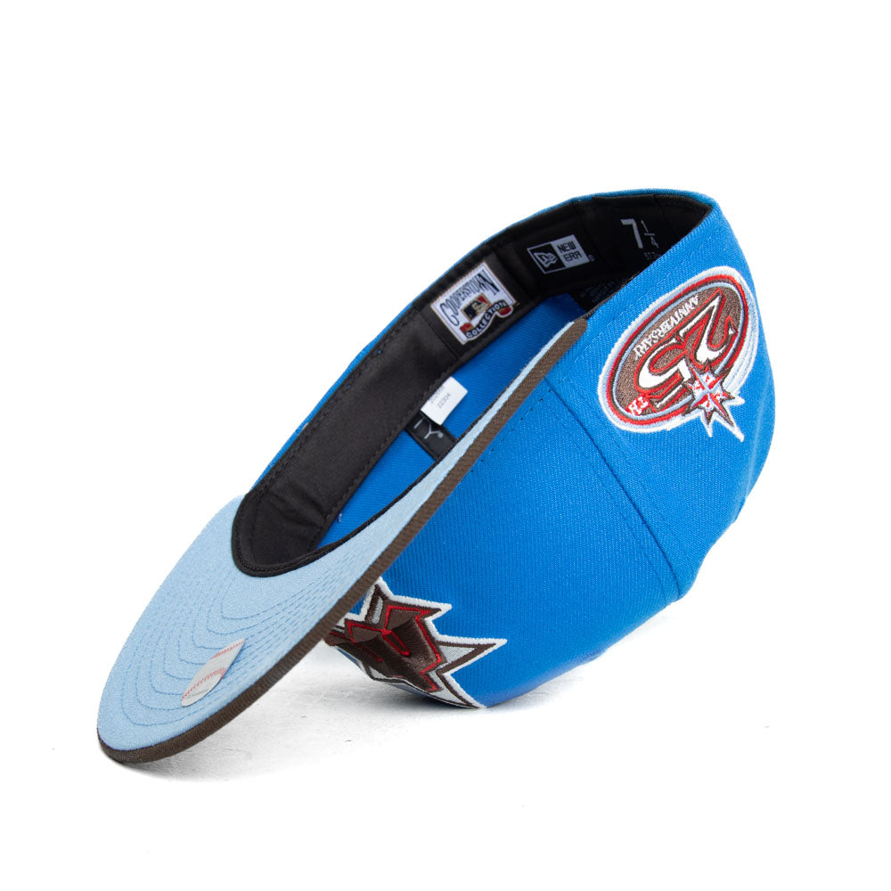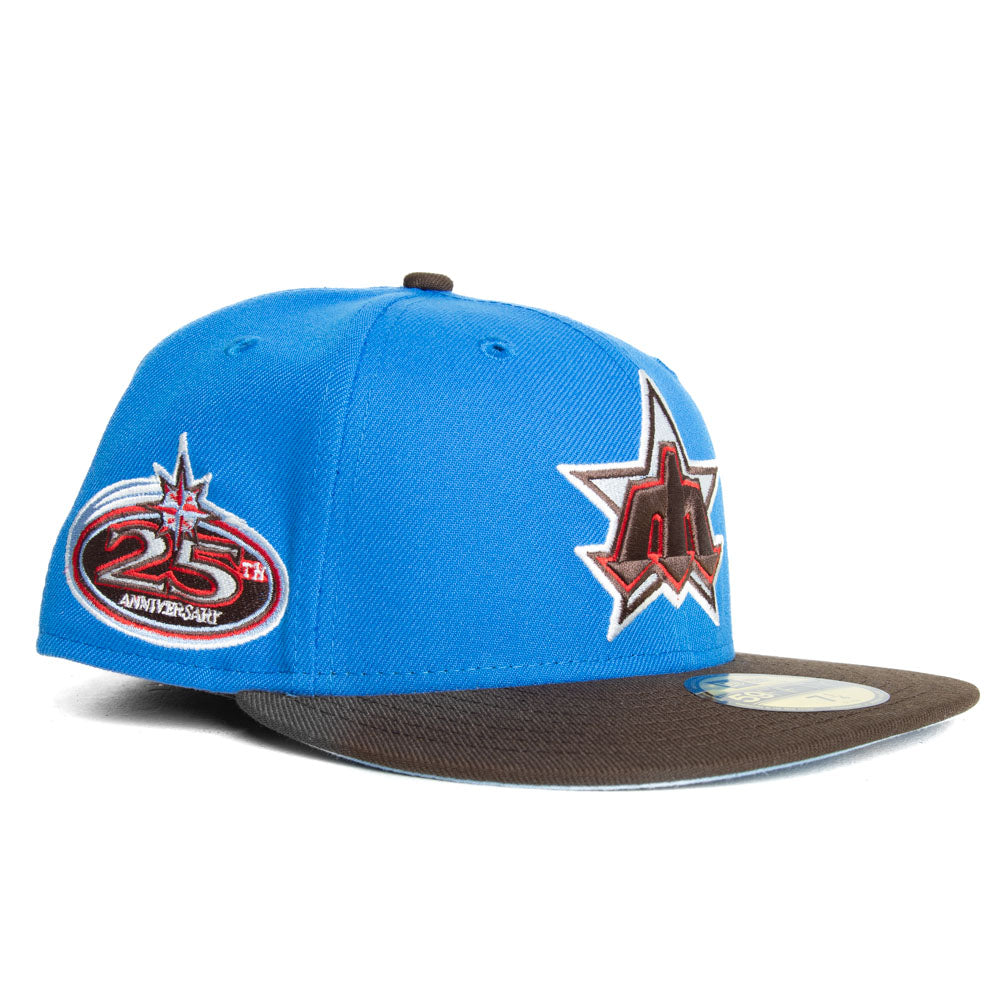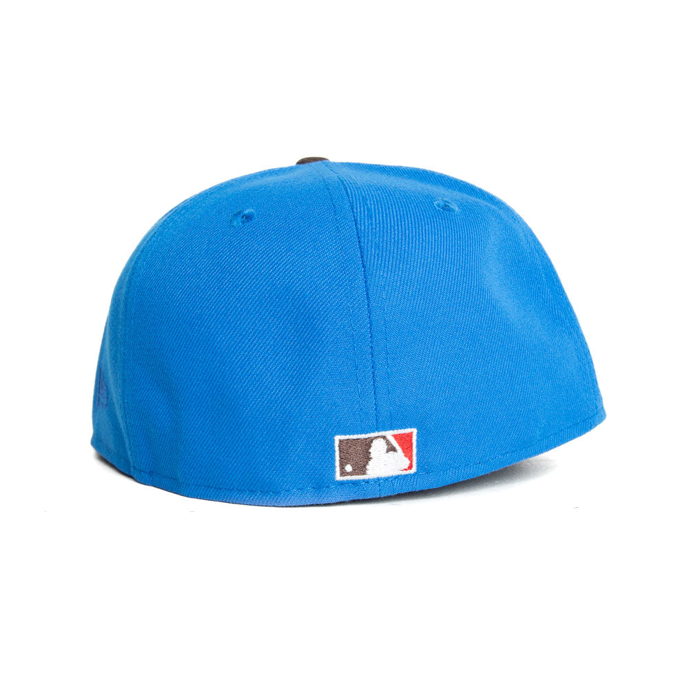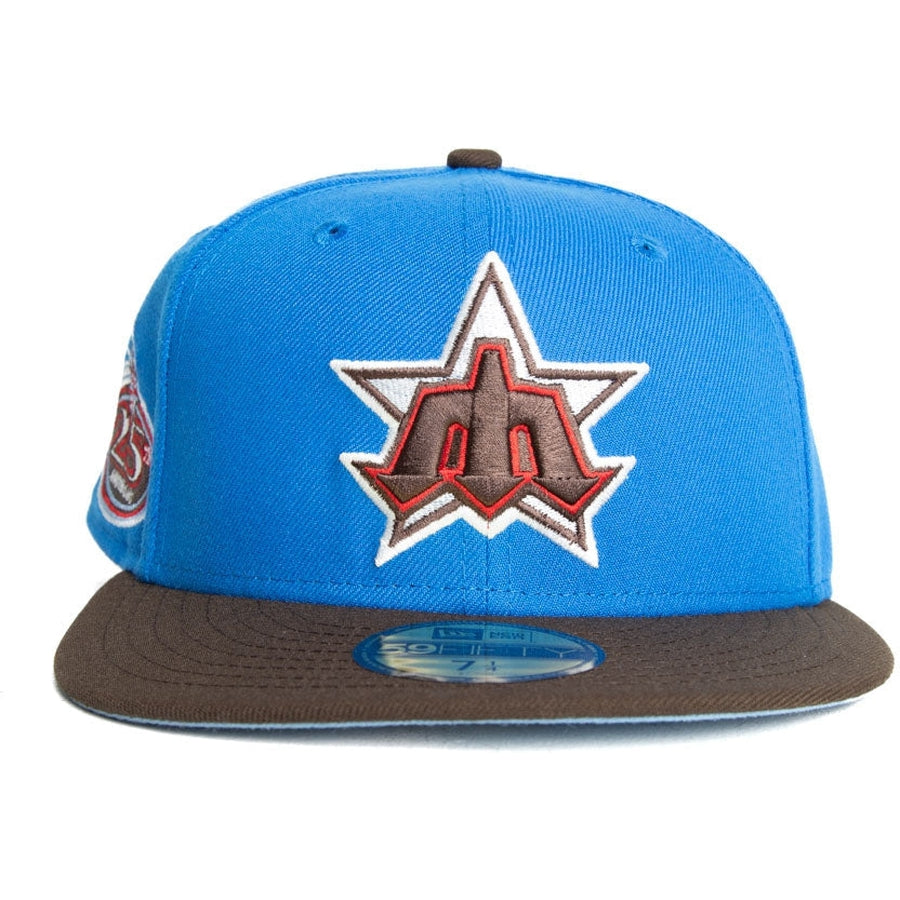 This Seattle Mariners 59FIFTY fitted hat was released by Capanova. The fitted has a blue six panel structured high crown and embroidered eyelets with a walnut brown tone fabric squatchee button and flat bill with an icy undervisor. The front panel features the Seattle Mariners logo embroidery with a side patch on the right panel. The left panel of the fitted displays the New Era logo and the official MLB Batterman embroidery on the rear crown.