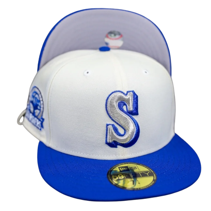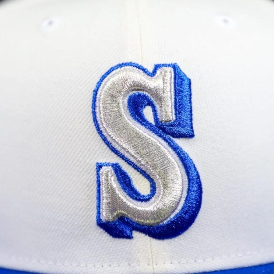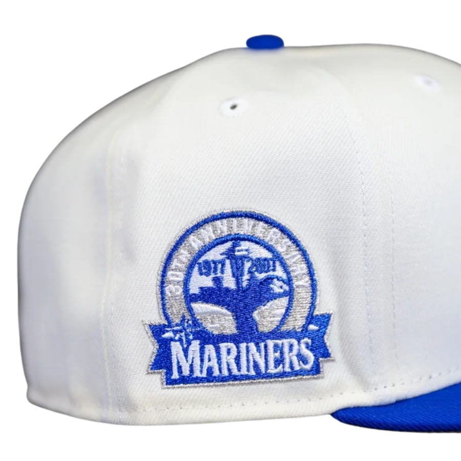 This Seattle Mariners fitted hat was released by Hat Stop. The fitted has a white six panel structured high crown and embroidered eyelets with a blue fabric squatchee button. The fitted cap also has a blue flat bill with a grey bottom undervisor. The front panel features the Seattle Mariners logo embroidery and an 30th Anniversary side patch embroidery on the right panel.
