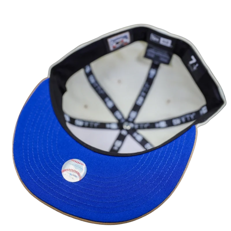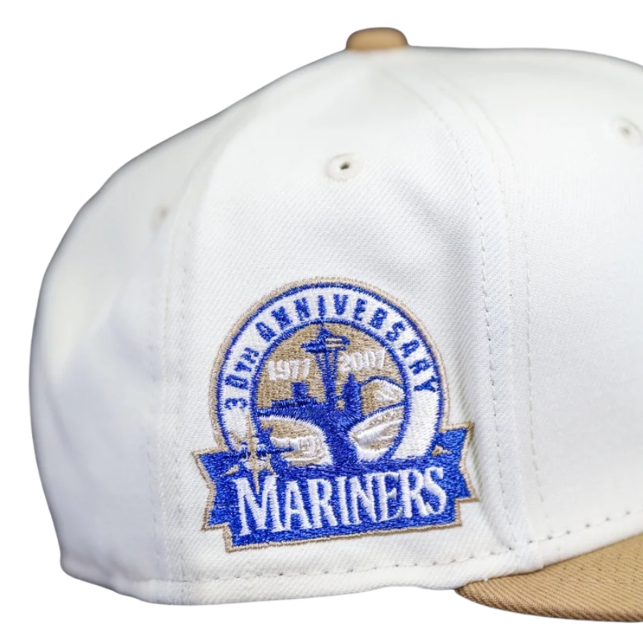 This Seattle Mariners fitted hat was released by Hat Stop. The fitted has a white six panel structured high crown and embroidered eyelets with a khaki fabric squatchee button. The fitted cap also has a khaki flat bill with a blue bottom undervisor. The front panel features the Seattle Mariners logo embroidery and an 30th Anniversary side patch embroidery on the right panel.