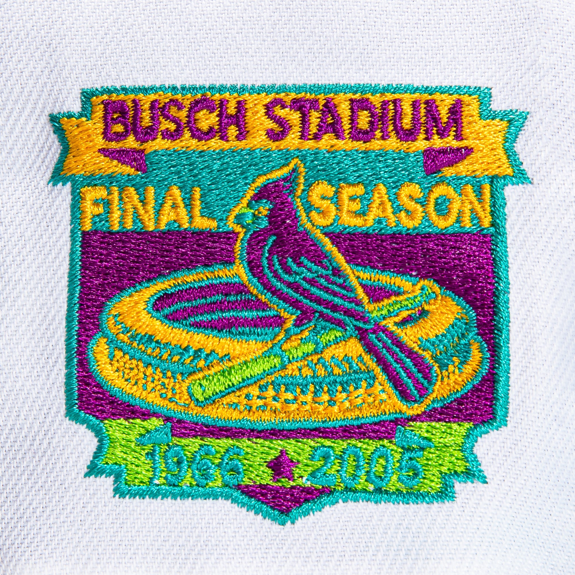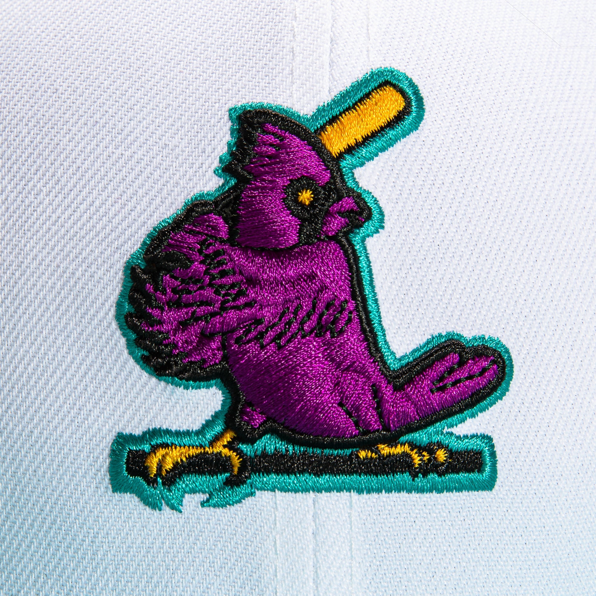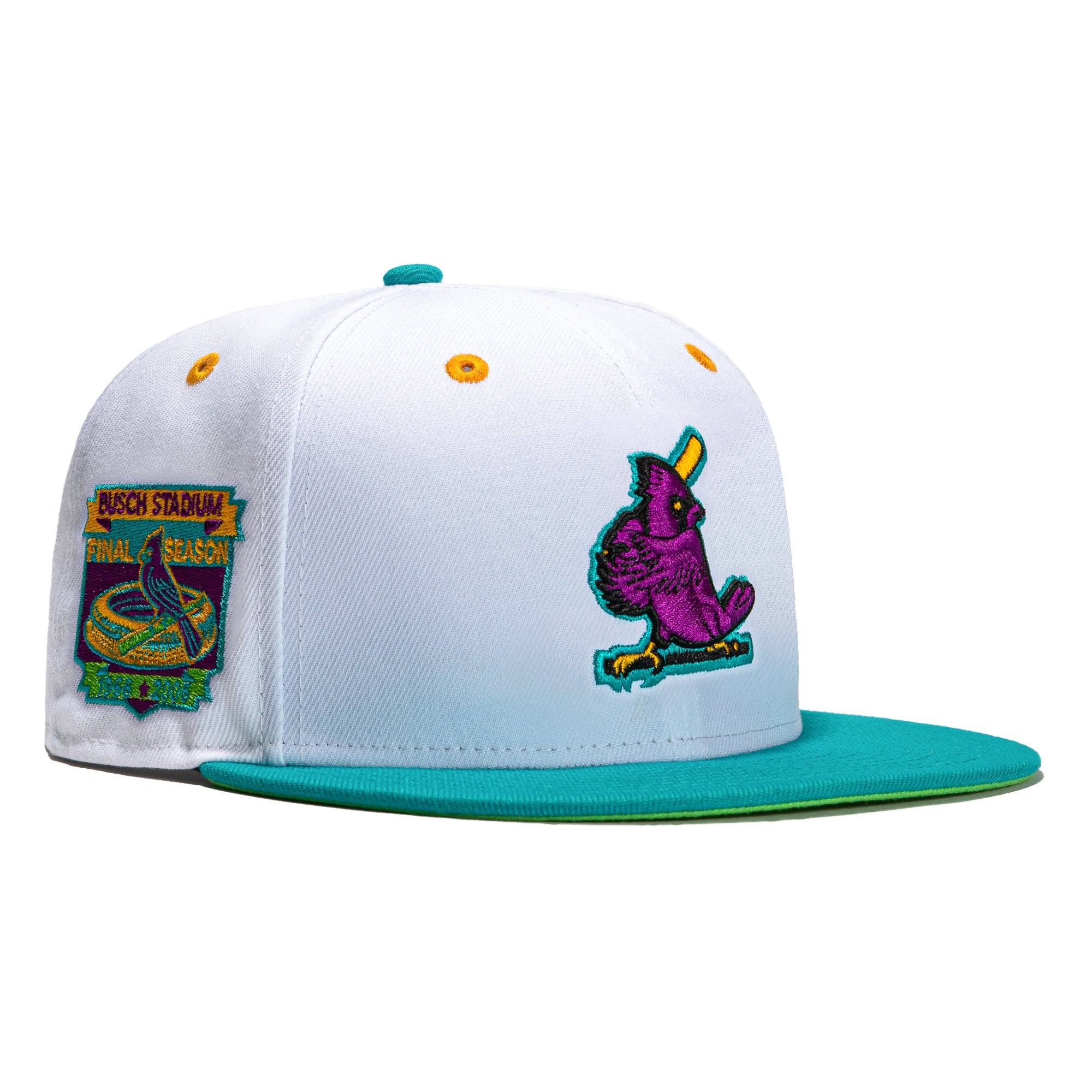 This New Era Dogtown St Louis Cardinals Final Season 59FIFTY Fitted Hat has a white six panel structured high crown and embroidered eyelets with a teal fabric squatchee button. The fitted cap has a teal flat bill with a lime green undervisor. The front panel features the St. Louis Cardinals logo embroidery and a side patch embroidery on the right panel. The left panel of the fitted displays the New Era logo and the official MLB logo embroidery on the rear crown.