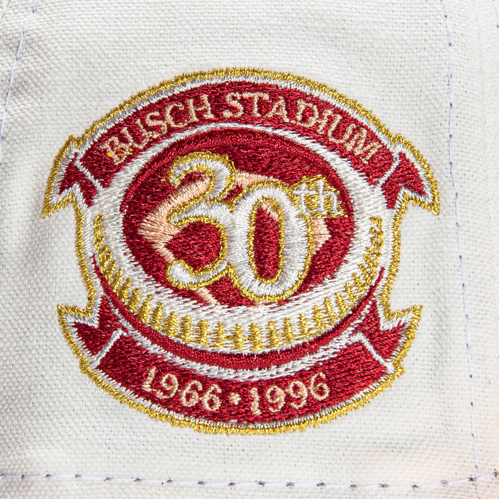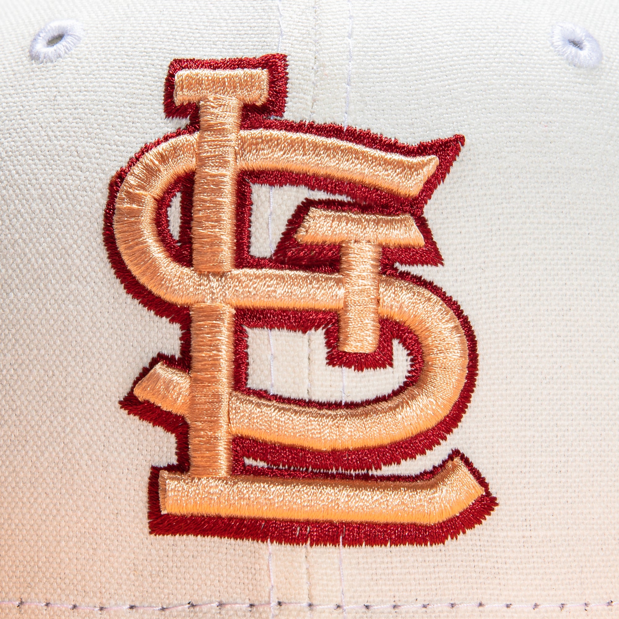 This New Era Monaco St. Louis Cardinals 30th Anniversary Stadium 59FIFTY Fitted Hat is a Hat Club exclusive. The fitted has a stone six panel structured high crown and embroidered eyelets with a peach fabric squatchee button. The fitted cap also has a peach flat bill with a maroon satin undervisor. The front panel features the St. Louis Cardinals logo embroidery and a 30th Anniversary side patch embroidery on the right panel. The left panel of the fitted displays the New Era logo and the official MLB logo embroidery on the rear crown.