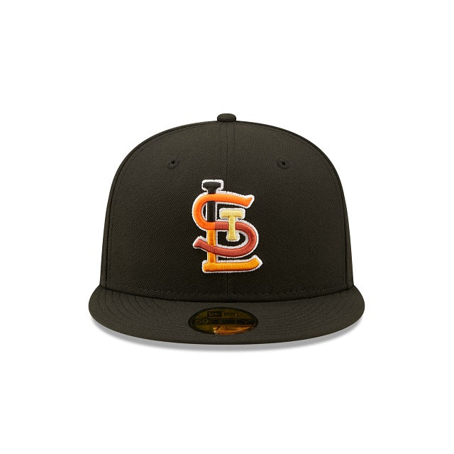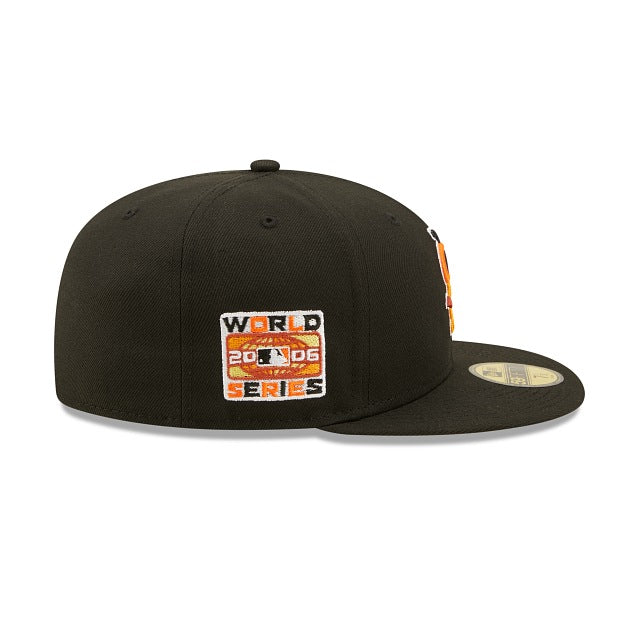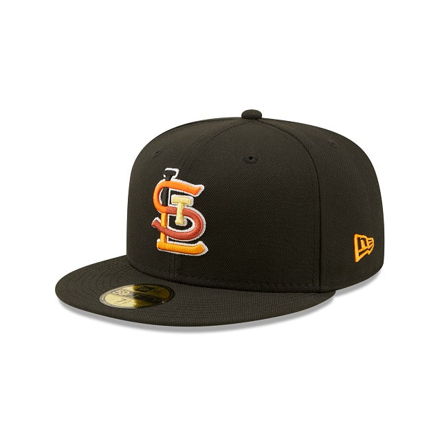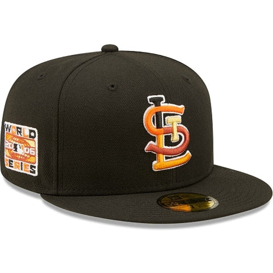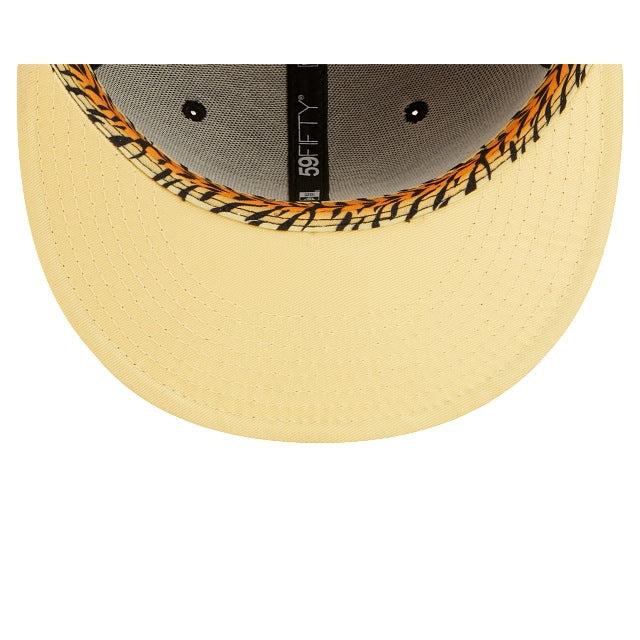 The St. Louis Cardinals Jungle 59FIFTY Fitted Cap features an embroidered Cardinals multi-colored logo at the front panels, a 2006 World Series patch at the right-wear side, and a matching MLB Batterman logo at the rear. Additional details include a tiger inspired striped inner sweatband and yellow undervisor.