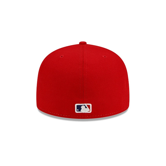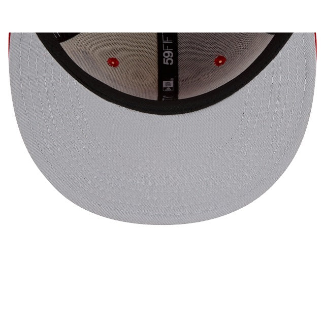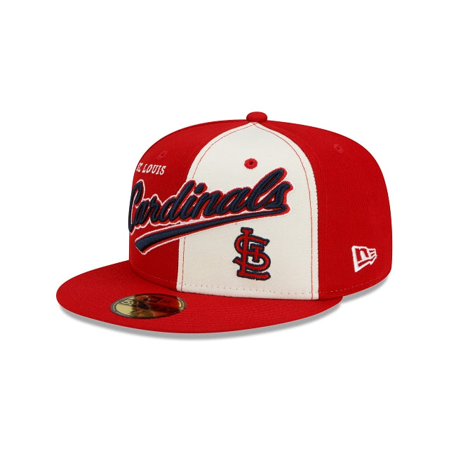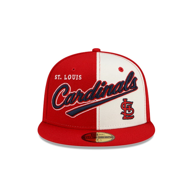 The St. Louis Cardinals Split Front 59FIFTY Fitted Cap features a two-tone fabrication with an embroidered Cardinals script at the front panels with a league specific patch at the right-wear side and the MLB Batterman logo at the rear.