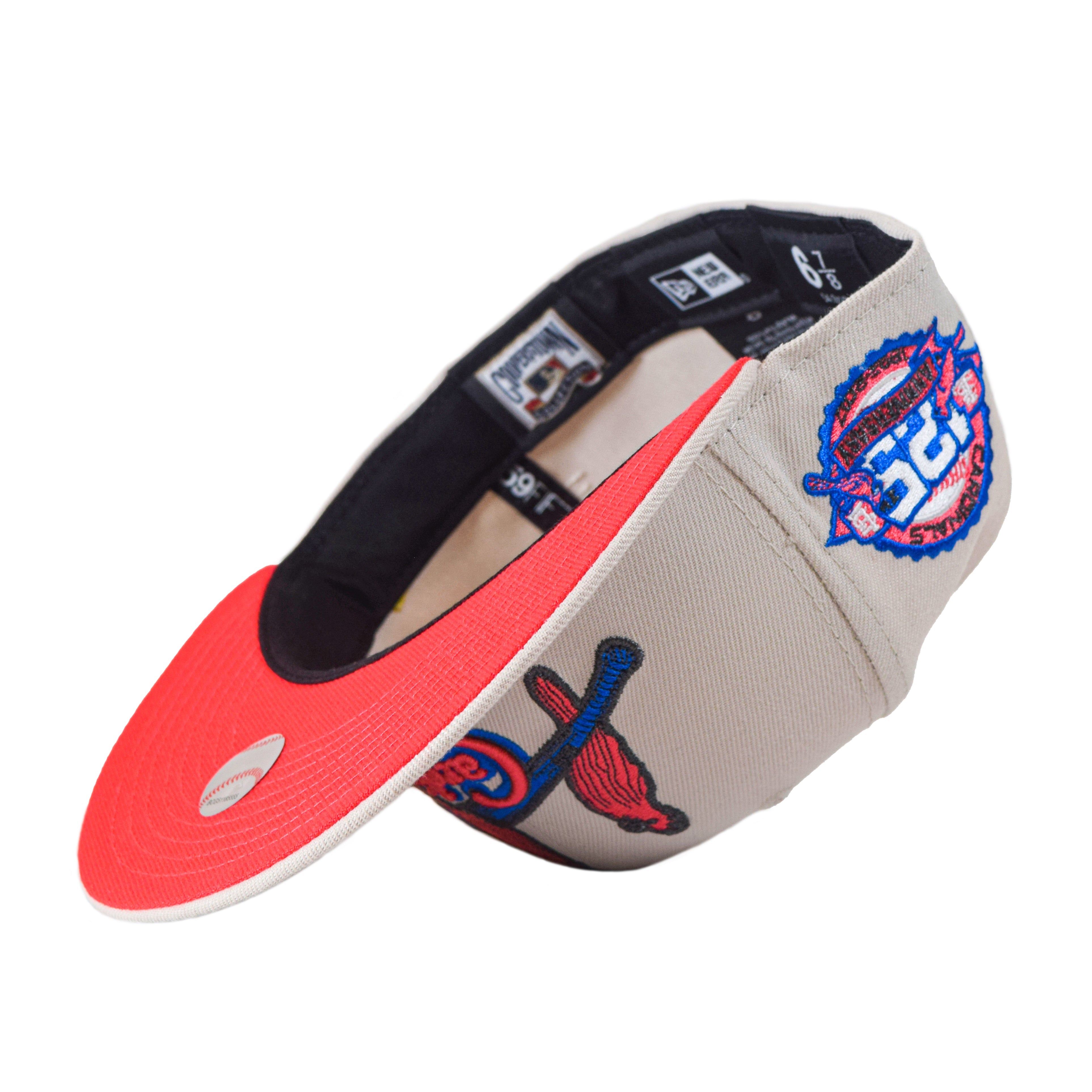 This New Era St. Louis Cardinals Stone 125th Anniversary Fluorescent Pink UV 59FIFTY Fitted Hat has a stone six panel structured high crown, embroidered eyelets with and fabric squatchee button. The fitted cap also has a stone flat bill with a fluorescent pink undervisor and black sweatband. The front panel features the St. Louis Cardinals logo embroidery and an Anniversary side patch embroidered on the right panel. The left panel of the fitted displays the New Era logo and the official MLB logo embroidery on the rear crown.