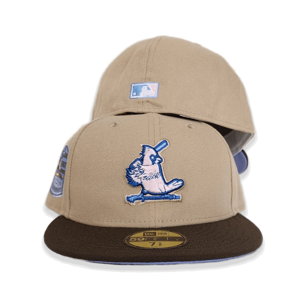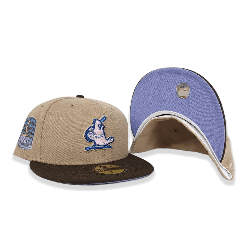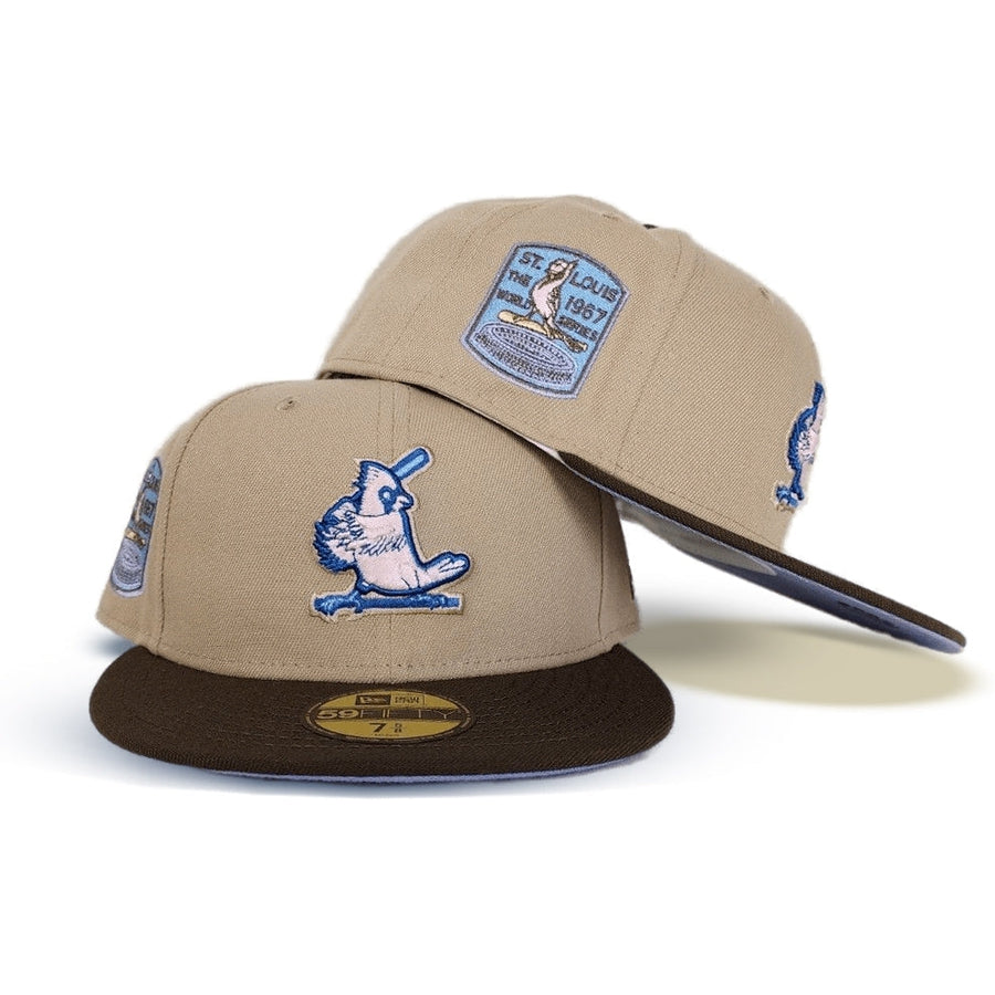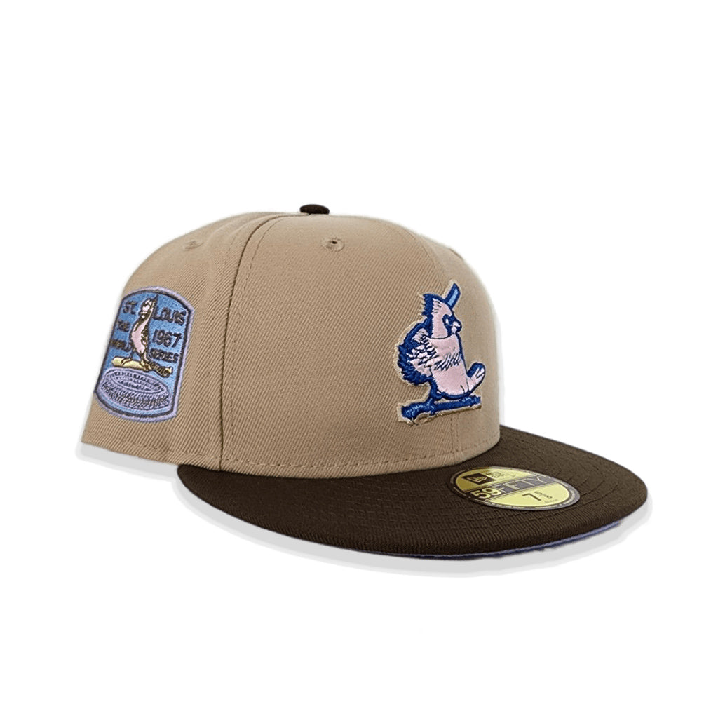 This New Era St. Louis Cardinals Tan/Brown 1967 World Series 59FIFTY Fitted Hat was released by EXclusive Fitted. The fitted cap features a tan six panel structured high crown and embroidered eyelets with a dark brown fabric squatchee button and flat bill. The fitted has a lavender undervisor and a white sweatband. The front panel includes the St. Louis Cardinals logo embroidery and the New Era logo embroidered on the left panel with a celebratory side patch on the right panel. The official MLB insignia is embroidered on the rear crown.