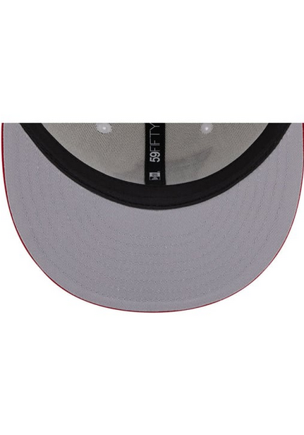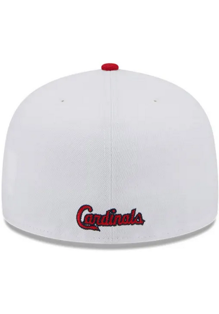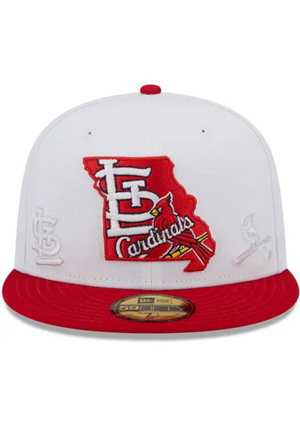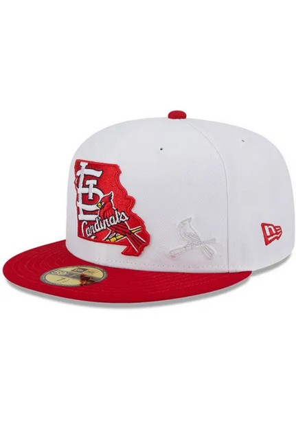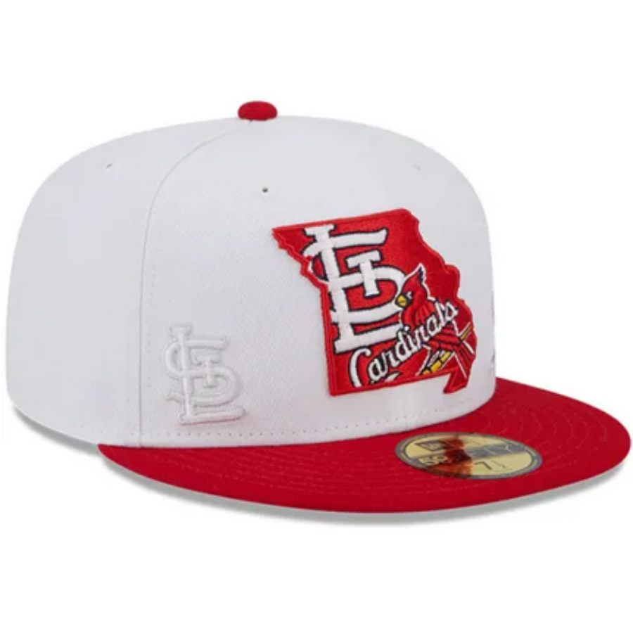 This New Era St. Louis Cardinals State 59FIFTY fitted hat has a white six panel structured high crown and embroidered eyelets with a red fabric squatchee button and flat bill. The front panel features the St. Louis Cardinals logo embroidered inside a state logo graphic.