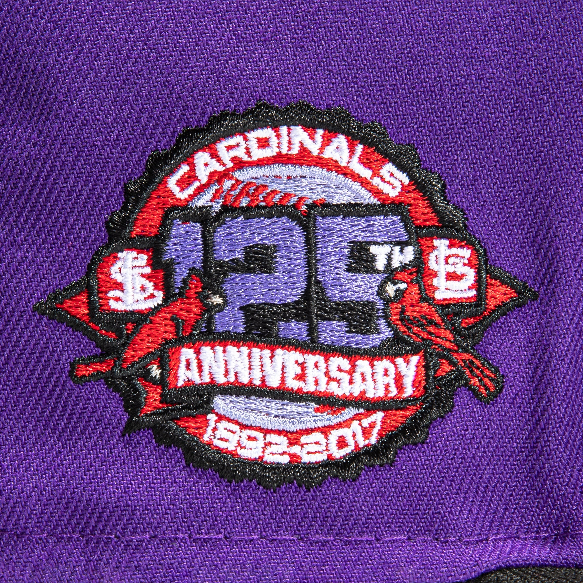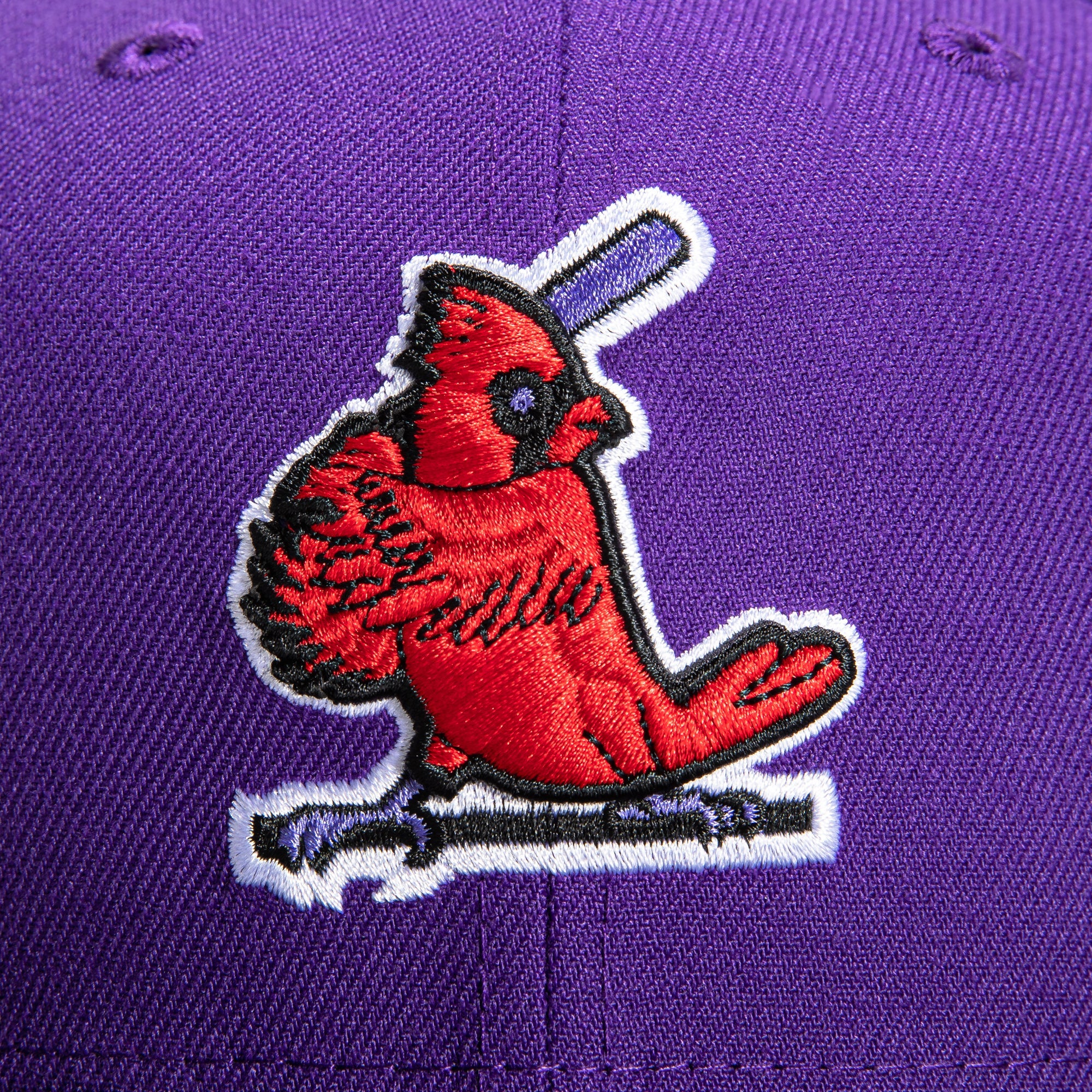 This New Era T-Dot St Louis Cardinals 1964 World Series 59FIFTY Fitted Hat is a Hat Club exclusive. It features a purple six panel structured high crown and embroidered eyelets with a black fabric squatchee button. The fitted cap has a black flat bill with a red undervisor. The front panel features the St. Louis Cardinals logo embroidery and a side patch embroidery on the right panel. The left panel of the fitted displays the New Era logo and the official MLB logo embroidery on the rear crown.