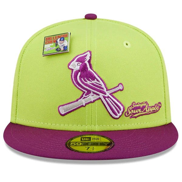 The MLB and Big League Chew have teamed up to bring St. Louis Cardinals fans this one of a kind, Swingin' Sour Apple Flavor Pack 59FIFTY Fitted Hat. Featuring a high crown and flat bill, this New Era hat will take your game day look to the next level. Its classic and fun graphics combine your St. Louis Cardinals and your all-time favorite Big League Chew flavor, making it unlike anything else in your collection.