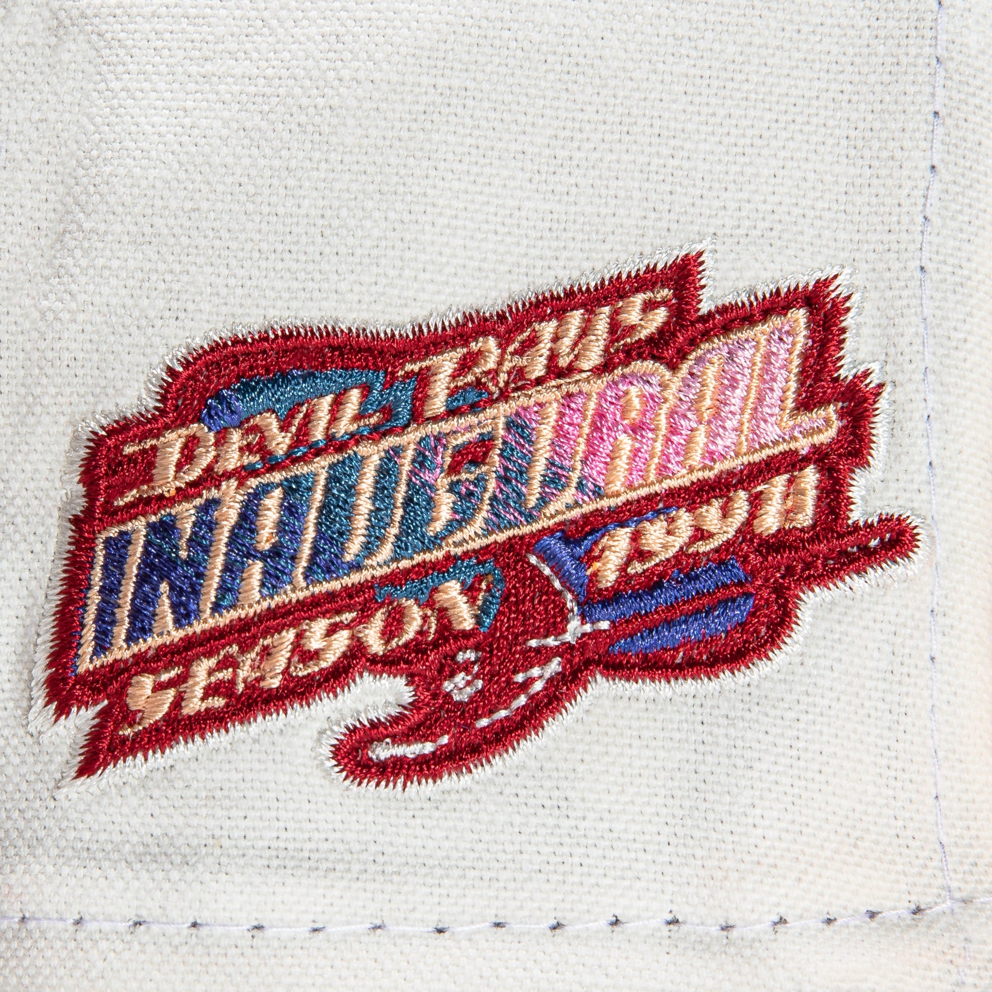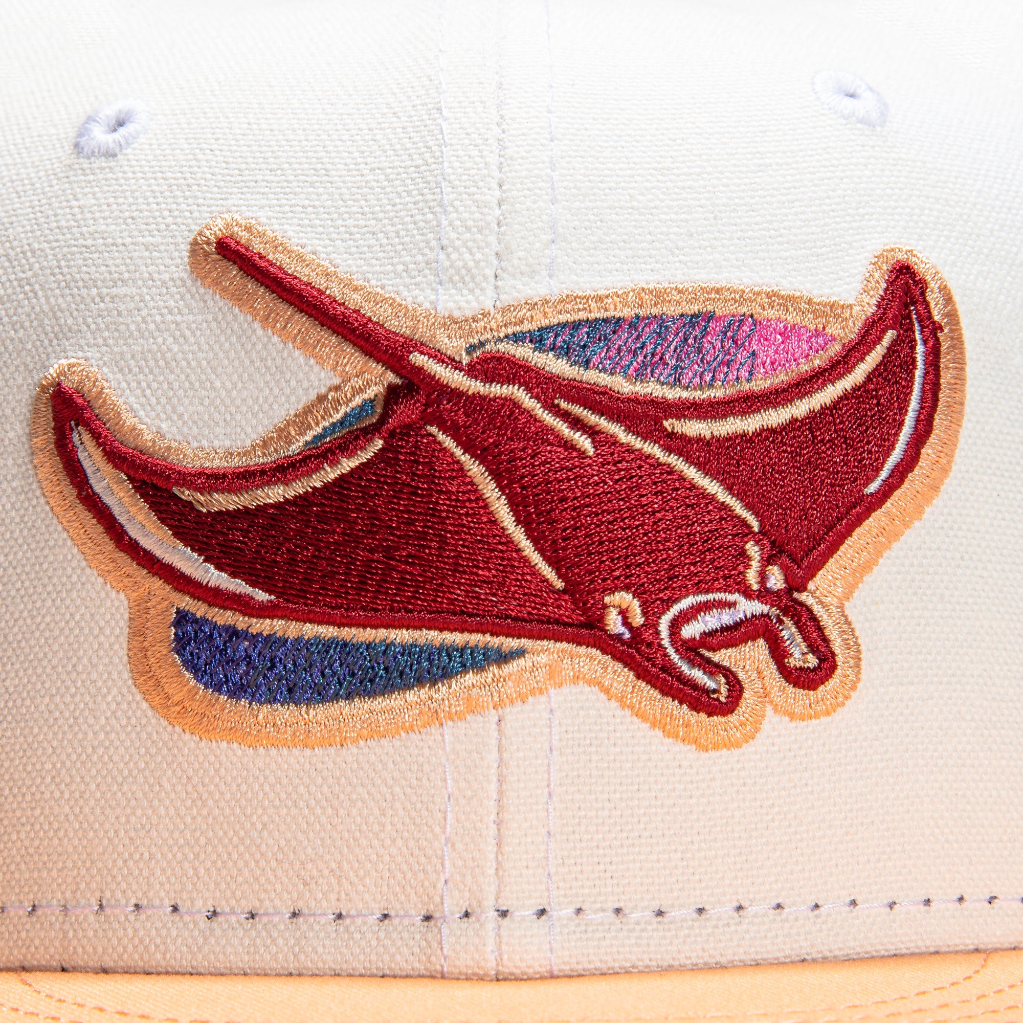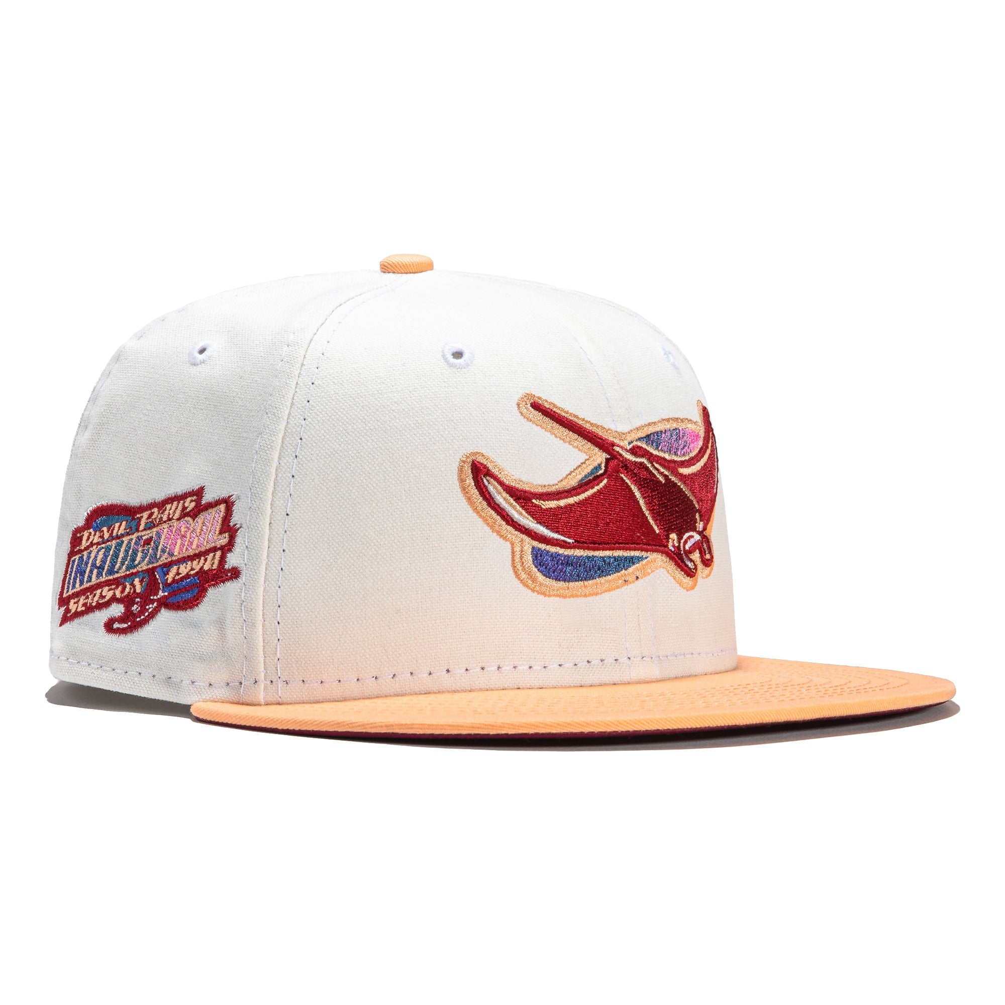 This New Era Monaco Tampa Bay Rays Inaugural 59FIFTY Fitted Hat is a Hat Club exclusive. The fitted has a stone six panel structured high crown and embroidered eyelets with a peach fabric squatchee button. The fitted cap also has a peach flat bill with a maroon satin undervisor. The front panel features the Tampa Bay Rays logo embroidery and a Inaugural Season side patch embroidery on the right panel. The left panel of the fitted displays the New Era logo and the official MLB logo embroidery on the rear crown.