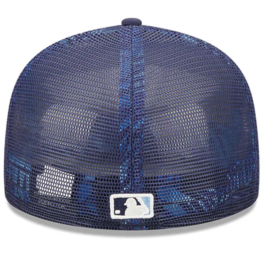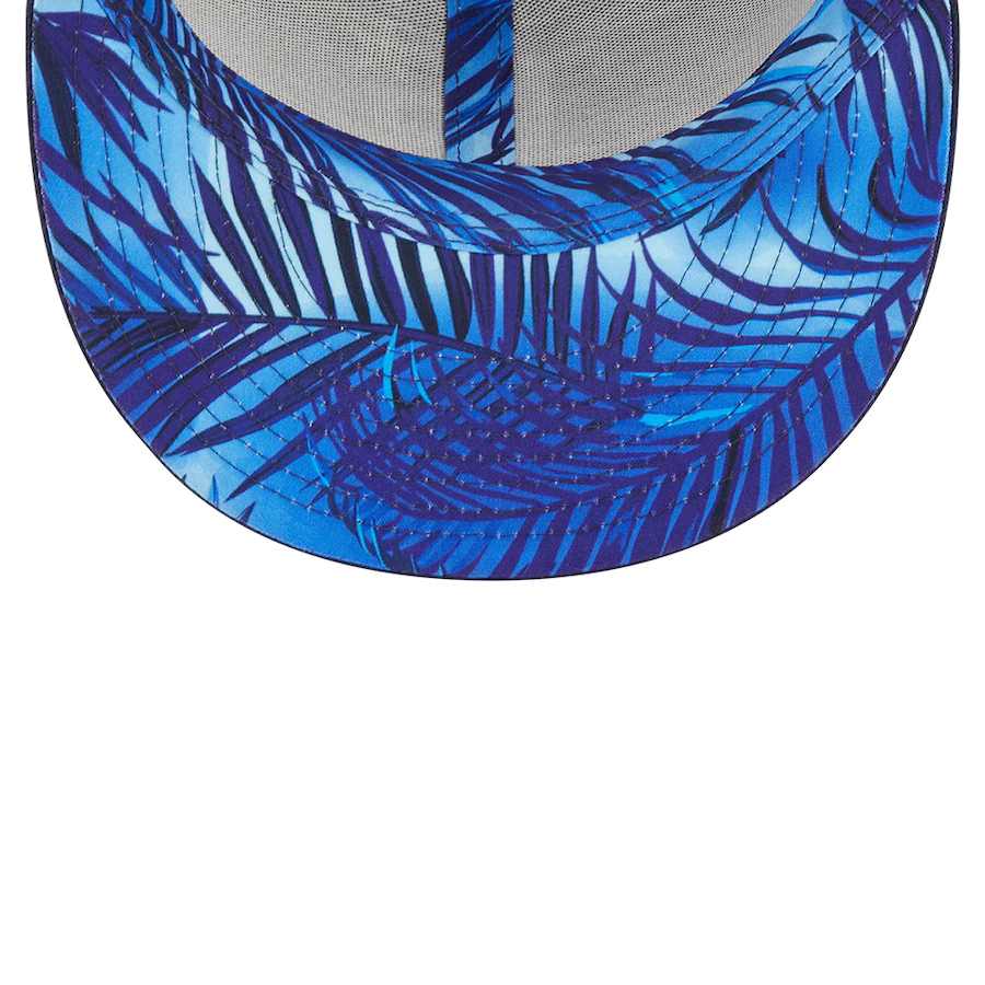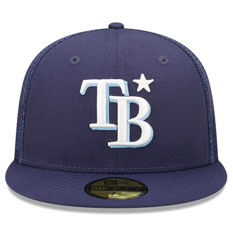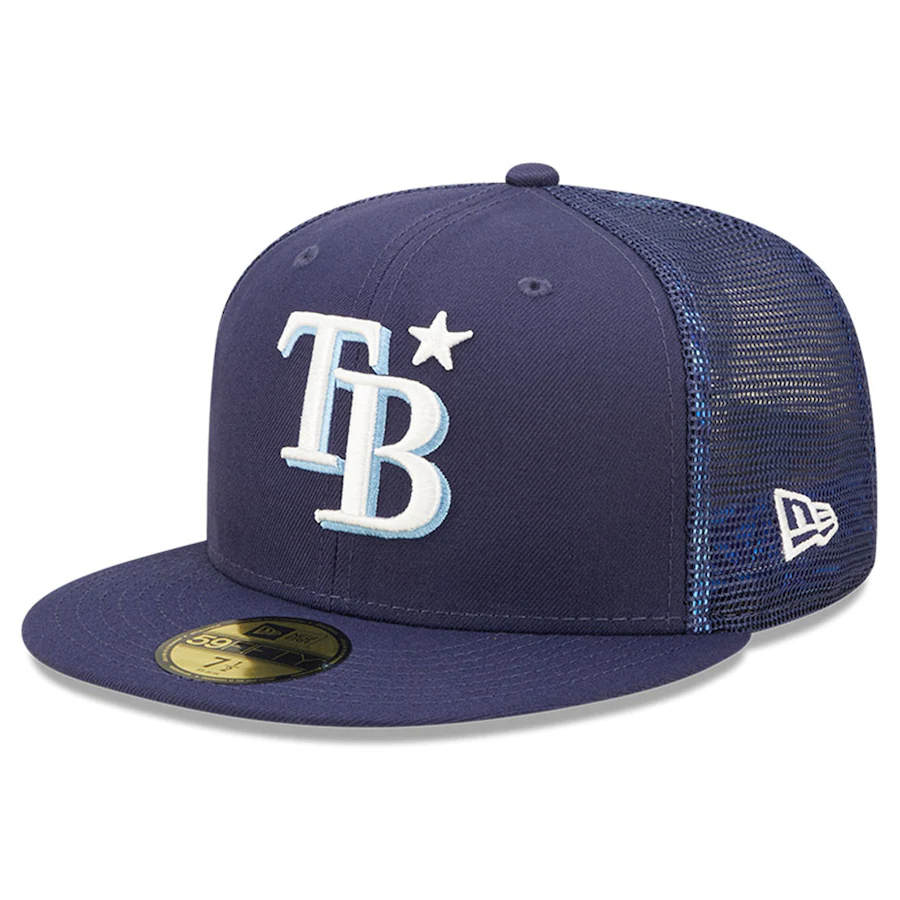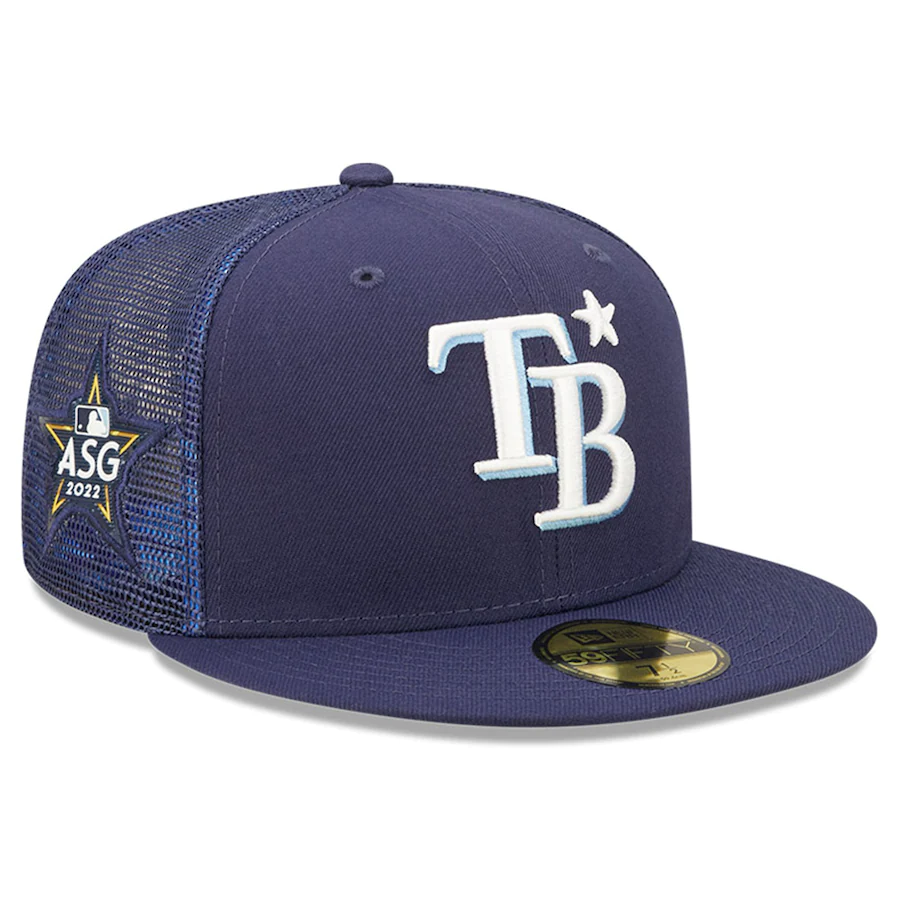 The Tampa Bay Rays 2022 All-Star Game Workout 59FIFTY Fitted Cap features an embroidered Rays logo at the front panels with a 2022 All-Star Game patch at the right-wear side. Additional details include a matching MLB Batterman logo at the rear and a blue palm leaf undervisor.