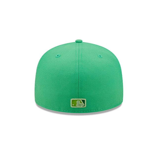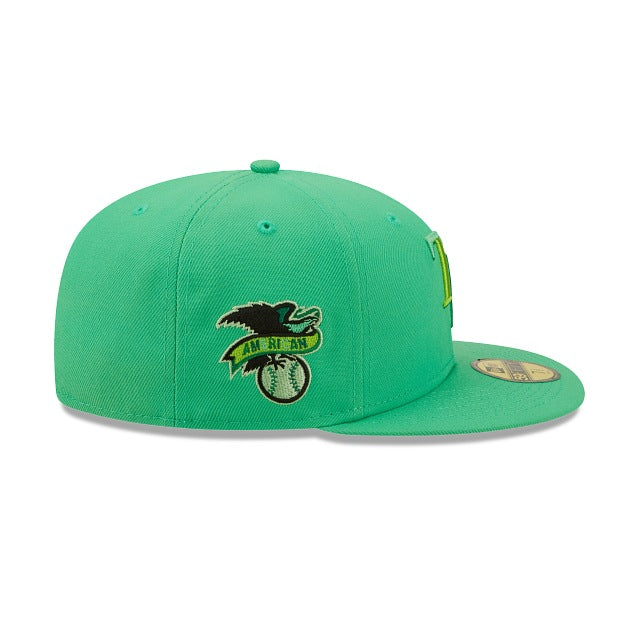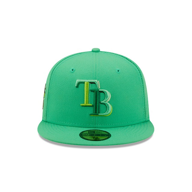 The Tampa Bay Rays Snakeskin 59FIFTY Fitted Cap features an embroidered Rays multi-colored logo at the front panels, an American League patch at the right-wear side, and a matching MLB Batterman logo at the rear. Additional details include a snakeskin inspired inner sweatband and green undervisor.