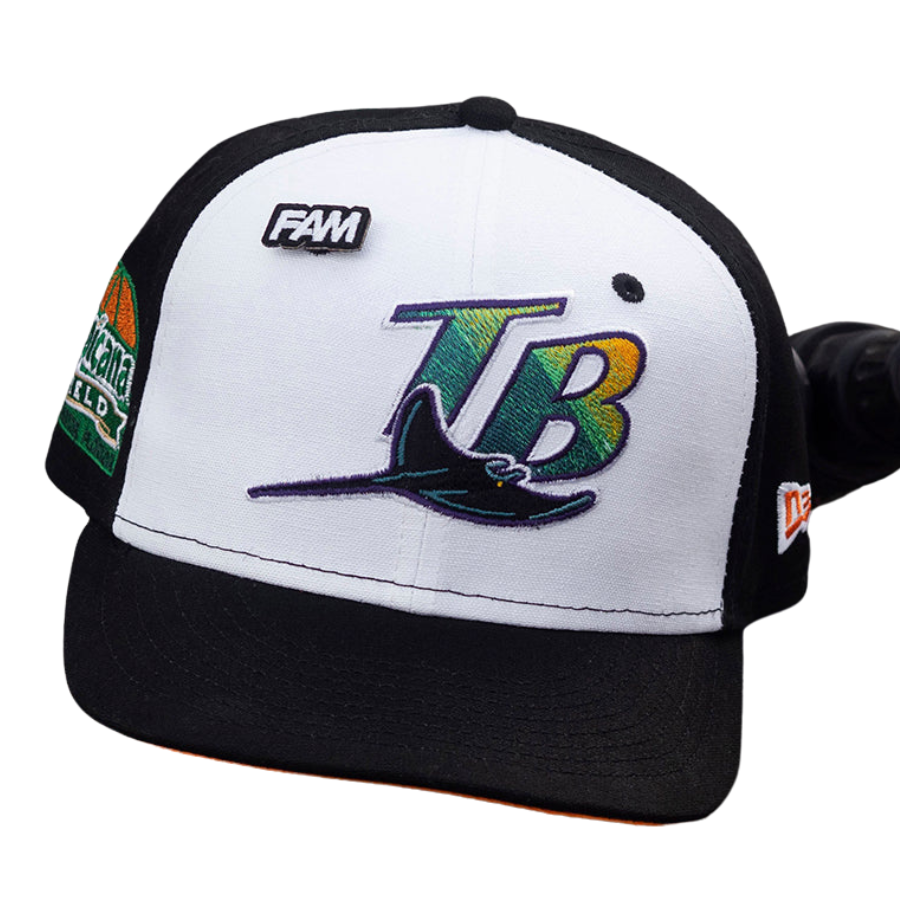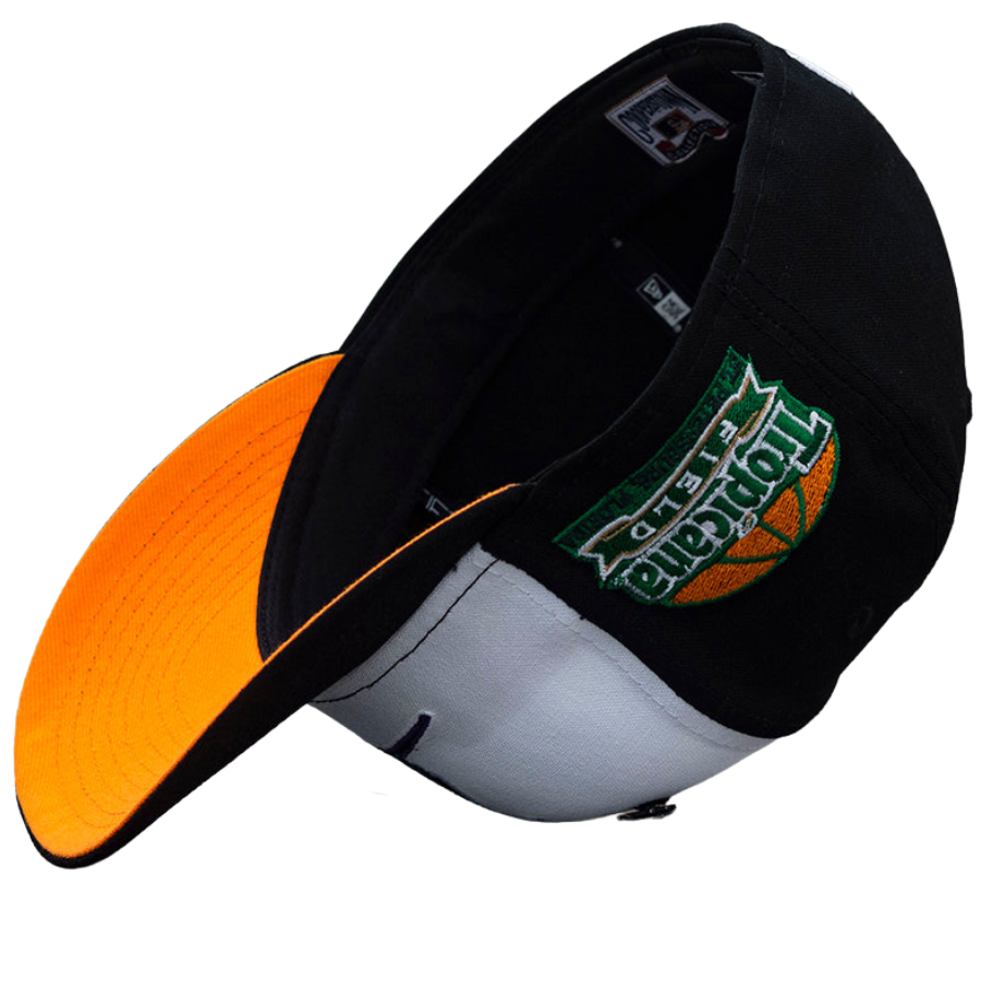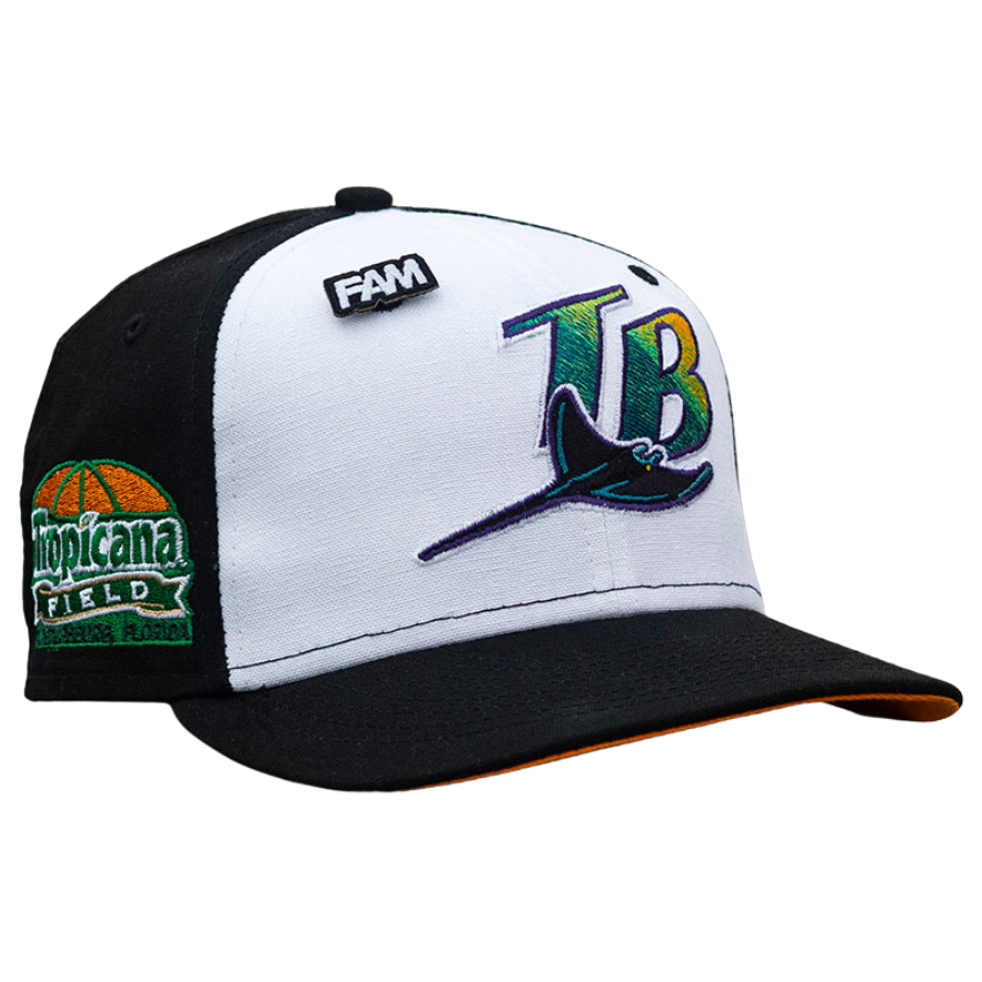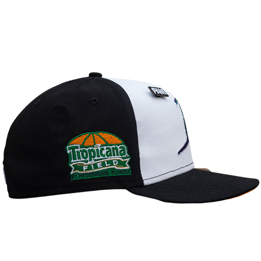 This New Era Tampa Bay Rays Tropicana Field Cotton Canvas 59FIFTY fitted cap has a two-tone black and white six panel structured high crown. The flat bill of the cap is black with a orange undervisor and a Tropicana Field side patch embroidery on the right-wear side.
