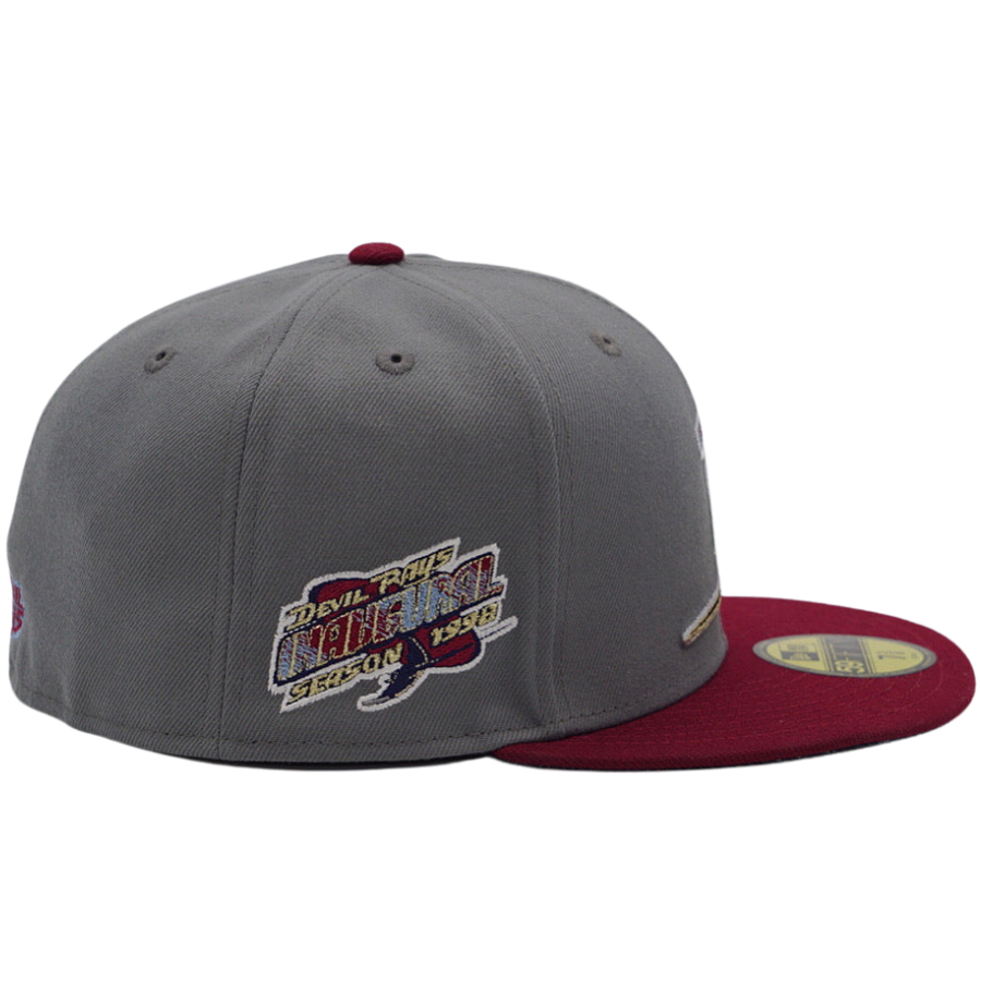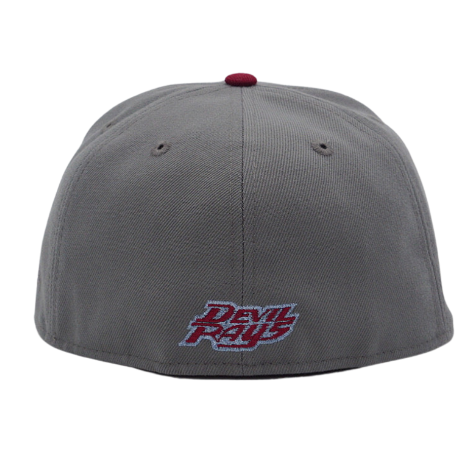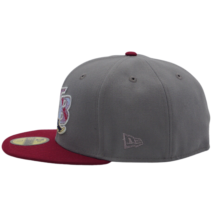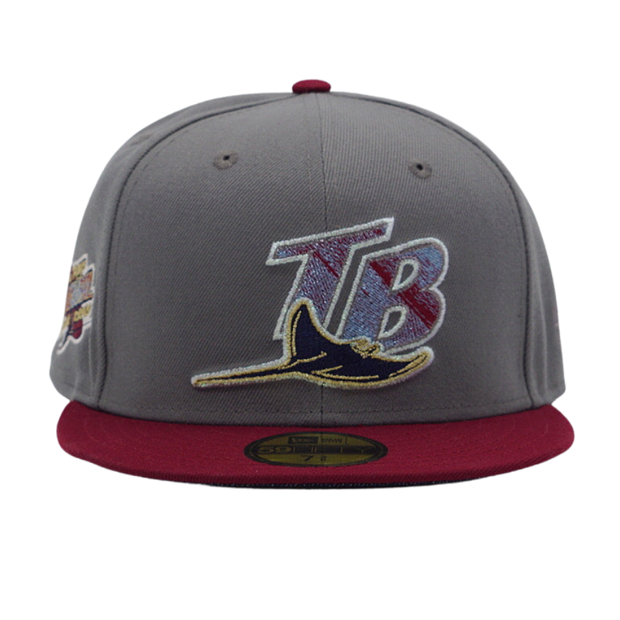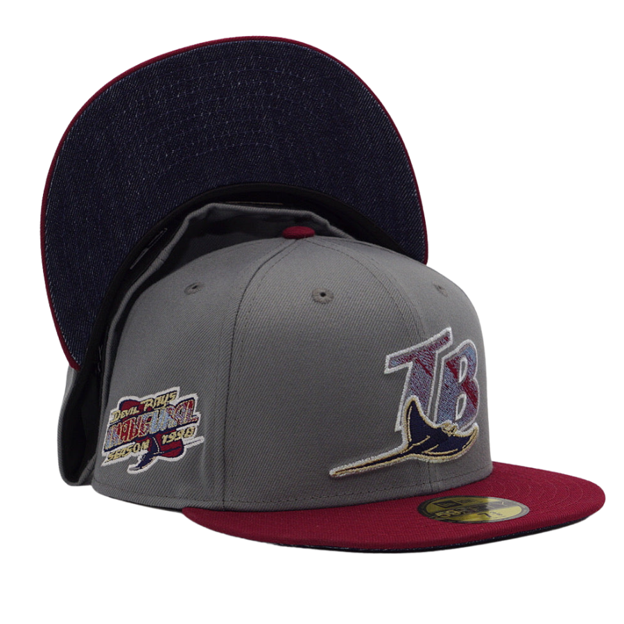 This Tampa Bay Rays 59FIFTY fitted hat was released by Fresh Rags. The fitted has a storm grey six panel structured high crown, embroidered eyelets with a maroon fabric squatchee button and flat brim. The fitted cap also has a denim bottom undervisor with a black sweatband. The front panel features the Tampa Bay Rays logo embroidery with an Inaugural side patch on the right-wear side. The left-wear side of the fitted displays the New Era logo and the official MLB Batterman embroidery on the rear-crown.