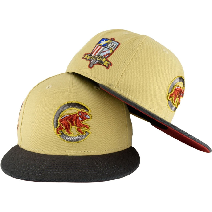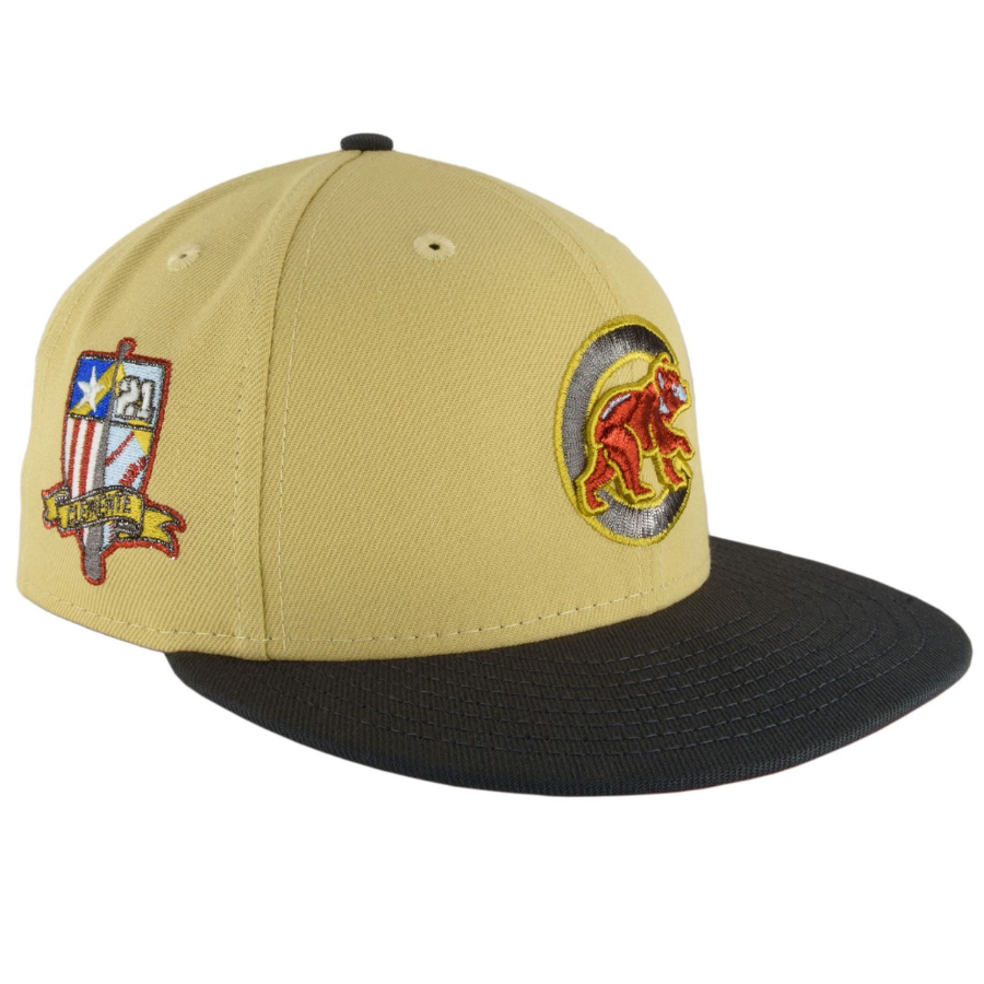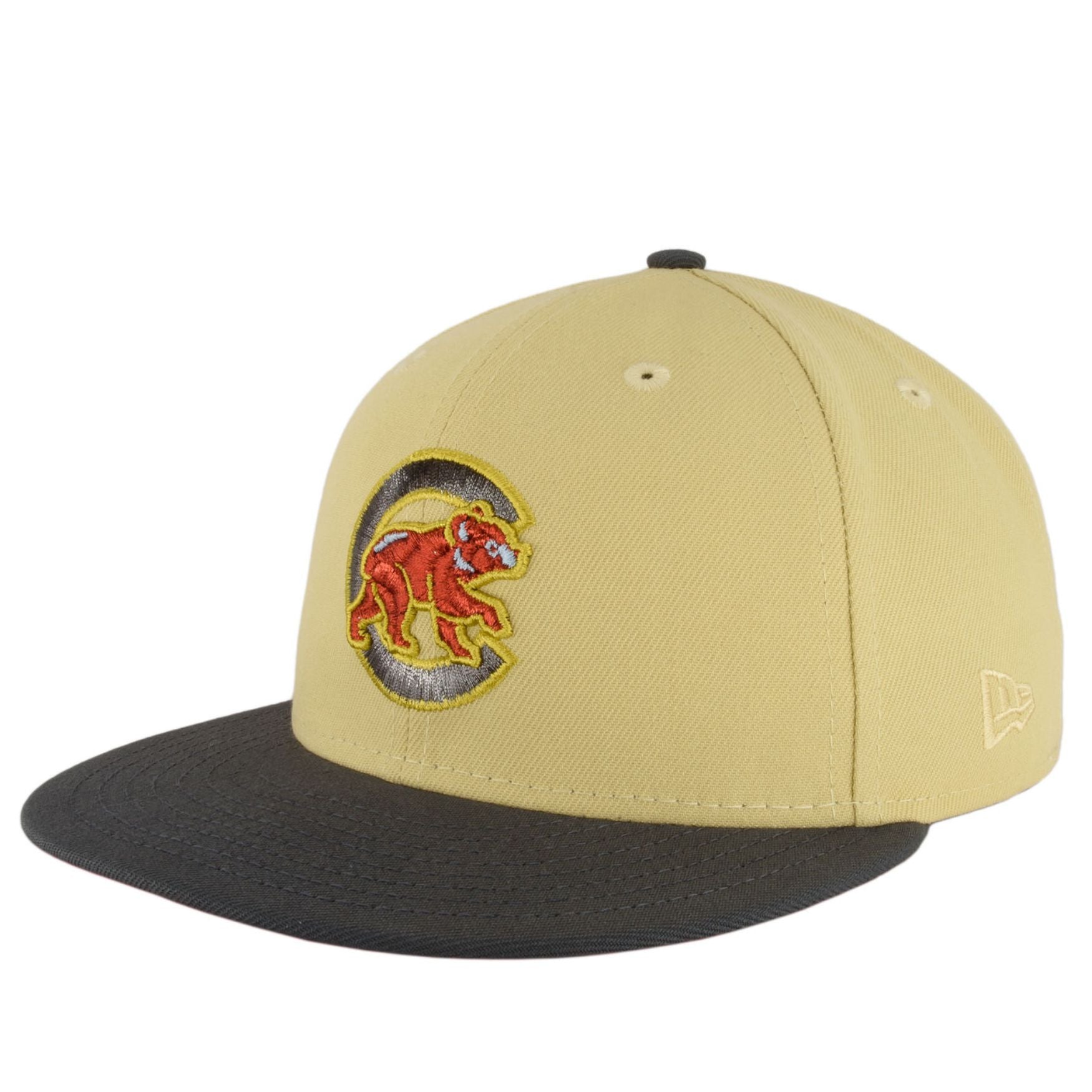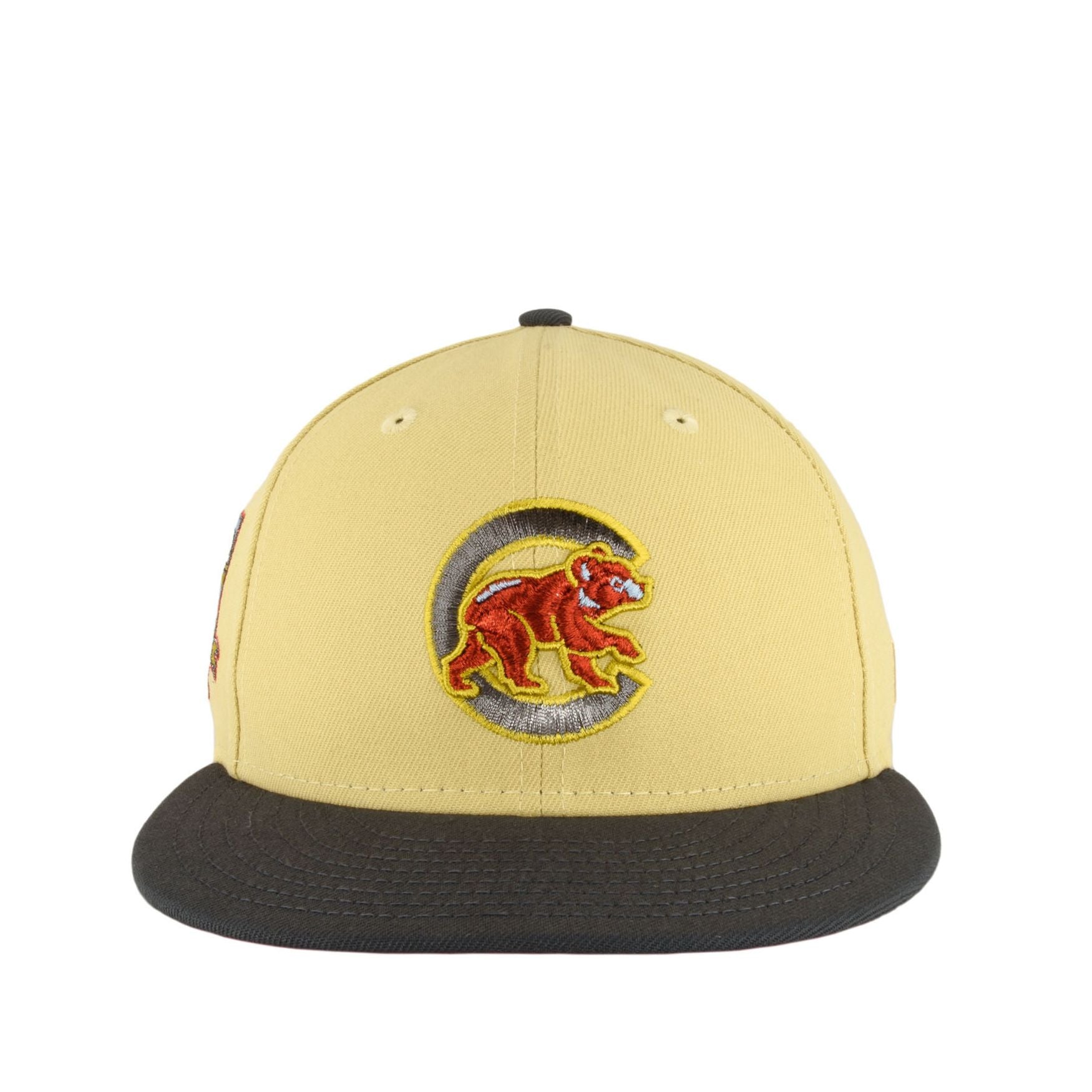 This Chicago Cubs fitted hat was released by Clark Street Sports. The fitted has a vegas gold six panel structured high crown and embroidered eyelets with a black fabric squatchee button. The flat bill of the cap is black with a burgundy undervisor and black sweatband. The front panel features the Chicago Cubs logo embroidery and a side patch embroidery on the right panel. The left panel of the fitted displays the New Era logo and the official MLB Batterman logo embroidery on the rear crown.