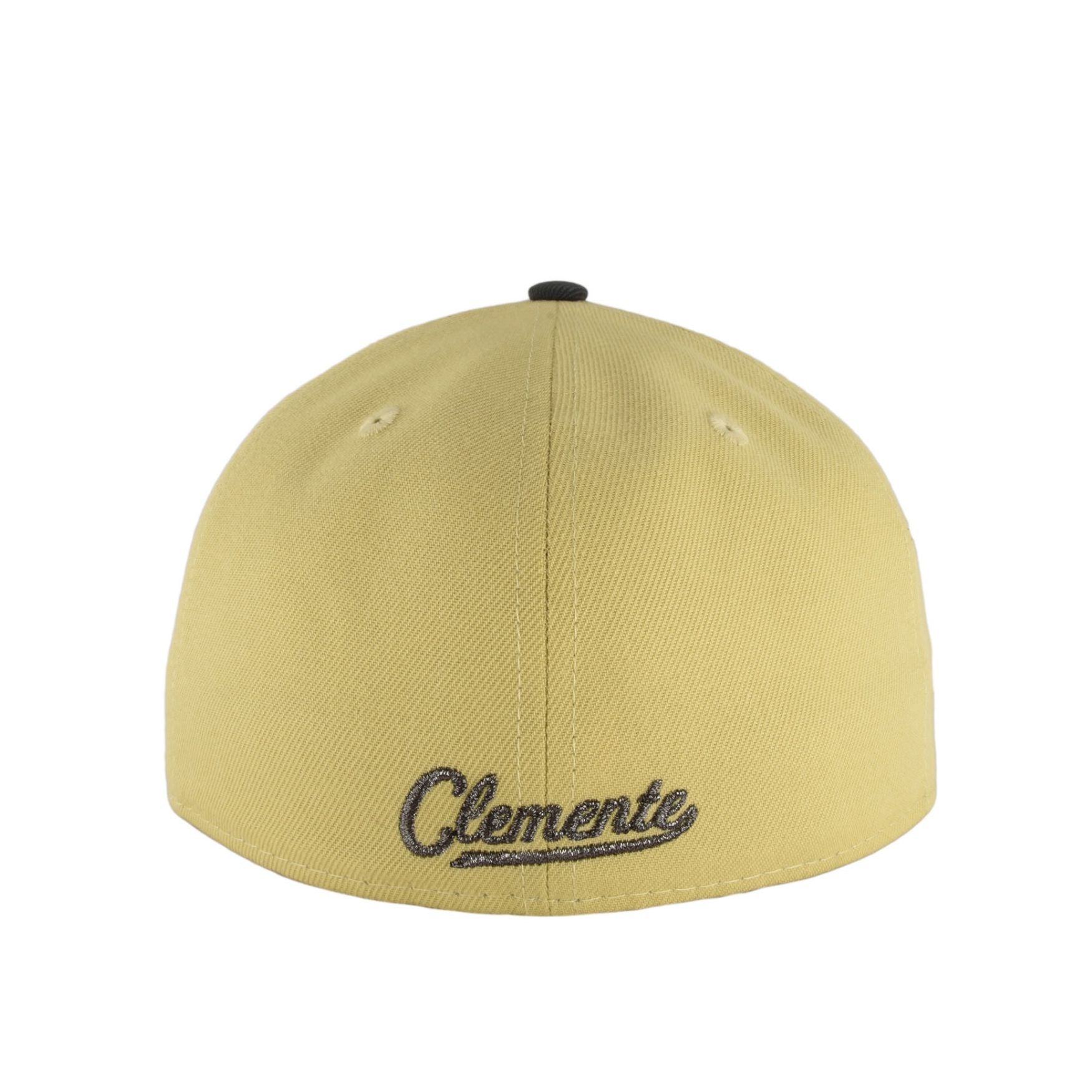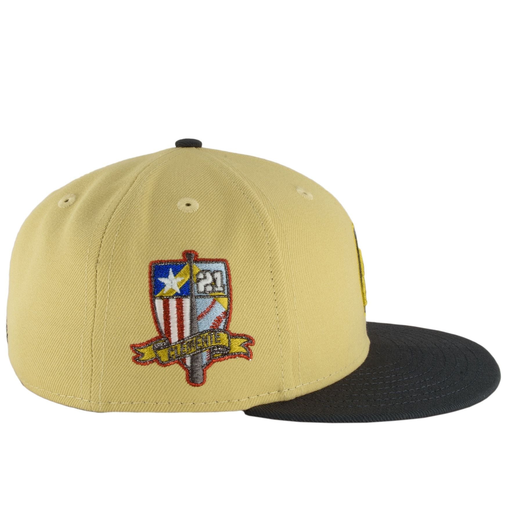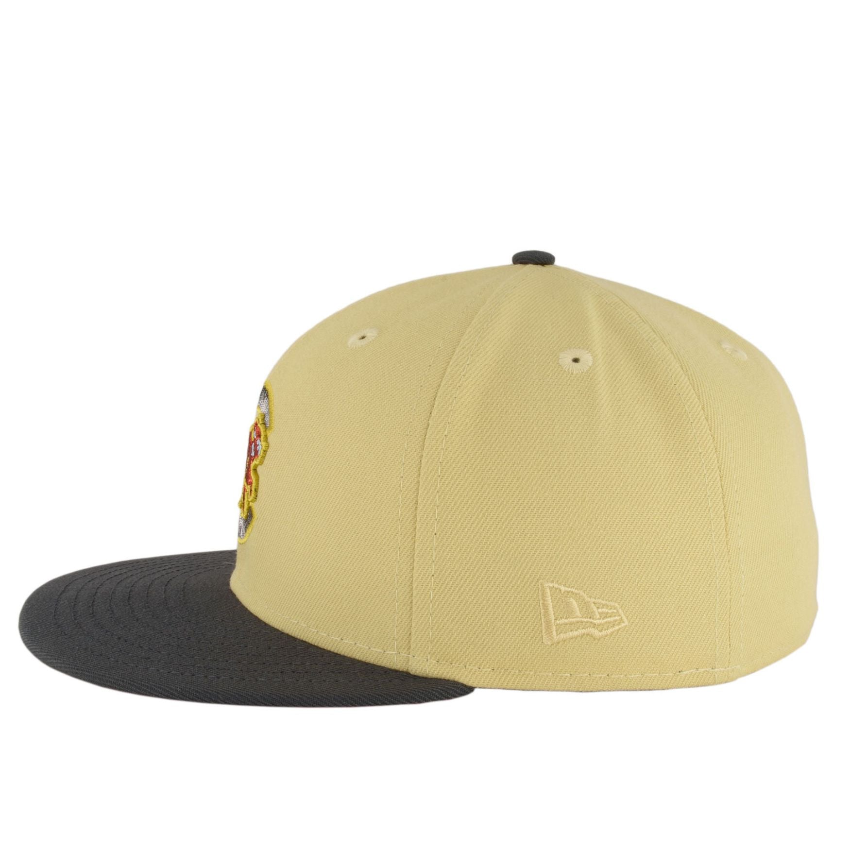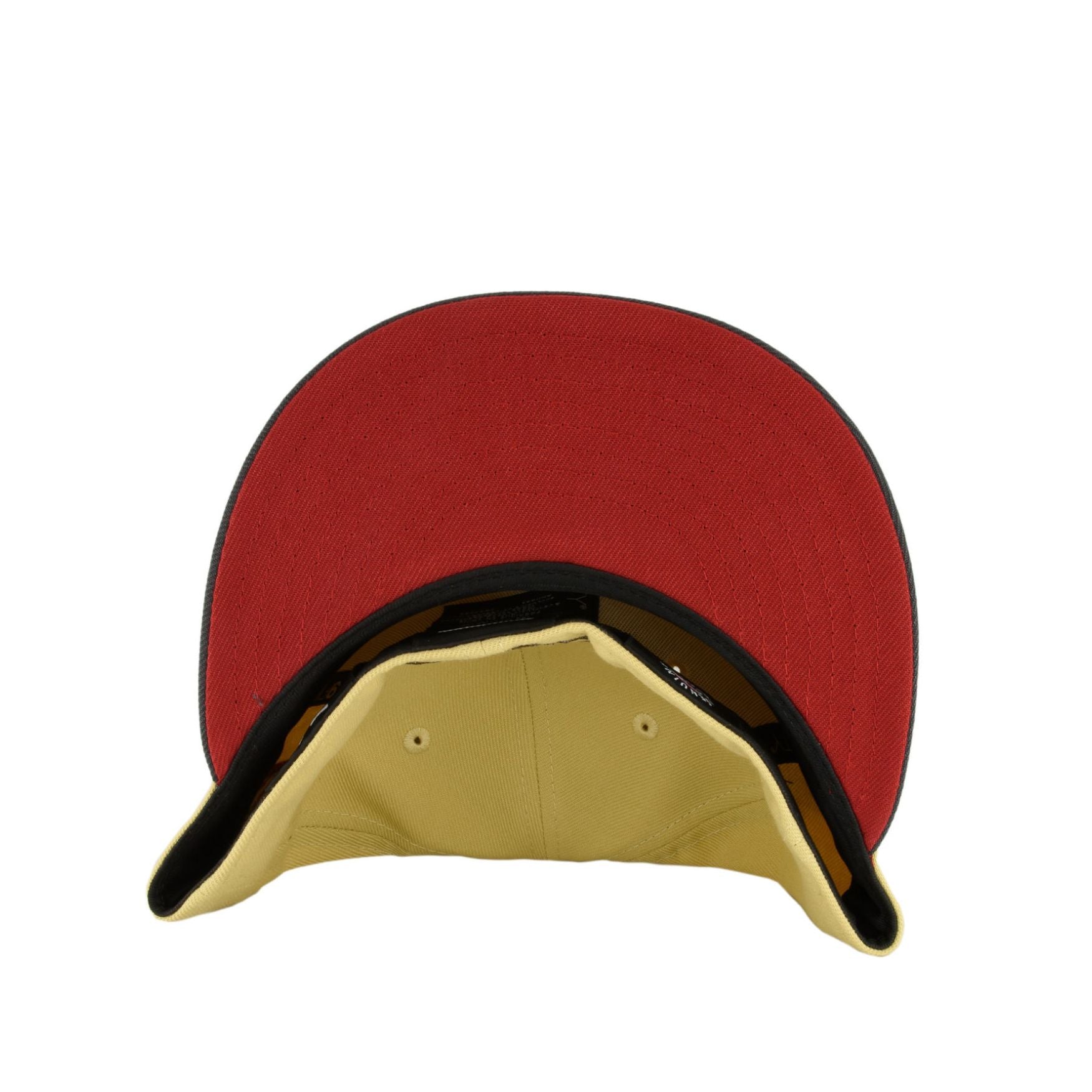 This Chicago Cubs fitted hat was released by Clark Street Sports. The fitted has a vegas gold six panel structured high crown and embroidered eyelets with a black fabric squatchee button. The flat bill of the cap is black with a burgundy undervisor and black sweatband. The front panel features the Chicago Cubs logo embroidery and a side patch embroidery on the right panel. The left panel of the fitted displays the New Era logo and the official MLB Batterman logo embroidery on the rear crown.