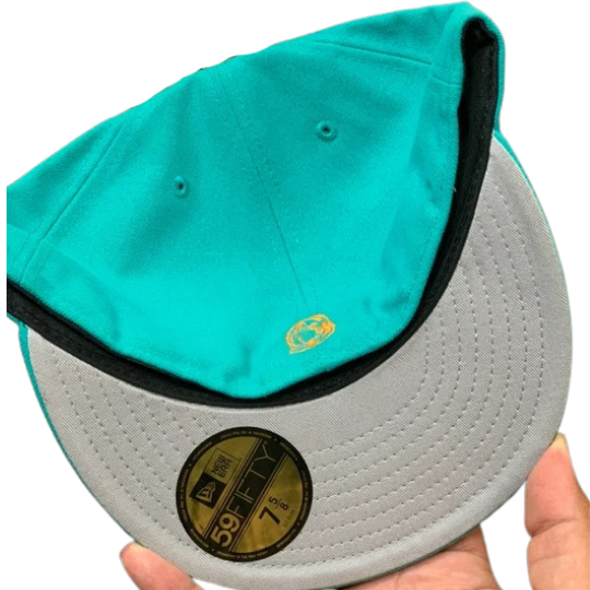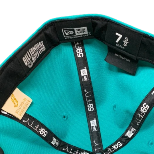 Billionaire Boys Club 59FIFTY fitted hat has a teal and gold colorway. The structured six panel high crown, embroidered eyelets and fabric squatchee button are teal. The flat bill of the fitted cap is also teal with a grey bottom undervisor and black sweatband. The front panel features the script "Billionaire Boys Club" on a jumping trout in gold thread. The back of the crown features the Billionair Boys Club official astronaut logo embroidered in gold thread.